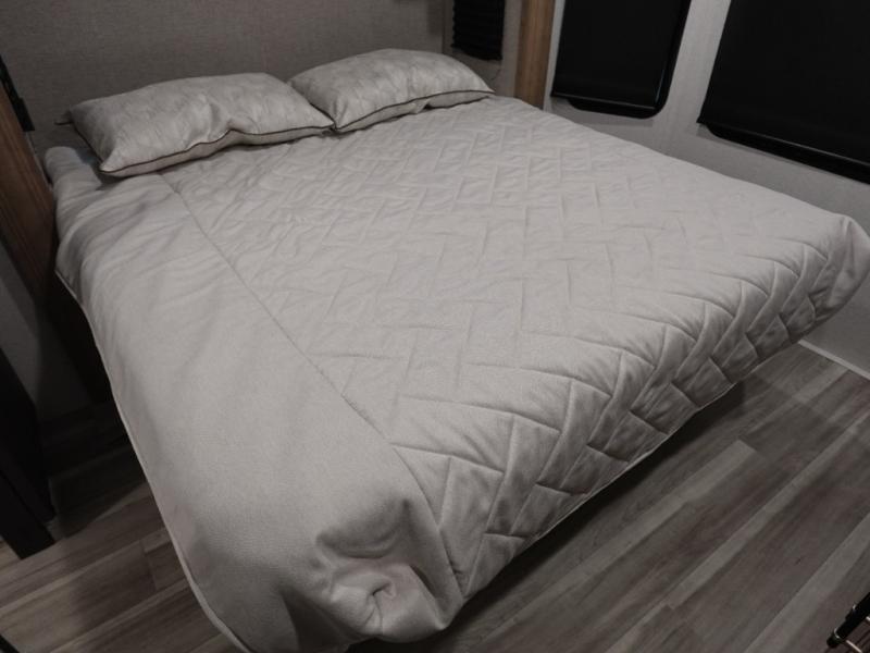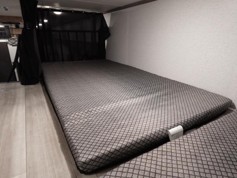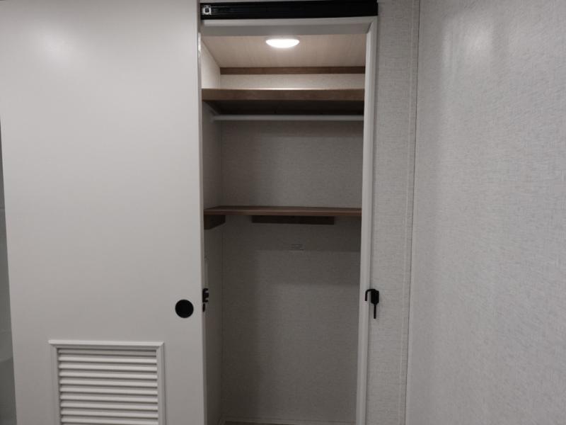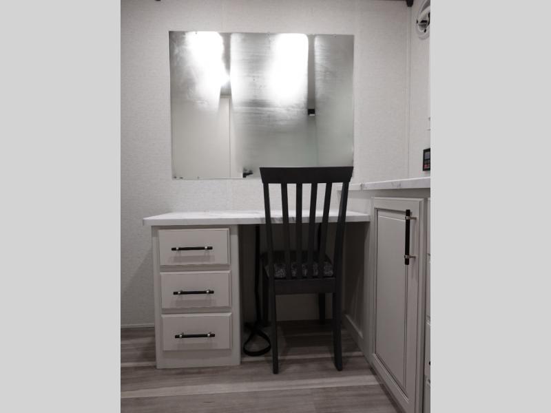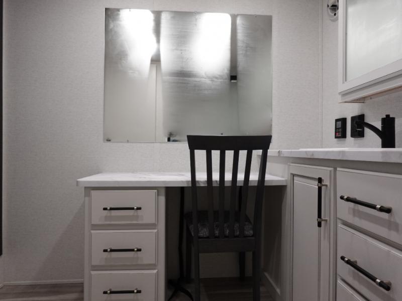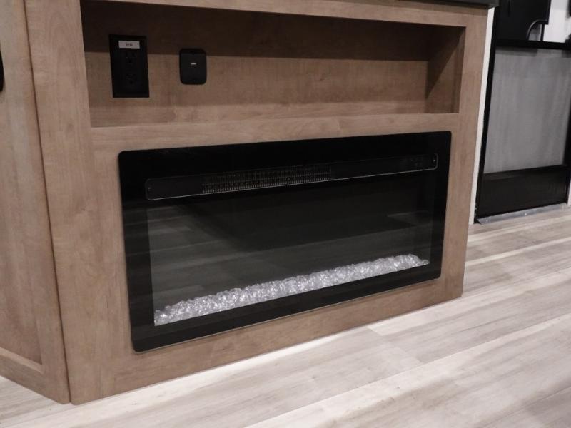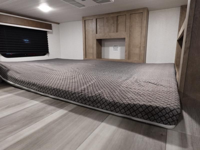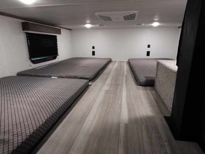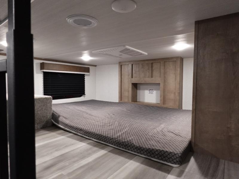 This destination trailer is a home away from home where comfort, relaxation, and entertainment come together in perfect harmony. The rear bathroom is a serene oasis, featuring washer and dryer prep, dual sink, and makeup vanity. Above, the loft area offers a cozy bunk mat, storage shelves, and an entertainment center - perfect for kids or guests. The living area is designed for relaxation and entertainment, featuring a comfortable sectional sofa, entertainment center, and warm fireplace. The kitchen is a gourmet's paradise, boasting a refrigerator, pantry, three-burner cooktop, kitchen island with chairs, and spacious pantry. The front bedroom is a peaceful retreat, complete with a half bath, overhead cabinets, a king bed, a wardrobe, and a dresser. Above, the loft area offers three bunk mats - perfect for kids or guests. Outside, enjoy the shade and protection of our 26' awning and convenient access via two entry/exit doors.