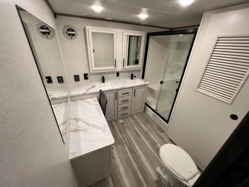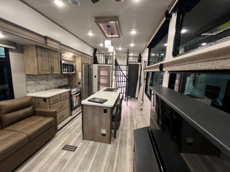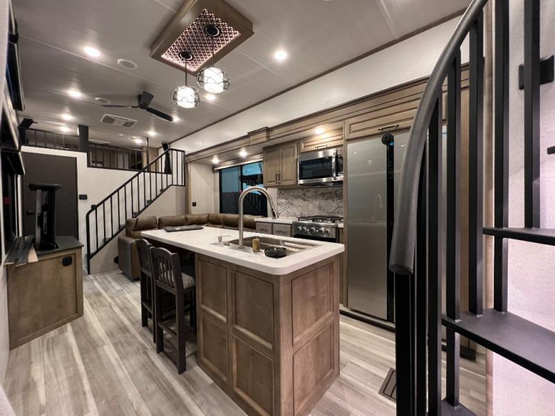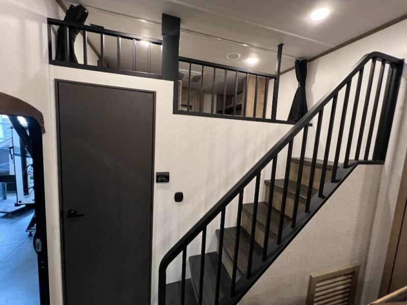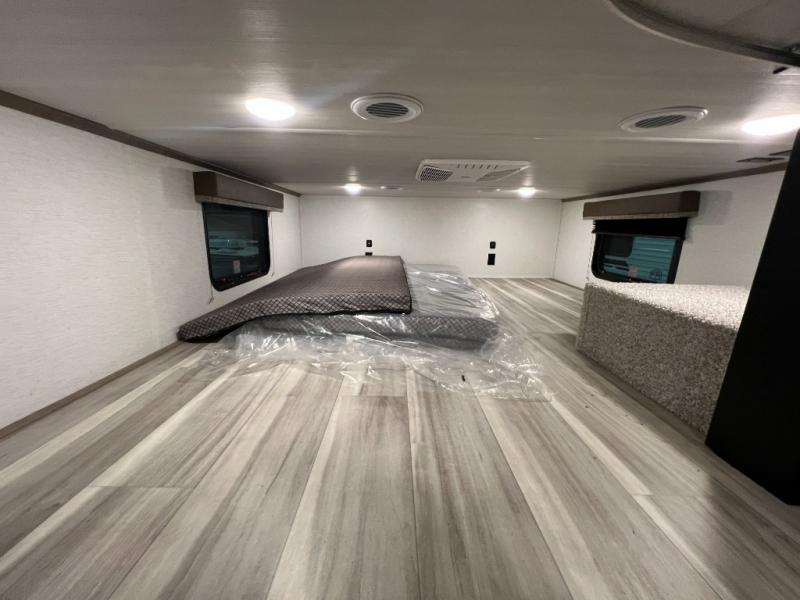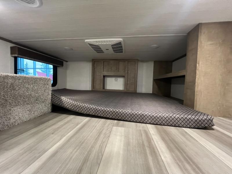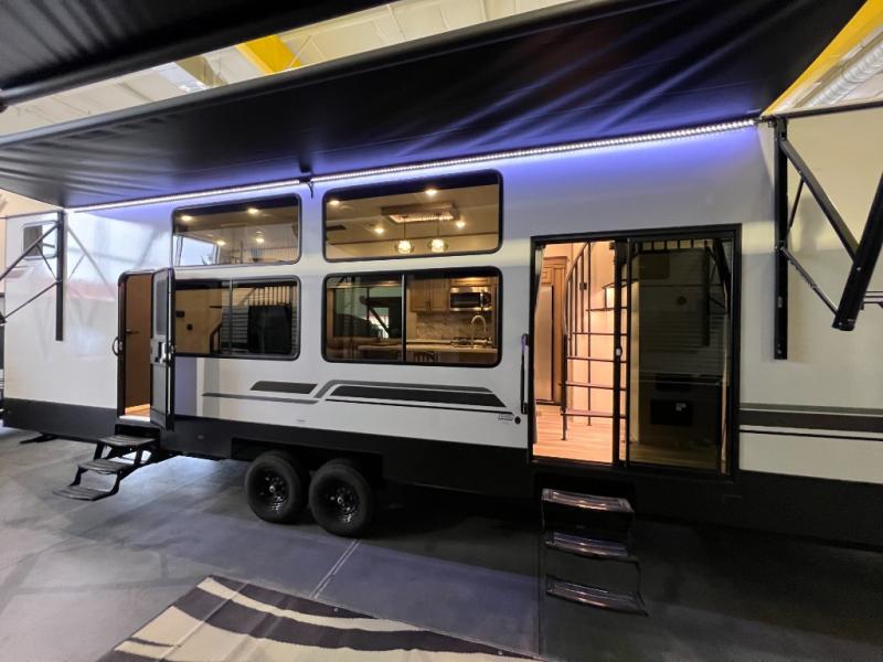 This destination trailer is a home away from home where comfort, relaxation, and entertainment come together in perfect harmony. The rear bathroom is a serene oasis, featuring washer and dryer prep, dual sink, and makeup vanity. Above, the loft area offers a cozy bunk mat, storage shelves, and an entertainment center - perfect for kids or guests. The living area is designed for relaxation and entertainment, featuring a comfortable sectional sofa, entertainment center, and warm fireplace. The kitchen is a gourmet's paradise, boasting a refrigerator, pantry, three-burner cooktop, kitchen island with chairs, and spacious pantry. The front bedroom is a peaceful retreat, complete with a half bath, overhead cabinets, a king bed, a wardrobe, and a dresser. Above, the loft area offers three bunk mats - perfect for kids or guests. Outside, enjoy the shade and protection of our 26' awning and convenient access via two entry/exit doors.