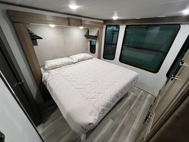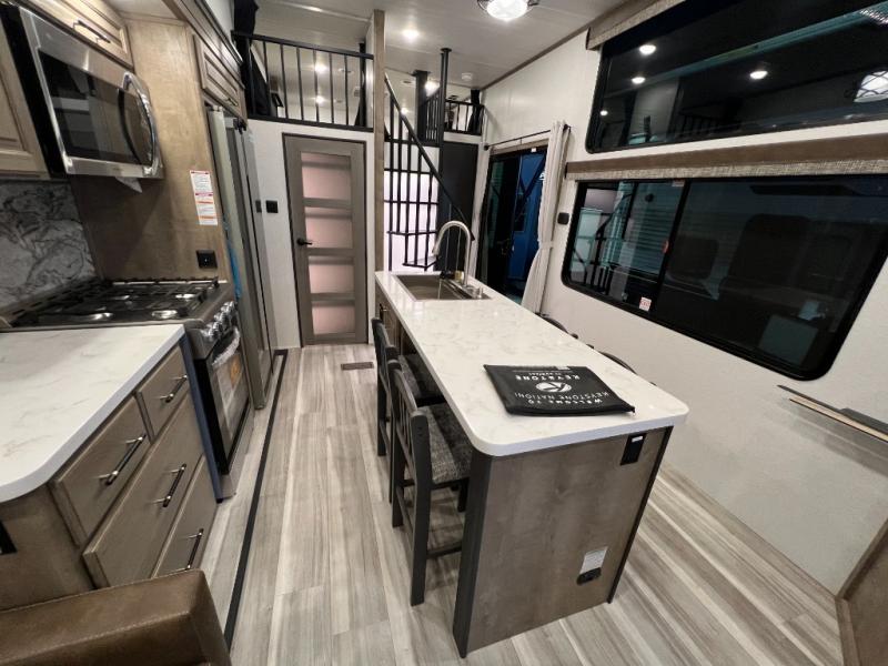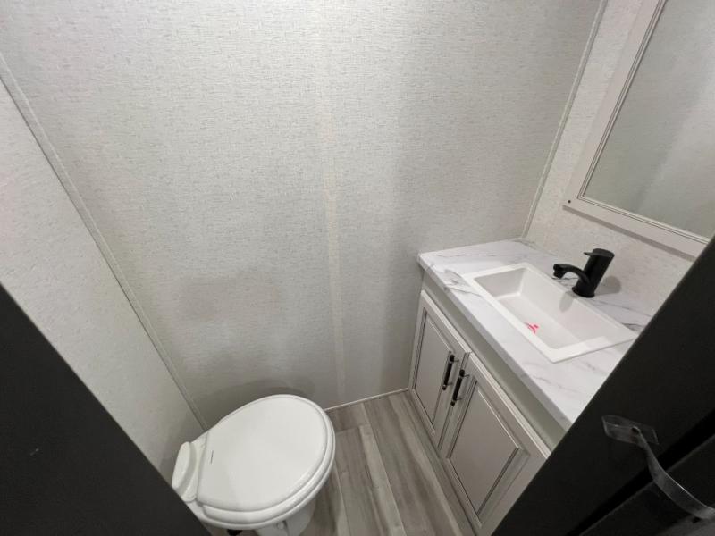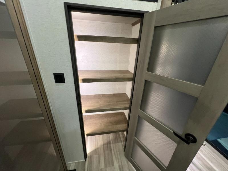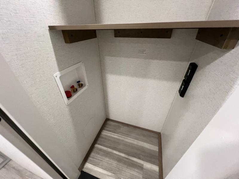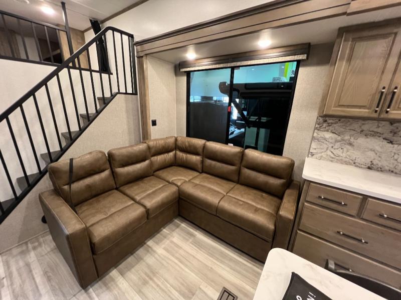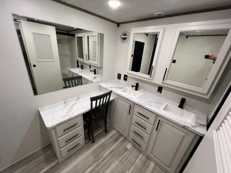 This destination trailer is a home away from home where comfort, relaxation, and entertainment come together in perfect harmony. The rear bathroom is a serene oasis, featuring washer and dryer prep, dual sink, and makeup vanity. Above, the loft area offers a cozy bunk mat, storage shelves, and an entertainment center - perfect for kids or guests. The living area is designed for relaxation and entertainment, featuring a comfortable sectional sofa, entertainment center, and warm fireplace. The kitchen is a gourmet's paradise, boasting a refrigerator, pantry, three-burner cooktop, kitchen island with chairs, and spacious pantry. The front bedroom is a peaceful retreat, complete with a half bath, overhead cabinets, a king bed, a wardrobe, and a dresser. Above, the loft area offers three bunk mats - perfect for kids or guests. Outside, enjoy the shade and protection of our 26' awning and convenient access via two entry/exit doors.