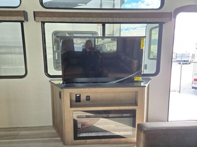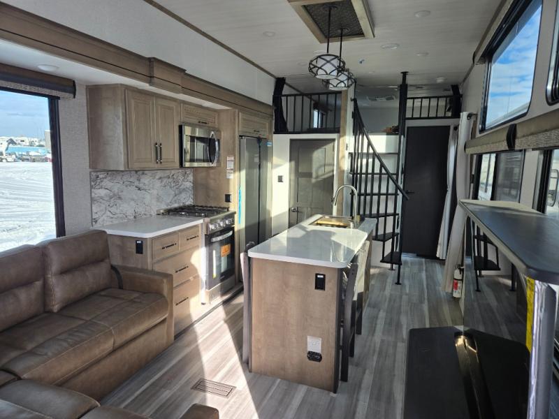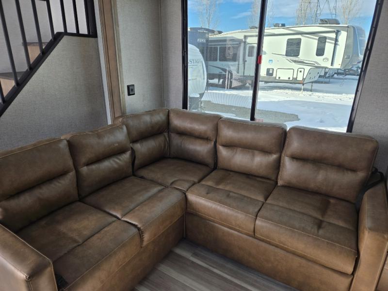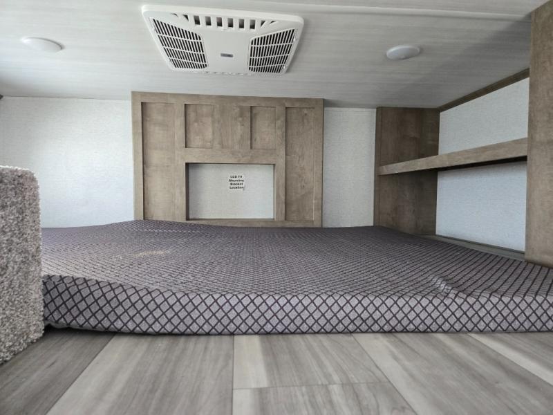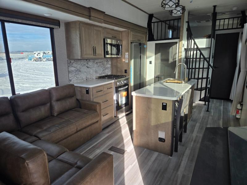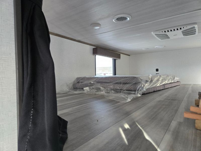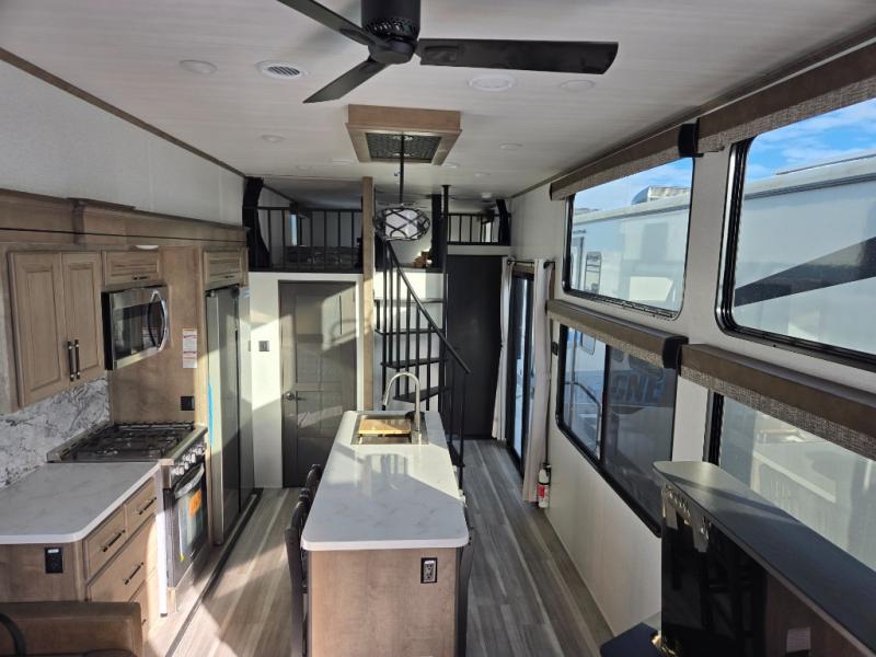 This destination trailer is a home away from home where comfort, relaxation, and entertainment come together in perfect harmony. The rear bathroom is a serene oasis, featuring washer and dryer prep, dual sink, and makeup vanity. Above, the loft area offers a cozy bunk mat, storage shelves, and an entertainment center - perfect for kids or guests. The living area is designed for relaxation and entertainment, featuring a comfortable sectional sofa, entertainment center, and warm fireplace. The kitchen is a gourmet's paradise, boasting a refrigerator, pantry, three-burner cooktop, kitchen island with chairs, and spacious pantry. The front bedroom is a peaceful retreat, complete with a half bath, overhead cabinets, a king bed, a wardrobe, and a dresser. Above, the loft area offers three bunk mats - perfect for kids or guests. Outside, enjoy the shade and protection of our 26' awning and convenient access via two entry/exit doors.
