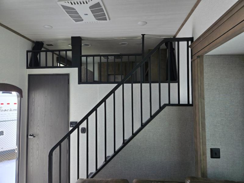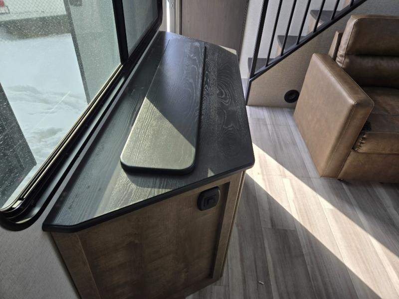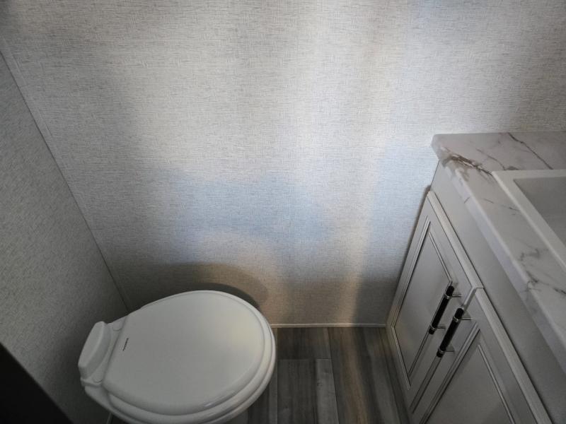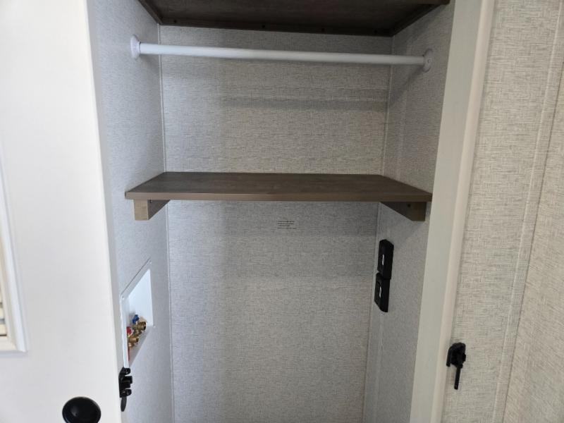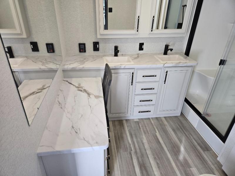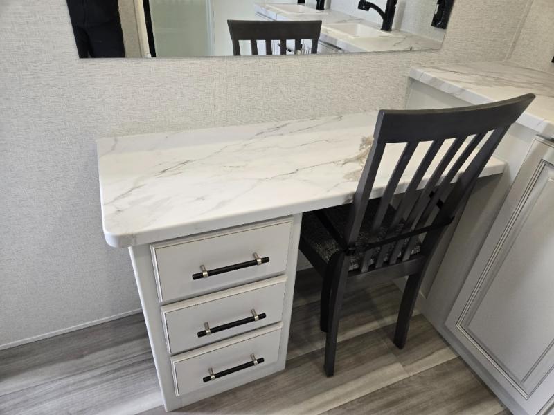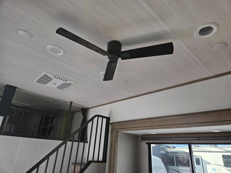 This destination trailer is a home away from home where comfort, relaxation, and entertainment come together in perfect harmony. The rear bathroom is a serene oasis, featuring washer and dryer prep, dual sink, and makeup vanity. Above, the loft area offers a cozy bunk mat, storage shelves, and an entertainment center - perfect for kids or guests. The living area is designed for relaxation and entertainment, featuring a comfortable sectional sofa, entertainment center, and warm fireplace. The kitchen is a gourmet's paradise, boasting a refrigerator, pantry, three-burner cooktop, kitchen island with chairs, and spacious pantry. The front bedroom is a peaceful retreat, complete with a half bath, overhead cabinets, a king bed, a wardrobe, and a dresser. Above, the loft area offers three bunk mats - perfect for kids or guests. Outside, enjoy the shade and protection of our 26' awning and convenient access via two entry/exit doors.