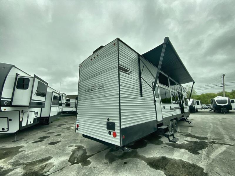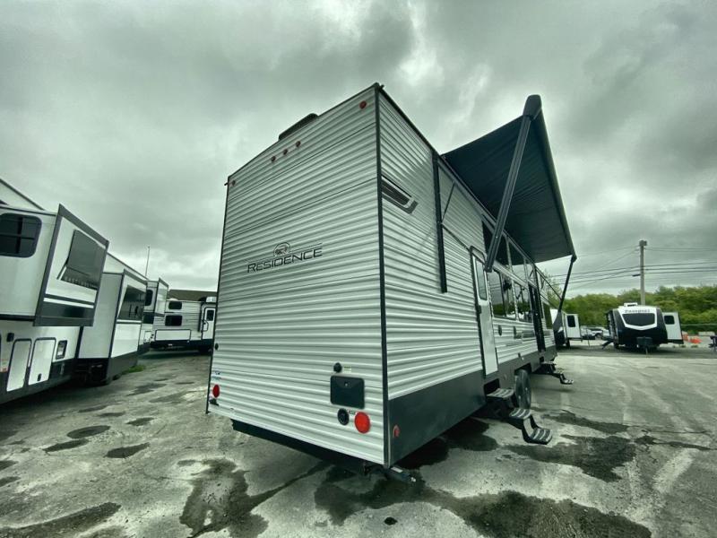 Each Residence destination trailer by Keystone offers sliding glass door providing easier access, more natural lighting, great views and fresh air when you want to leave the door open. The 8' interior height gives you taller ceilings with an open feel. Some other highlights include pre-drilled/screwed hardwood cabinet framing with easy-glide doors and waste basket storage, solid hardwood cabinetry, stainless steel undermount sink , in-floor heating ducts and Tru-fit slide construction. The heated and enclosed underbelly will allow you to take up residence all year long, and you'll also find a power awning with LED lights outside, as well as Dexter E-Z lube axles for smooth towing. Plus, if are looking for a smooth-sided laminated construction, you will love the laminated sidewalls!