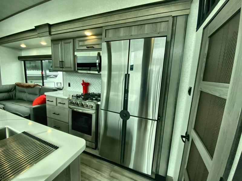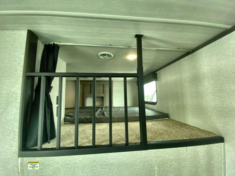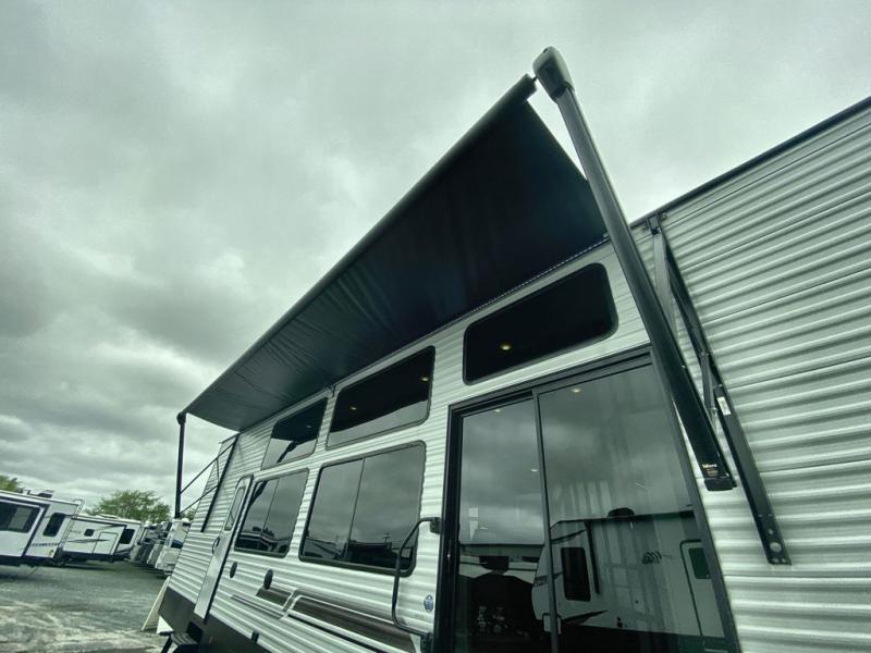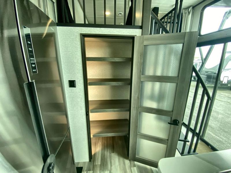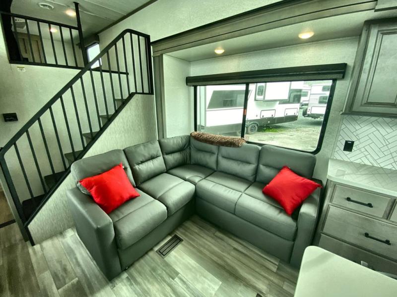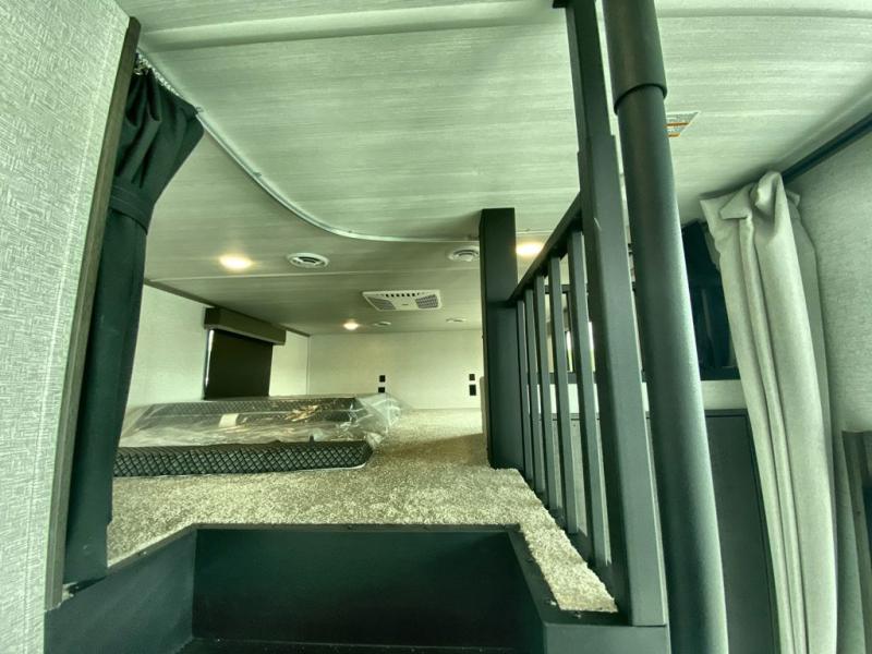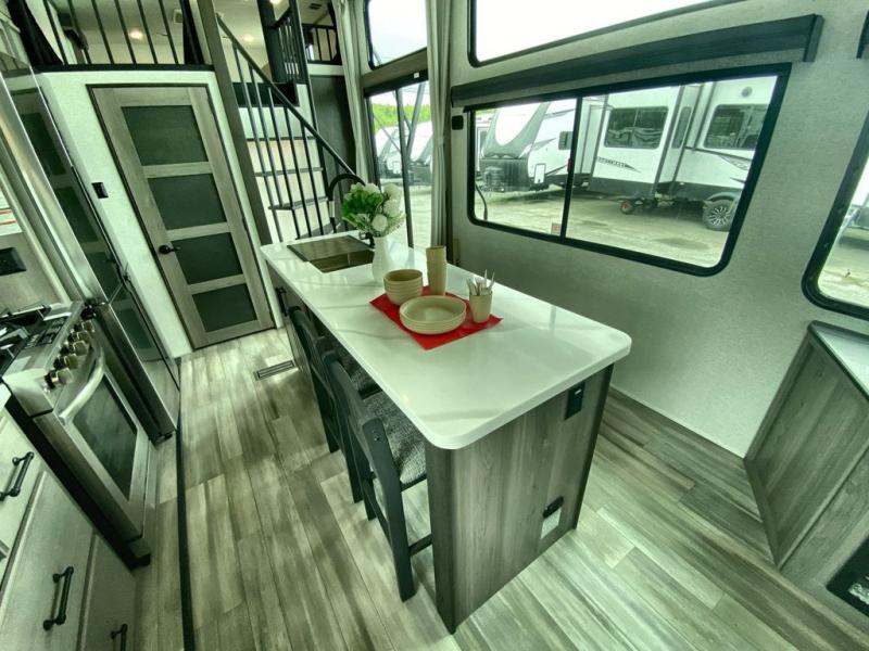This destination trailer is so accommodating, you may just want to camp all year long! The owners will have the front bedroom all to themselves with a king bed slide out, dresser, and master closet so everything has a place. Above this room is the front loft with stairs that includes three 39" x 74" beds/sleeping spaces and storage shelves, making it perfect for little ones! The spacious full rear bath includes dual bath sinks, a large shower with a seat, and a closet with washer/dryer prep if you want to add these appliances. And just outside the bath, you'll find the second set of stairs that leads to the rear loft with a 54" x 81" bed, an entertainment center, and storage shelves for your guests. During the day, everyone can meet in the combined living area and kitchen that features a large slide for more space, a sectional sofa, a kitchen island with four barstools, plus an entertainment center with a fireplace!