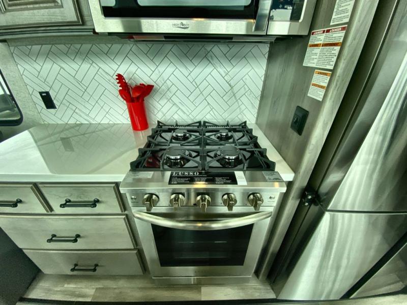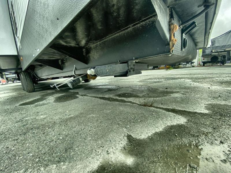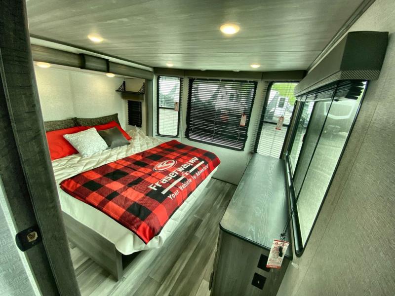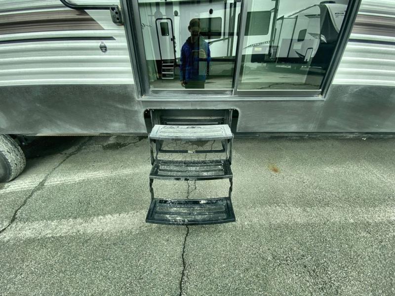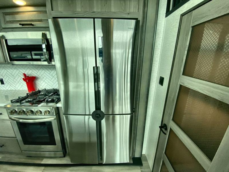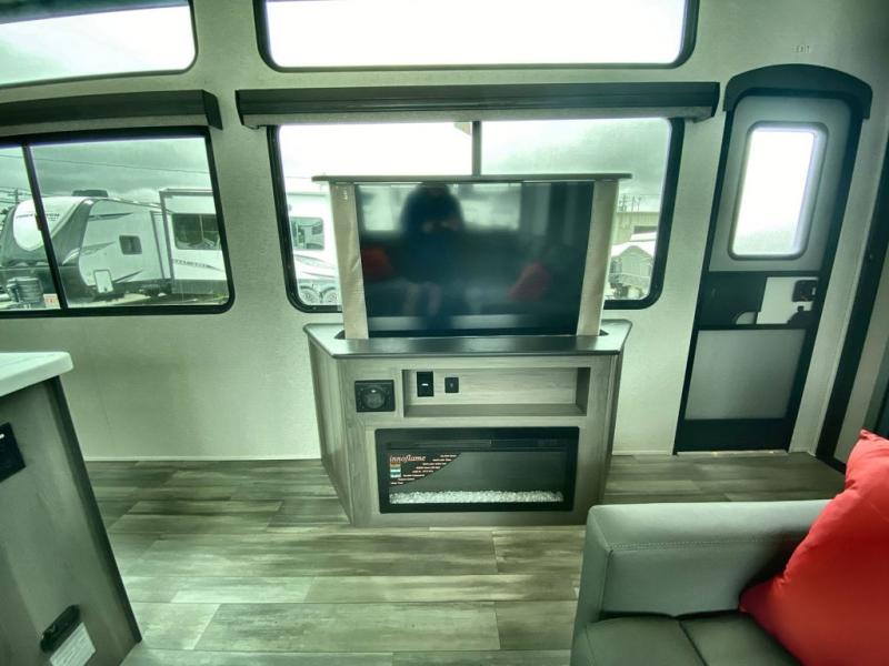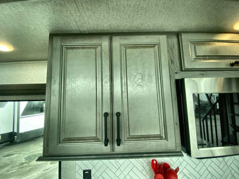 This destination trailer is so accommodating, you may just want to camp all year long! The owners will have the front bedroom all to themselves with a king bed slide out, dresser, and master closet so everything has a place. Above this room is the front loft with stairs that includes three 39" x 74" beds/sleeping spaces and storage shelves, making it perfect for little ones! The spacious full rear bath includes dual bath sinks, a large shower with a seat, and a closet with washer/dryer prep if you want to add these appliances. And just outside the bath, you'll find the second set of stairs that leads to the rear loft with a 54" x 81" bed, an entertainment center, and storage shelves for your guests. During the day, everyone can meet in the combined living area and kitchen that features a large slide for more space, a sectional sofa, a kitchen island with four barstools, plus an entertainment center with a fireplace!
