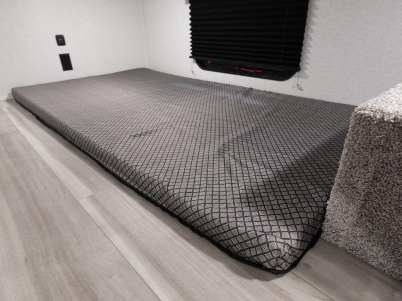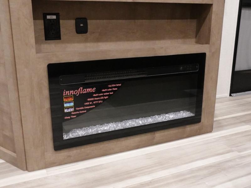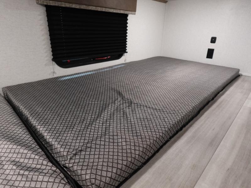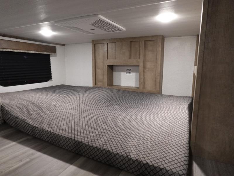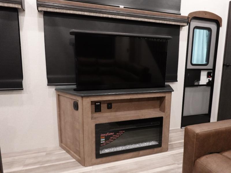 This destination trailer is a home away from home where comfort, relaxation, and entertainment come together in perfect harmony. The rear bathroom is a serene oasis, featuring washer and dryer prep, dual sink, and makeup vanity. Above, the loft area offers a cozy bunk mat, storage shelves, and an entertainment center - perfect for kids or guests. The living area is designed for relaxation and entertainment, featuring a comfortable sectional sofa, entertainment center, and warm fireplace. The kitchen is a gourmet's paradise, boasting a refrigerator, pantry, three-burner cooktop, kitchen island with chairs, and spacious pantry. The front bedroom is a peaceful retreat, complete with a half bath, overhead cabinets, a king bed, a wardrobe, and a dresser. Above, the loft area offers three bunk mats - perfect for kids or guests. Outside, enjoy the shade and protection of our 26' awning and convenient access via two entry/exit doors.