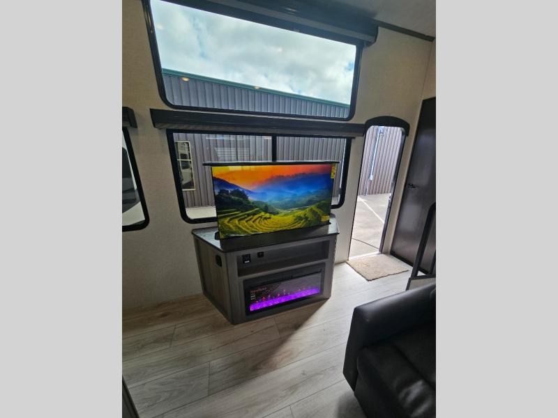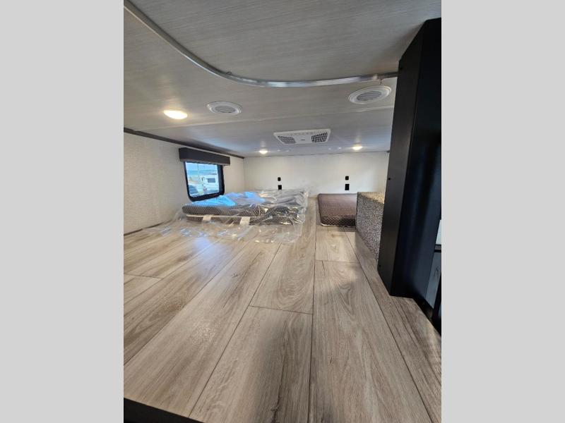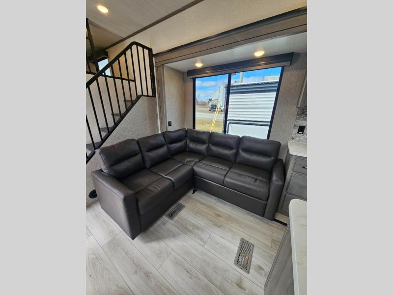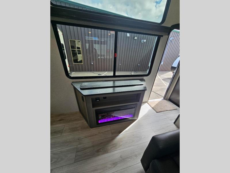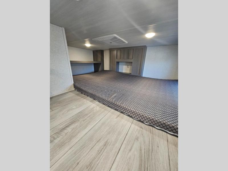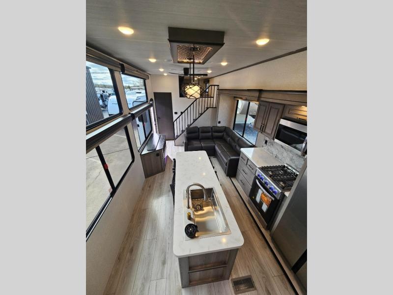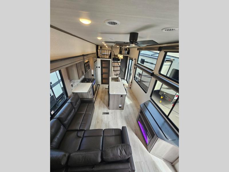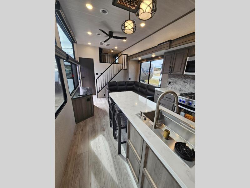 This destination trailer is so accommodating, you may just want to camp all year long! The owners will have the front bedroom all to themselves with a king bed slide out, dresser, and master closet so everything has a place. Above this room is the front loft with stairs that includes three 39" x 74" beds/sleeping spaces and storage shelves, making it perfect for little ones! The spacious full rear bath includes dual bath sinks, a large 48" x 30" shower with a seat, and a closet with washer/dryer prep if you want to add these appliances. And just outside the bath, you'll find the second set of stairs that leads to the rear loft with a 54" x 81" bed, an entertainment center, and storage shelves for your guests. During the day, everyone can meet in the combined living area and kitchen that features a large slide for more space, a sectional sofa, a kitchen island with four barstools, plus an entertainment center with a fireplace!