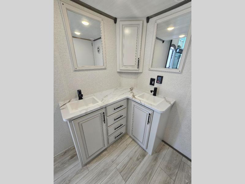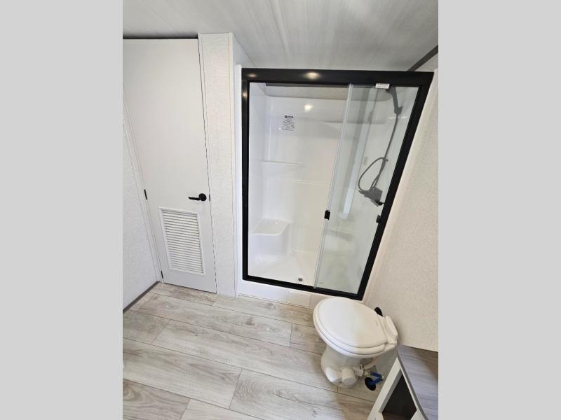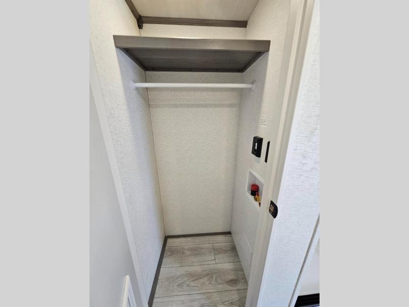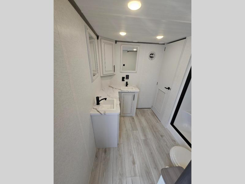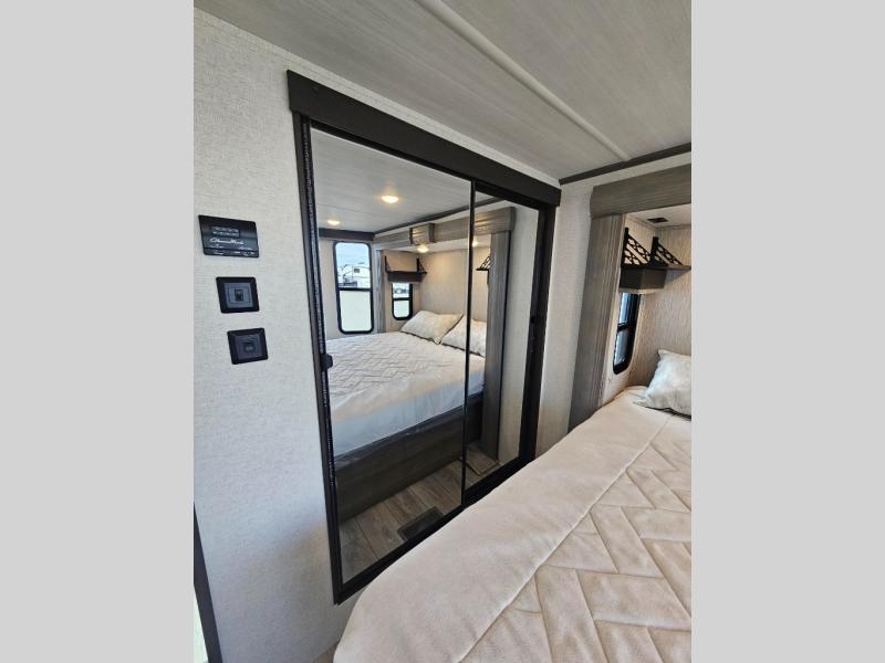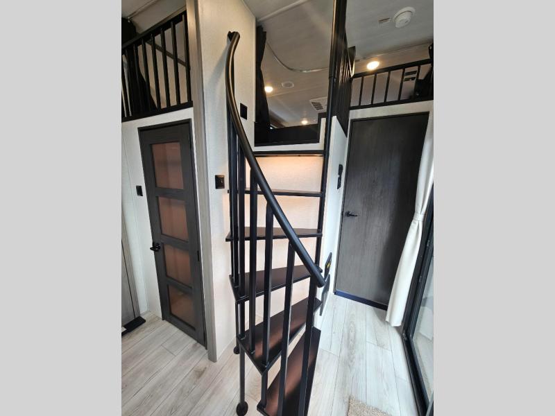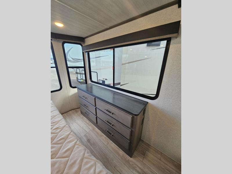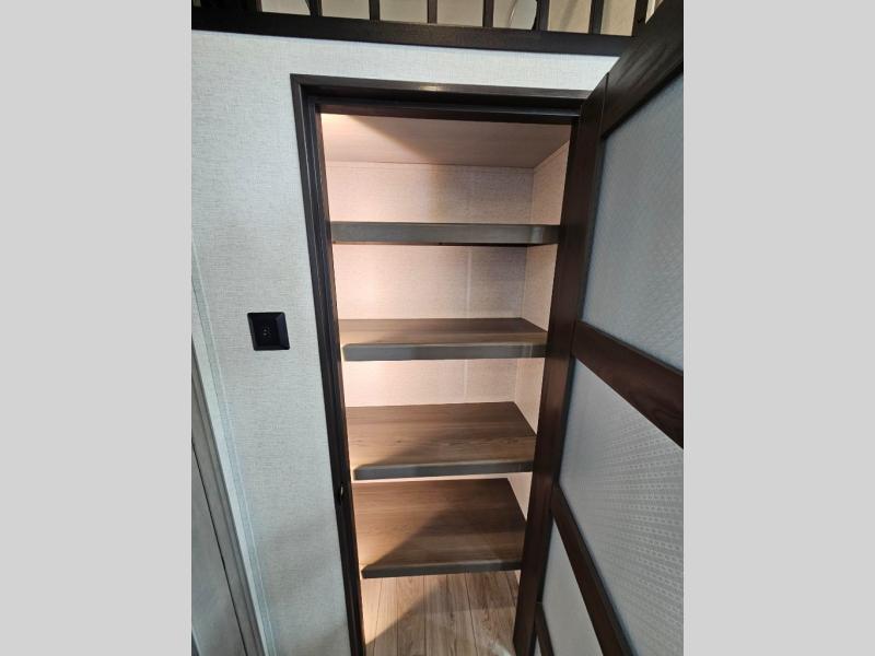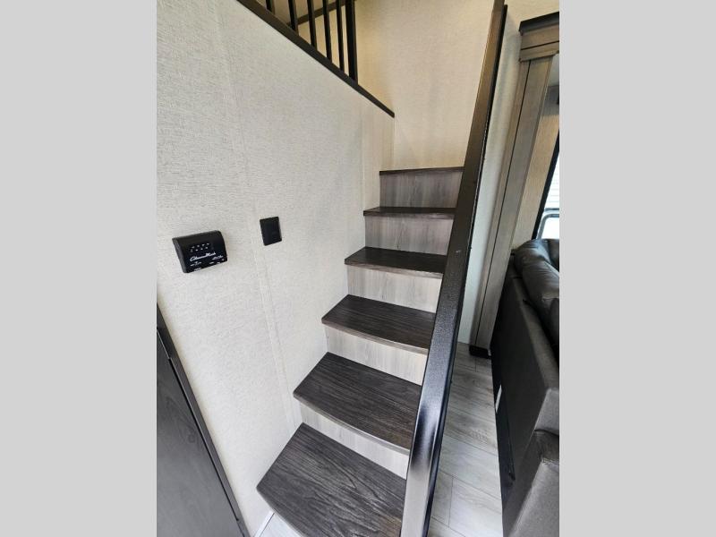 This destination trailer is so accommodating, you may just want to camp all year long! The owners will have the front bedroom all to themselves with a king bed slide out, dresser, and master closet so everything has a place. Above this room is the front loft with stairs that includes three 39" x 74" beds/sleeping spaces and storage shelves, making it perfect for little ones! The spacious full rear bath includes dual bath sinks, a large 48" x 30" shower with a seat, and a closet with washer/dryer prep if you want to add these appliances. And just outside the bath, you'll find the second set of stairs that leads to the rear loft with a 54" x 81" bed, an entertainment center, and storage shelves for your guests. During the day, everyone can meet in the combined living area and kitchen that features a large slide for more space, a sectional sofa, a kitchen island with four barstools, plus an entertainment center with a fireplace!