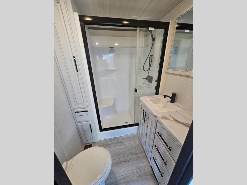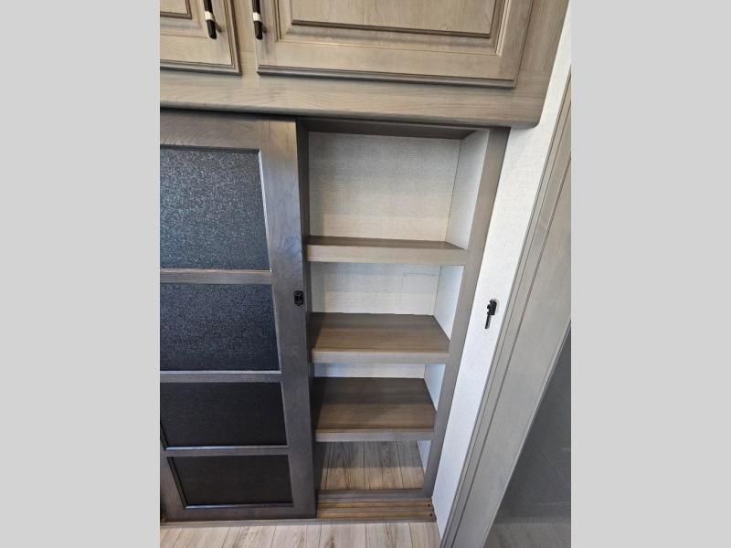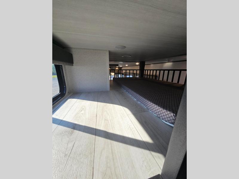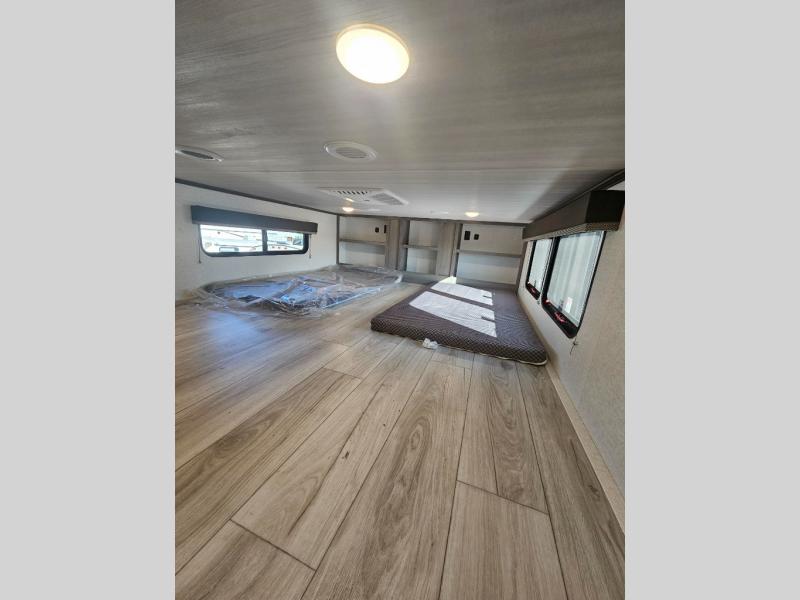 For the ultimate getaway retreat, you need this Retreat destination trailer! With its 15 cu. ft. refrigerator, three-burner range top, and shower with a seat, you will have all of the basic amenities needed for everyday living, but this model doesn't stop there. You will also find plenty of extra special touches added throughout the interior, like the king-size bed and master closet in the bedroom, the rear loft above the bedroom, and additional sleeping space on the pull-out sleeper sofa up front. You will also thoroughly enjoy the comfort of lounging back in the theater seating with an ice-cold beverage sitting in the cup holder while you watch a movie on the 50" LED TV.