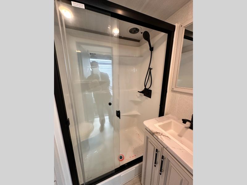 BATHROOM FEATURES: Extra large fiberglass shower w/ glass door