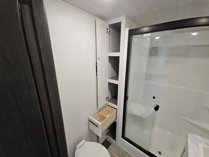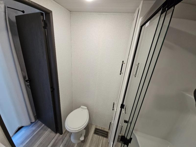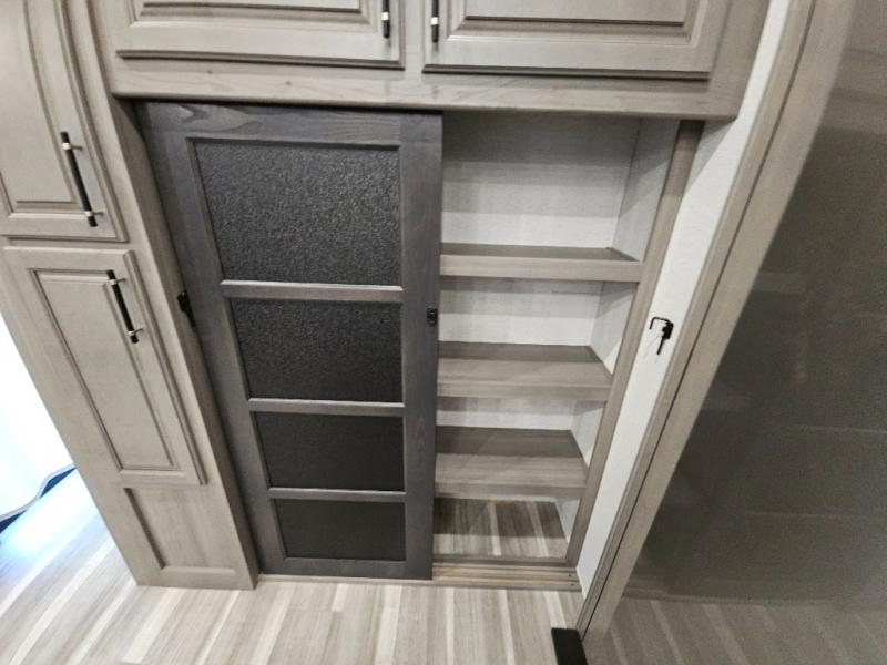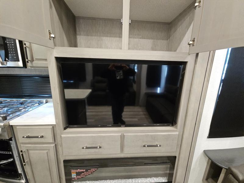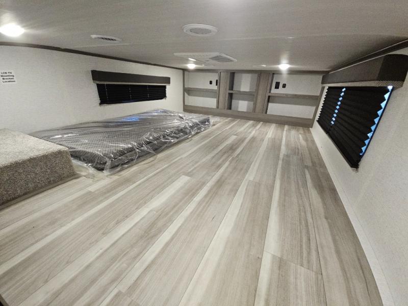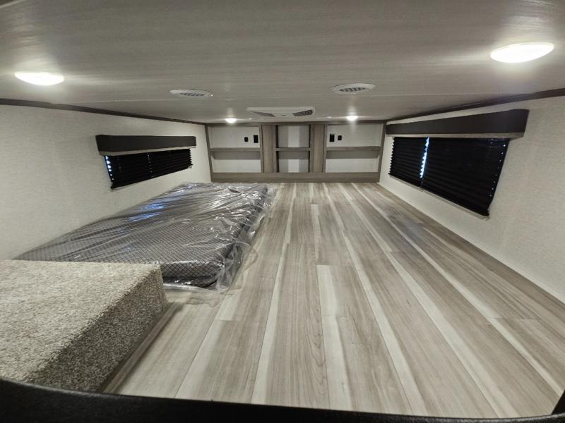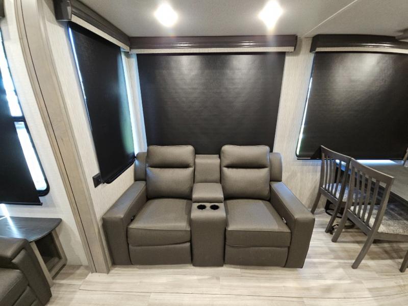 For the ultimate getaway retreat, you need this Retreat destination trailer! With its 15 cu. ft. refrigerator, three-burner range top, and shower with a seat, you will have all of the basic amenities needed for everyday living, but this model doesn't stop there. You will also find plenty of extra special touches added throughout the interior, like the king-size bed and master closet in the bedroom, the rear loft above the bedroom, and additional sleeping space on the pull-out sleeper sofa up front. You will also thoroughly enjoy the comfort of lounging back in the theater seating with an ice-cold beverage sitting in the cup holder while you watch a movie on the 50" LED TV.