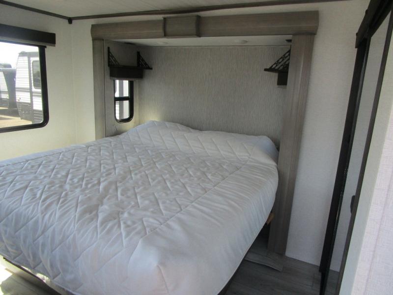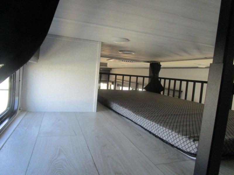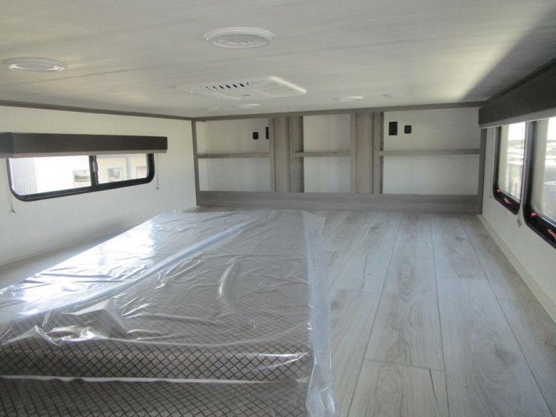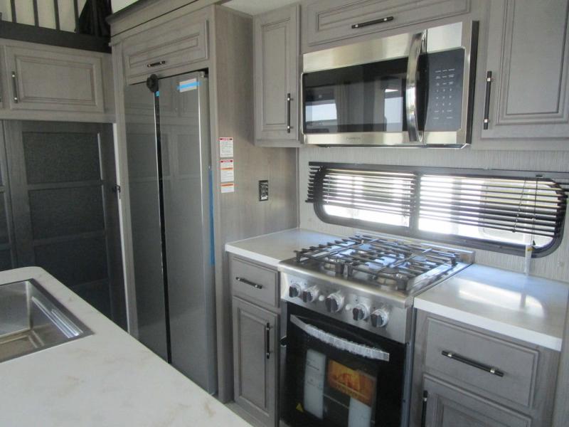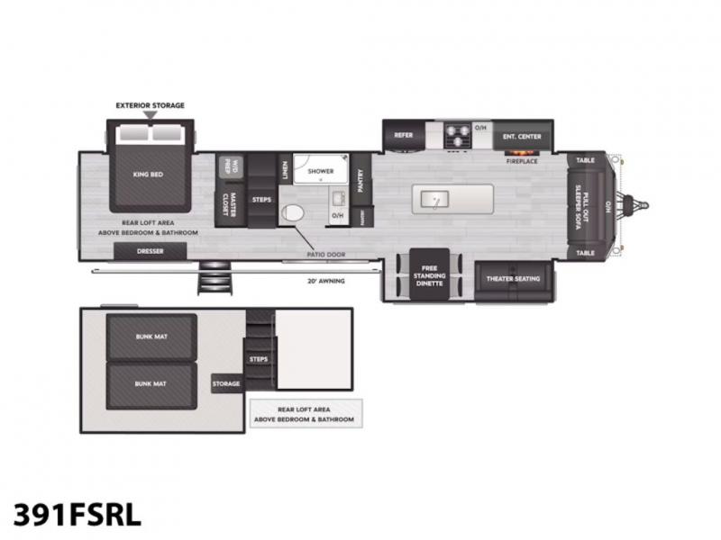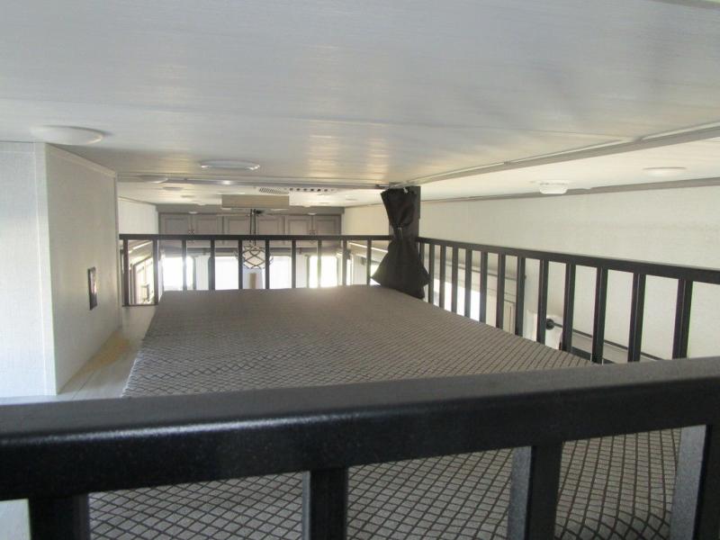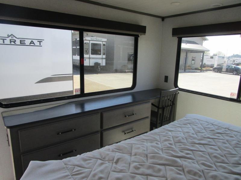 For the ultimate getaway retreat, you need this Retreat destination trailer! With its 15 cu. ft. refrigerator, three-burner range top, and shower with a seat, you will have all of the basic amenities needed for everyday living, but this model doesn't stop there. You will also find plenty of extra special touches added throughout the interior, like the king-size bed and master closet in the bedroom, the rear loft above the bedroom, and additional sleeping space on the pull-out sleeper sofa up front. You will also thoroughly enjoy the comfort of lounging back in the theater seating with an ice-cold beverage sitting in the cup holder while you watch a movie on the 50" LED TV.