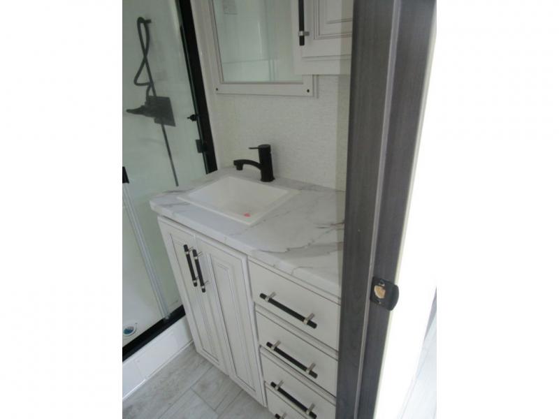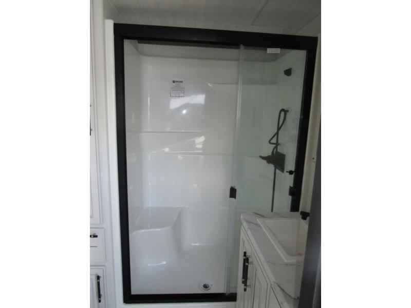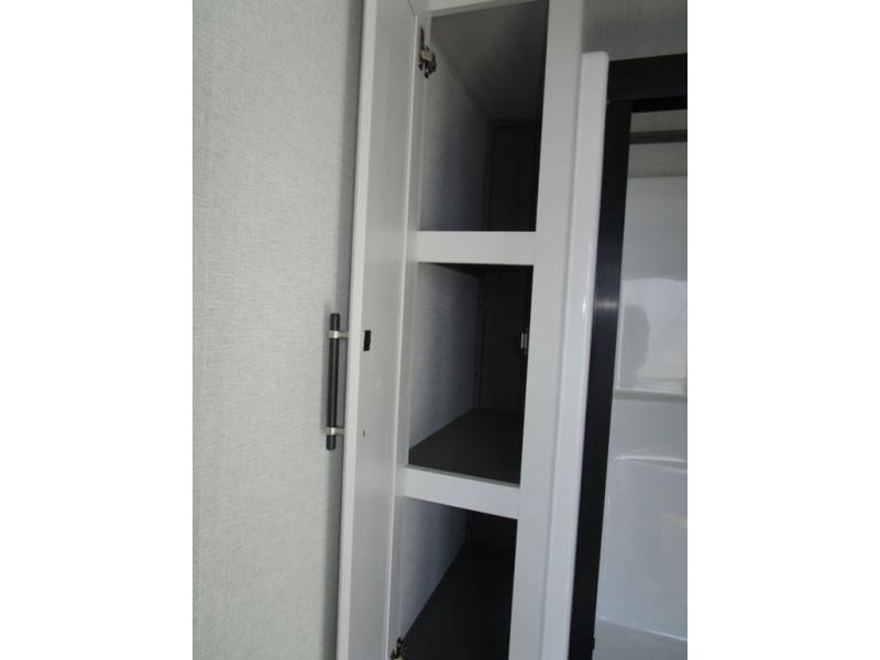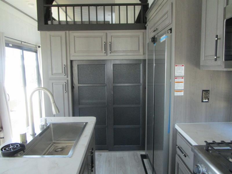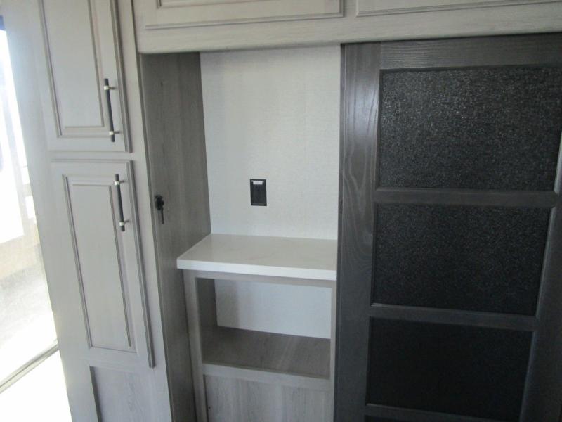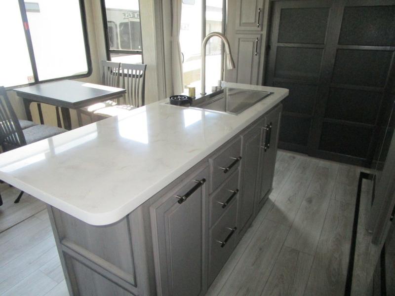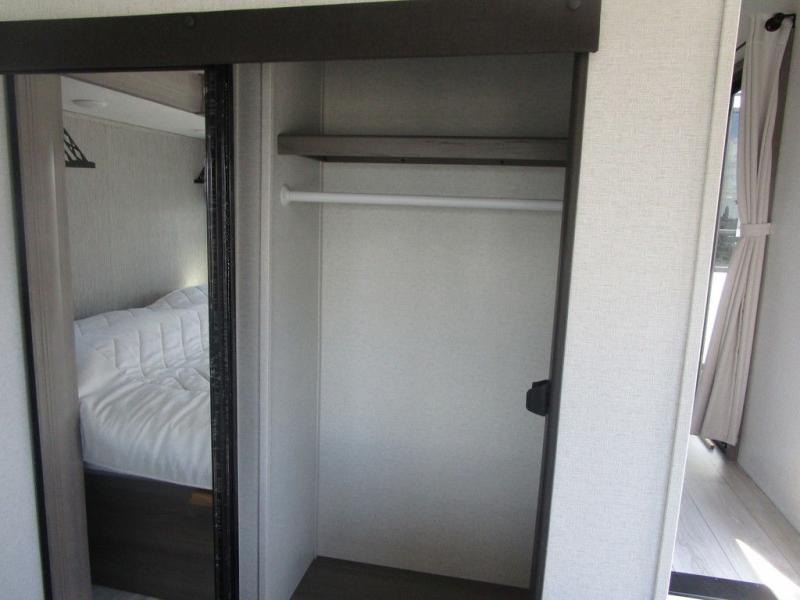 For the ultimate getaway retreat, you need this Retreat destination trailer! With its 15 cu. ft. refrigerator, three-burner range top, and shower with a seat, you will have all of the basic amenities needed for everyday living, but this model doesn't stop there. You will also find plenty of extra special touches added throughout the interior, like the king-size bed and master closet in the bedroom, the rear loft above the bedroom, and additional sleeping space on the pull-out sleeper sofa up front. You will also thoroughly enjoy the comfort of lounging back in the theater seating with an ice-cold beverage sitting in the cup holder while you watch a movie on the 50" LED TV.