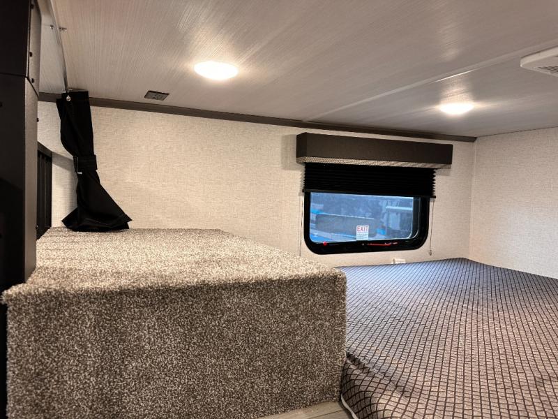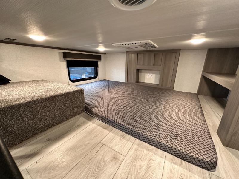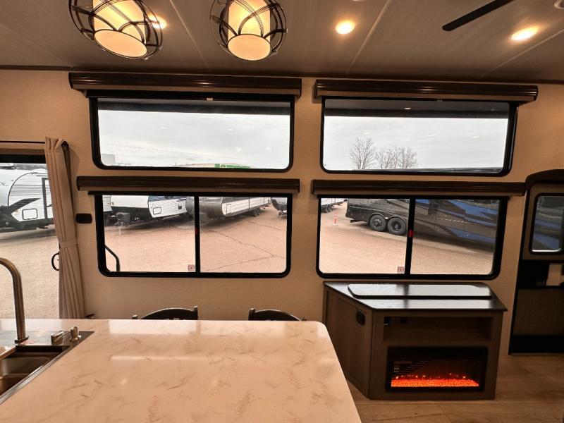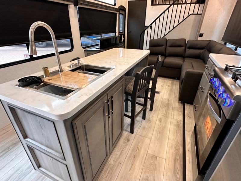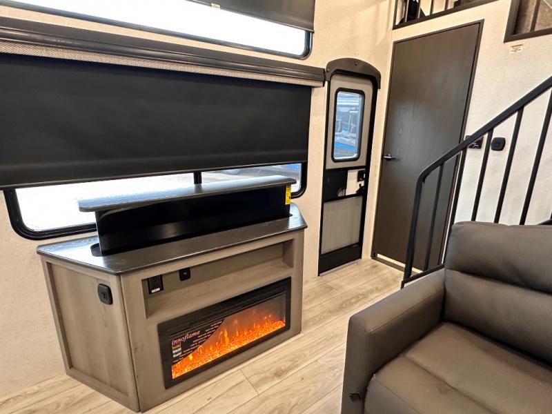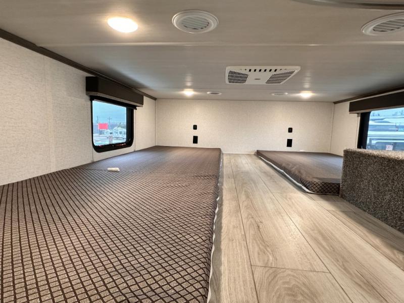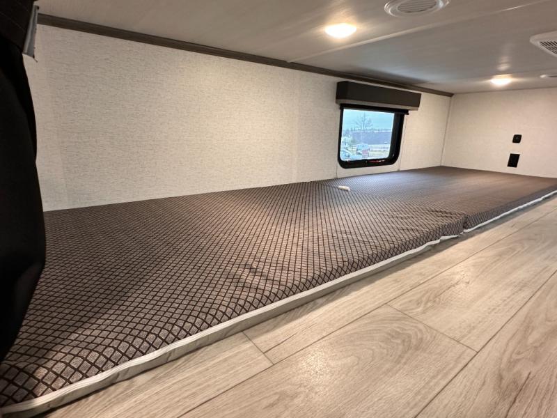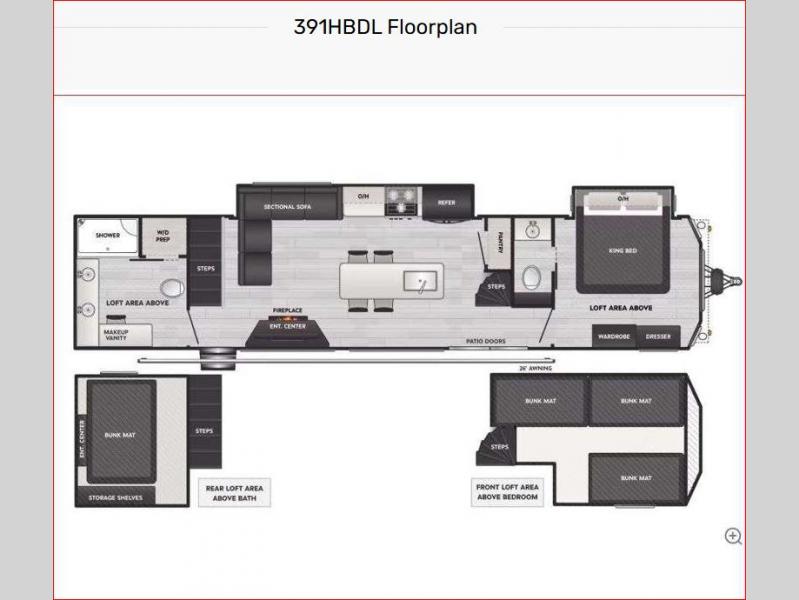 This destination trailer is so accommodating, you may just want to camp all year long! The owners will have the front bedroom all to themselves with a king bed slide out, dresser. Above this room is the front loft with stairs that includes three 39" x 74" beds/sleeping spaces and storage shelves, making it perfect for little ones! The spacious full rear bath includes dual bath sinks, a large 48" x 30" shower with a seat, and a closet with washer/dryer prep if you want to add these appliances. And just outside the bath, you'll find the second set of stairs that leads to the rear loft with a 54" x 81" bed, an entertainment center, and storage shelves for your guests. During the day, everyone can meet in the combined living area and kitchen that features a large slide for more space, a sectional sofa, a kitchen island with four barstools, plus an entertainment center with a fireplace!