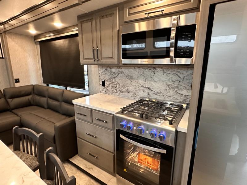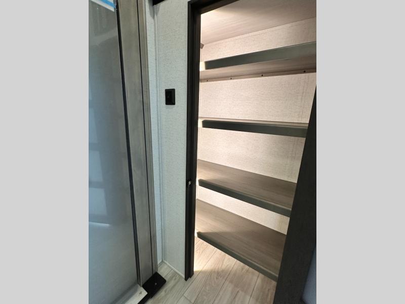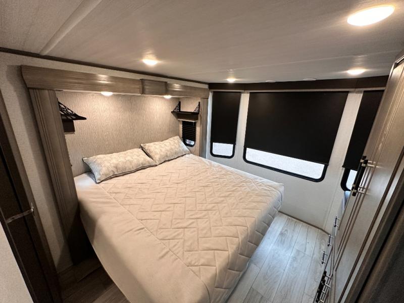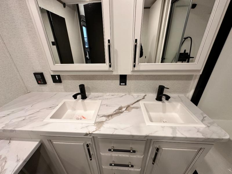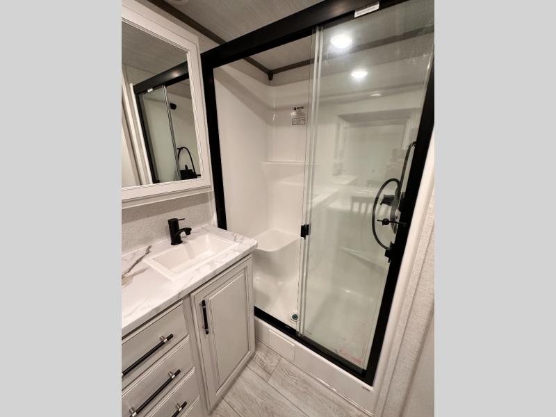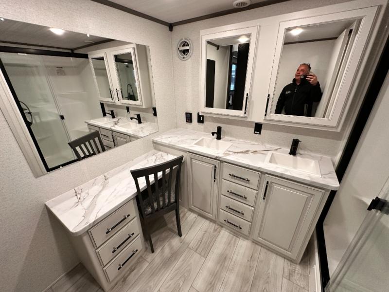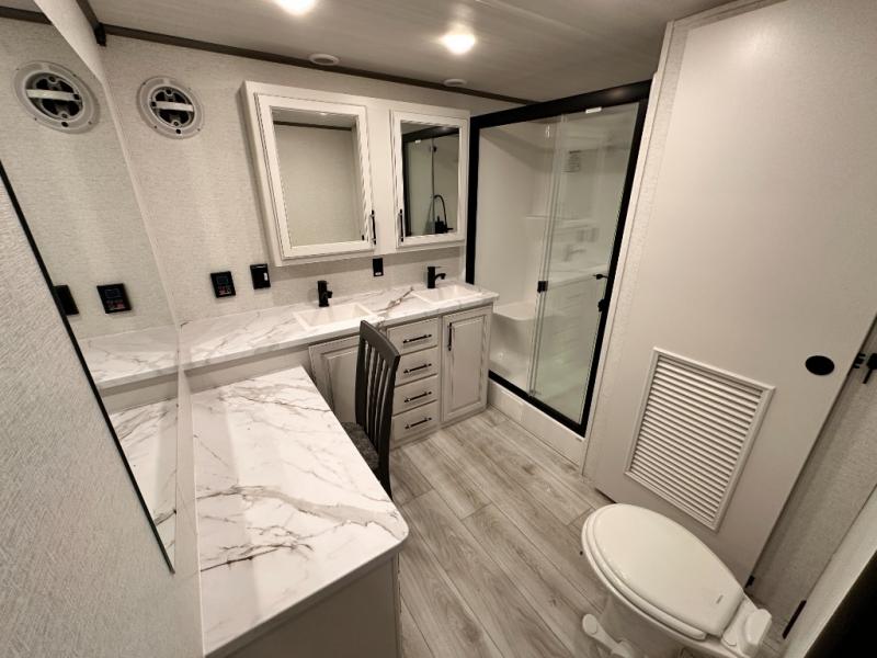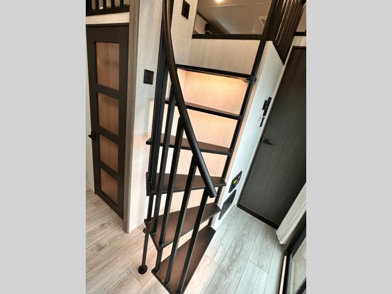 This destination trailer is so accommodating, you may just want to camp all year long! The owners will have the front bedroom all to themselves with a king bed slide out, dresser. Above this room is the front loft with stairs that includes three 39" x 74" beds/sleeping spaces and storage shelves, making it perfect for little ones! The spacious full rear bath includes dual bath sinks, a large 48" x 30" shower with a seat, and a closet with washer/dryer prep if you want to add these appliances. And just outside the bath, you'll find the second set of stairs that leads to the rear loft with a 54" x 81" bed, an entertainment center, and storage shelves for your guests. During the day, everyone can meet in the combined living area and kitchen that features a large slide for more space, a sectional sofa, a kitchen island with four barstools, plus an entertainment center with a fireplace!