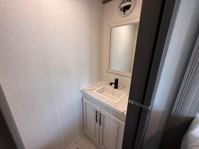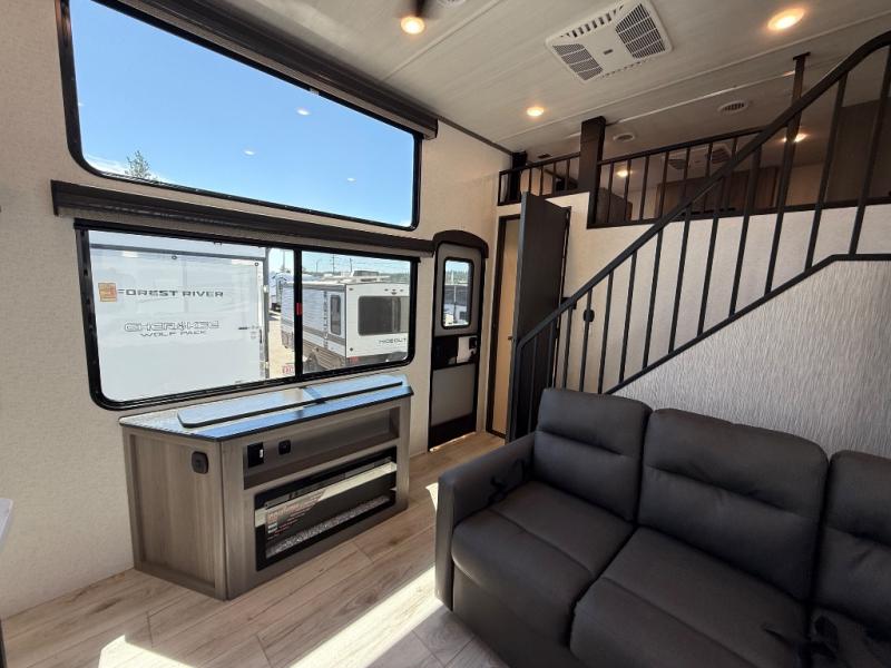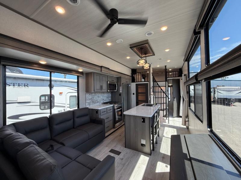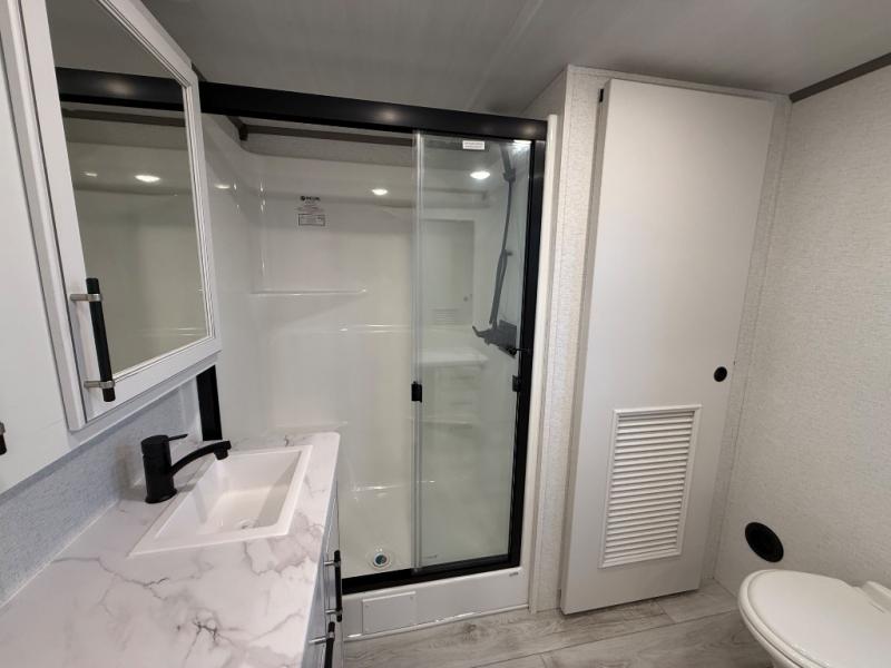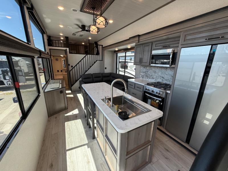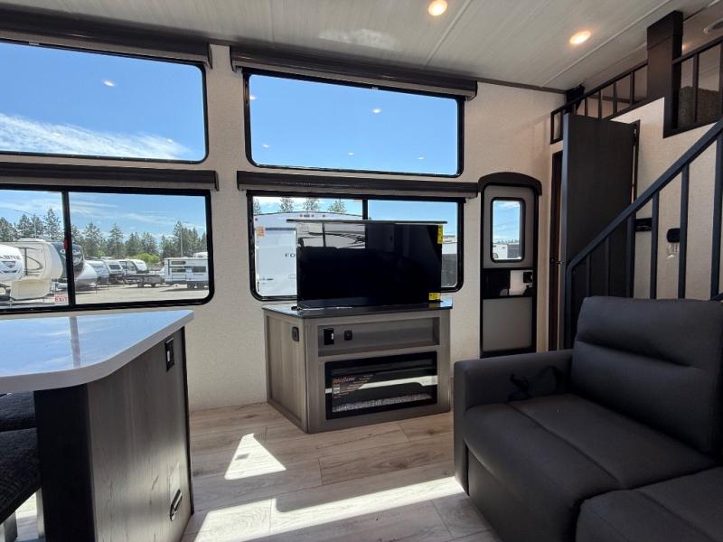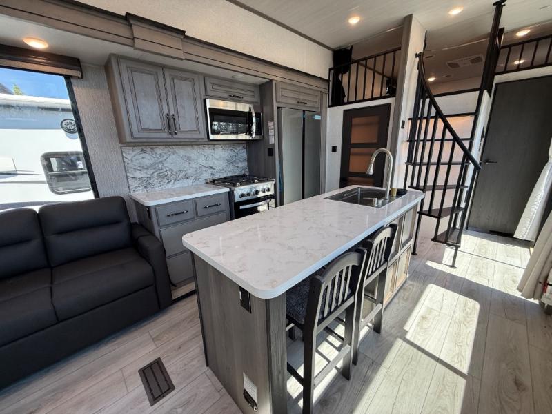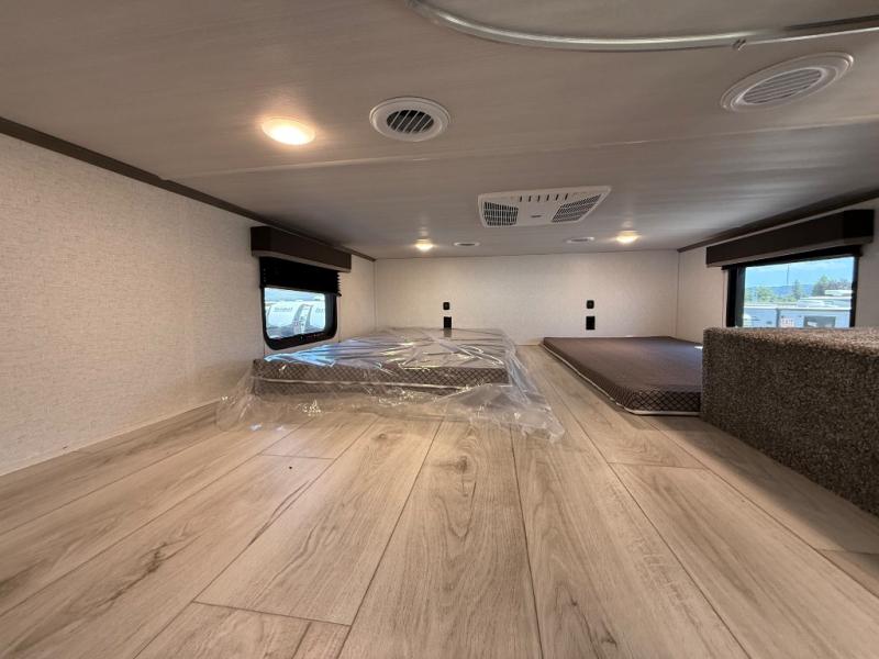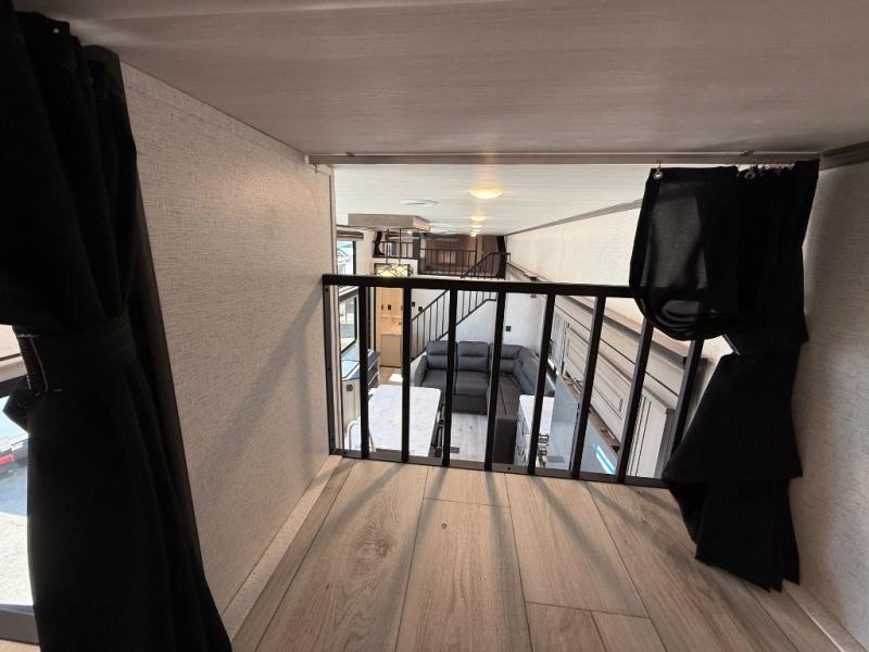 The ultimate destination trailer is found with this Retreat! You'll have the front master bedroom all to yourselves which includes a king bed slide out, a wardrobe and dresser, plus your own half bath! The front loft above the bedroom includes steps that lead the way, plus triple bunk mats to sleep little ones. The rear loft includes a fourth bunk mat, along with storage shelves and an entertainment center if you want to add a TV here. Your crew can meet in the combined kitchen and living area, which features a large slide out for more space, an L-shaped sectional sofa across from the entertainment center and fireplace, plus a large kitchen island with four seats! We've saved the best for last; the full rear bath, complete with dual bath sinks, a makeup vanity with a chair, a shower with a seat, plus washer and dryer prep if you choose to add these appliances!