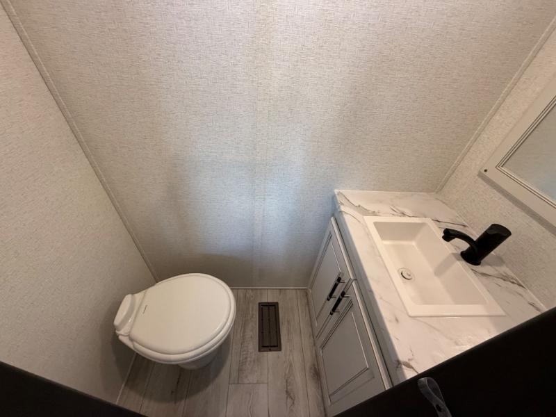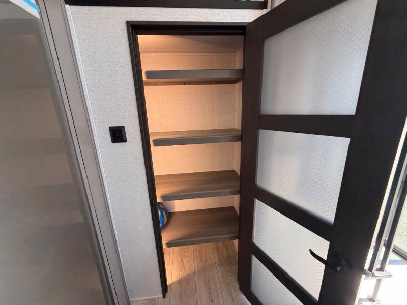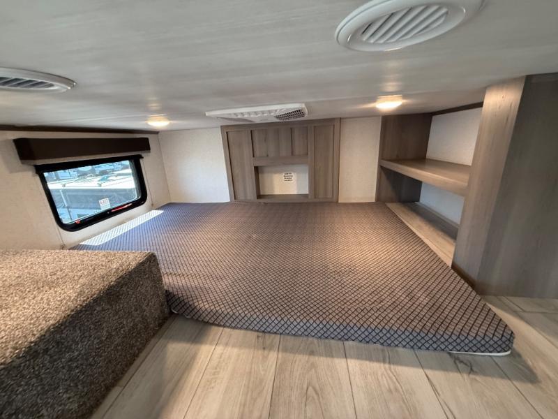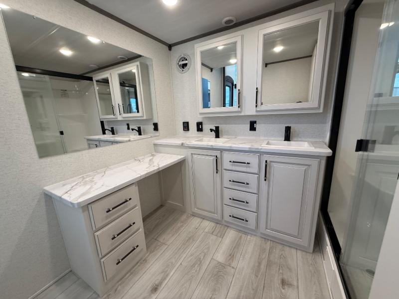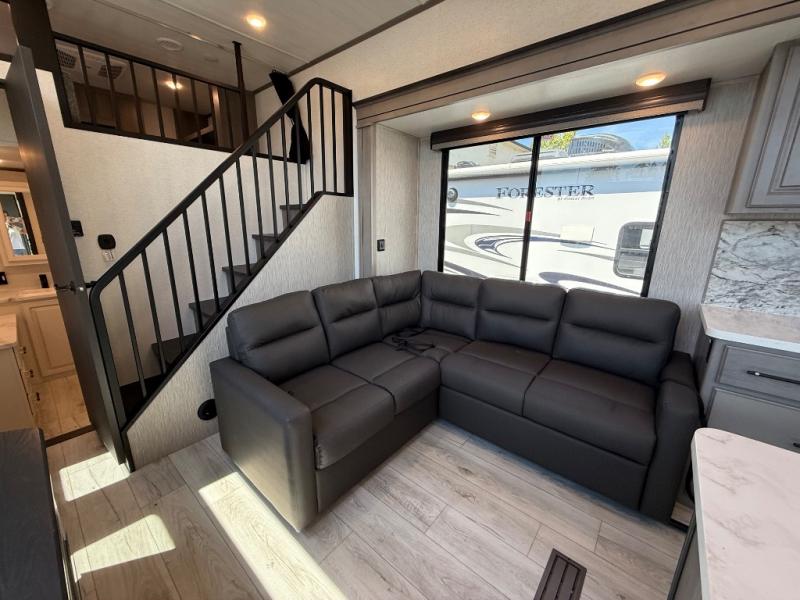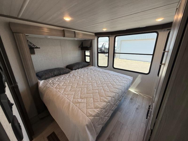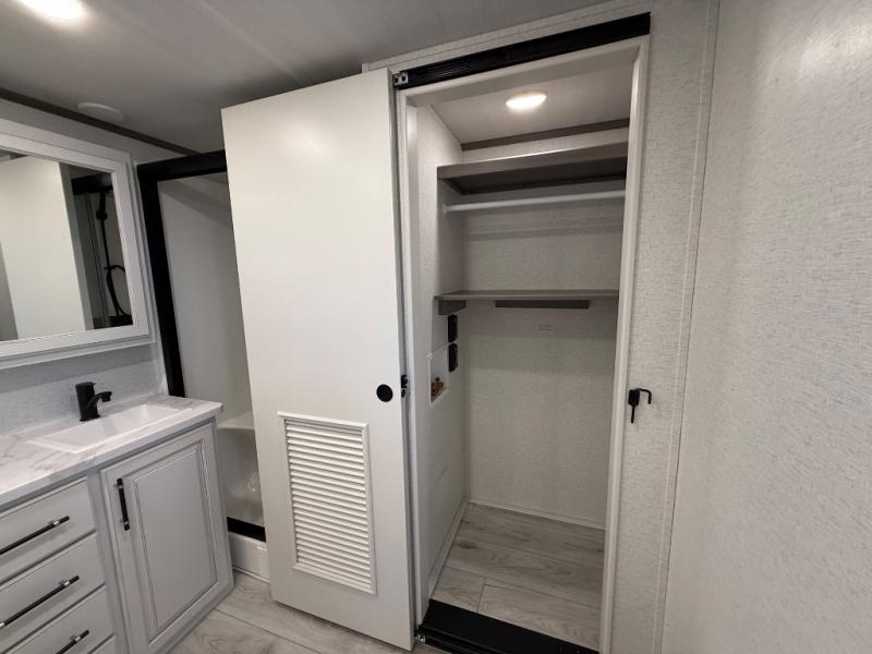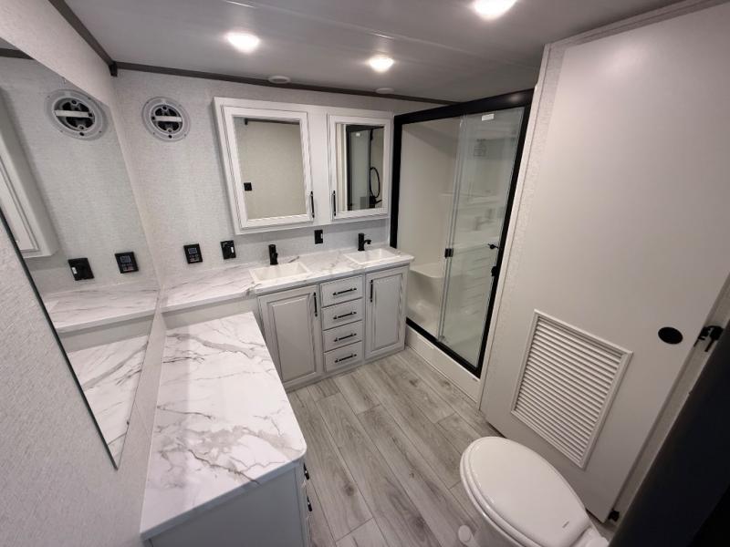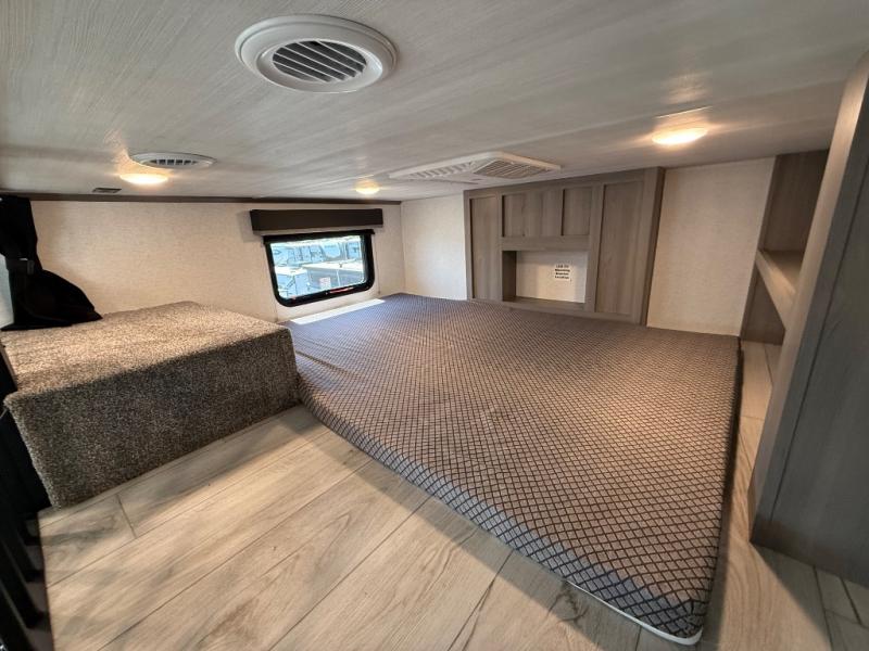 The ultimate destination trailer is found with this Retreat! You'll have the front master bedroom all to yourselves which includes a king bed slide out, a wardrobe and dresser, plus your own half bath! The front loft above the bedroom includes steps that lead the way, plus triple bunk mats to sleep little ones. The rear loft includes a fourth bunk mat, along with storage shelves and an entertainment center if you want to add a TV here. Your crew can meet in the combined kitchen and living area, which features a large slide out for more space, an L-shaped sectional sofa across from the entertainment center and fireplace, plus a large kitchen island with four seats! We've saved the best for last; the full rear bath, complete with dual bath sinks, a makeup vanity with a chair, a shower with a seat, plus washer and dryer prep if you choose to add these appliances!