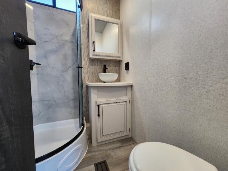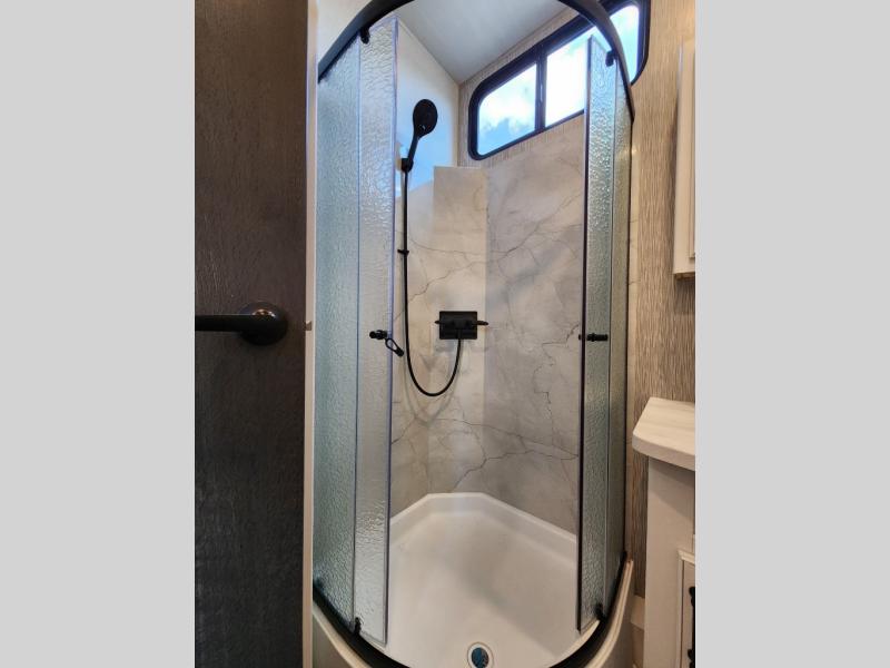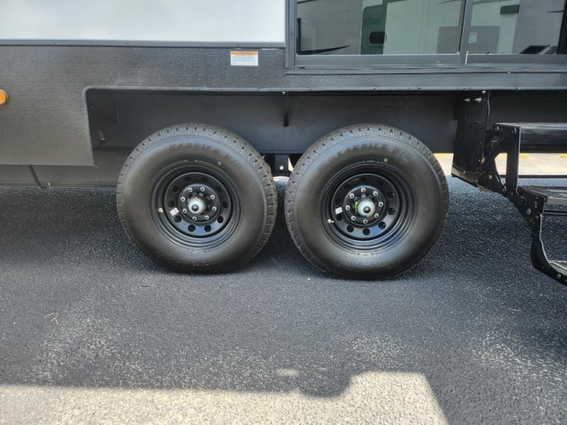 The Keystone Retreat destination trailer is a luxurious retreat in and of itself! You won't need to plan an extensive road trip because the Retreat gives you everything you need in one location. The enclosed underbelly will protect your unit from inclement weather, and the sliding glass doors make the Retreat feel like home. You can add an optional power awning with LED lights to create an outdoor party space, and the 8' interior comes with a ceiling fan that you can use to cool down your living area. There are also hardwood cabinet doors, framing, and slide fascia plus solid surface countertops and a stainless steel sink in the kitchen.