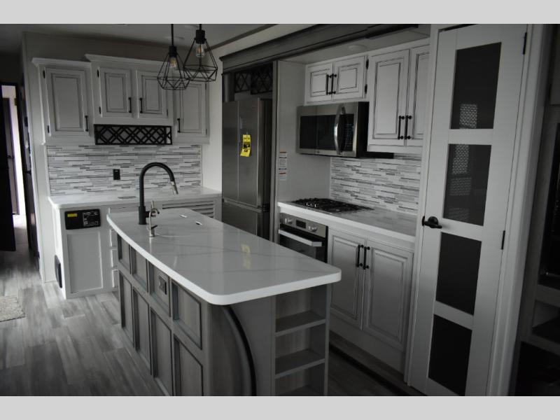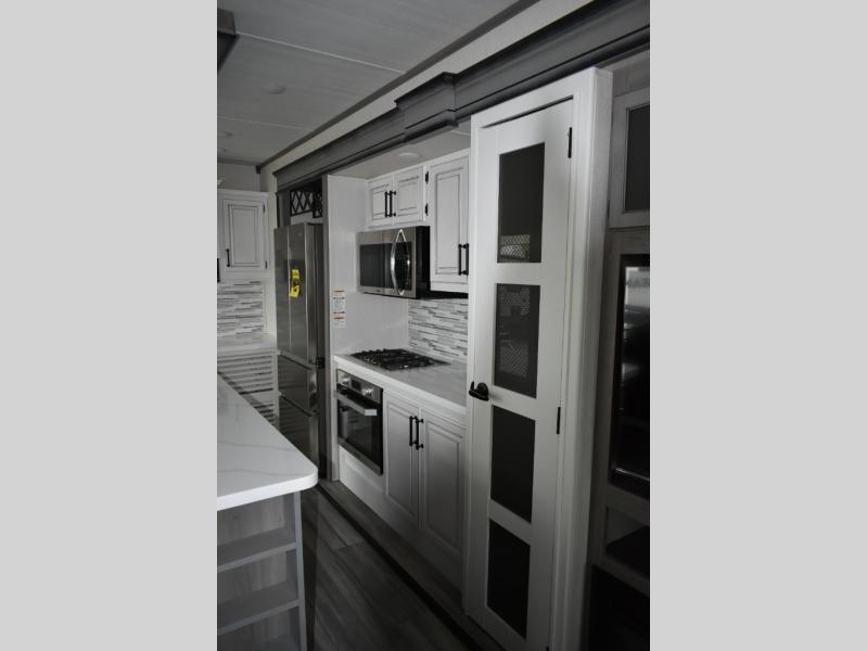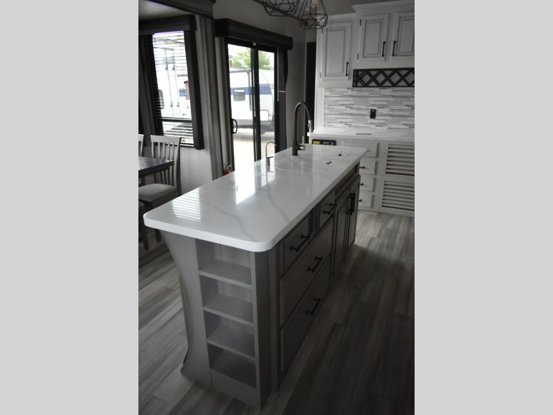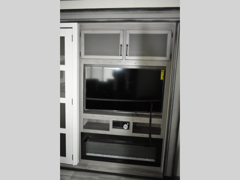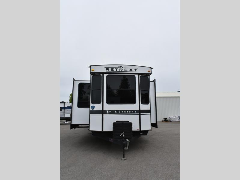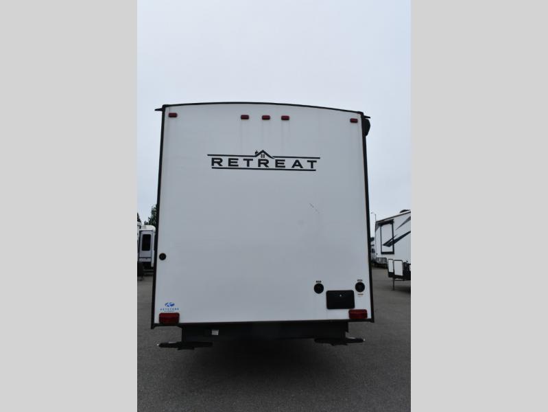 This spacious Keystone Retreat destination trailer has triple slides, two entry doors, and everything you need to have fun while away from home. The living area has plenty of space for entertaining guests. There is an HDTV in the living space for you to just pop in a movie on a cooler night, take a seat in the theatre seating, and enjoy making memories with your family. The cabinetry and storage areas in this unit, like the large wardrobe and bedroom vanity, are perfect for taking along as many items as you would like. You will also find the optional Luxury Package available on this model to be a brilliant addition!