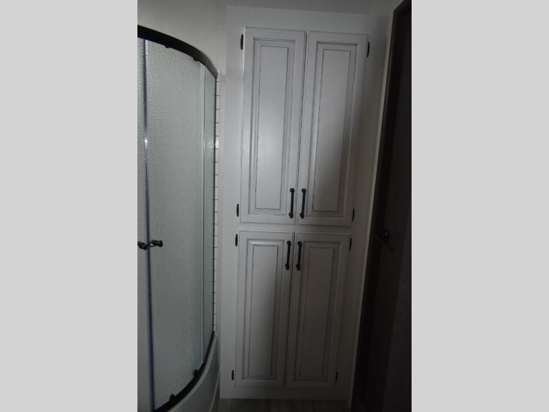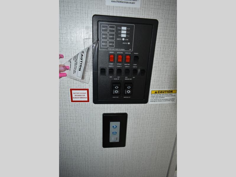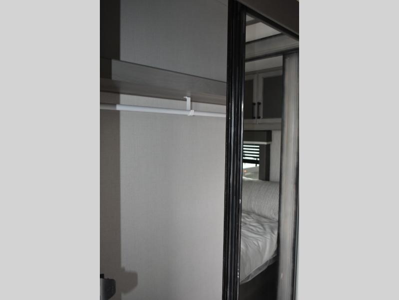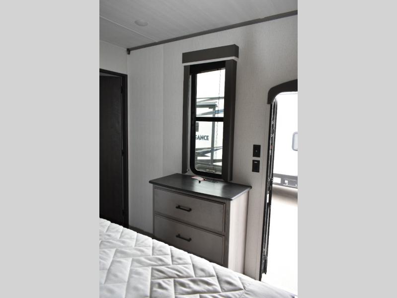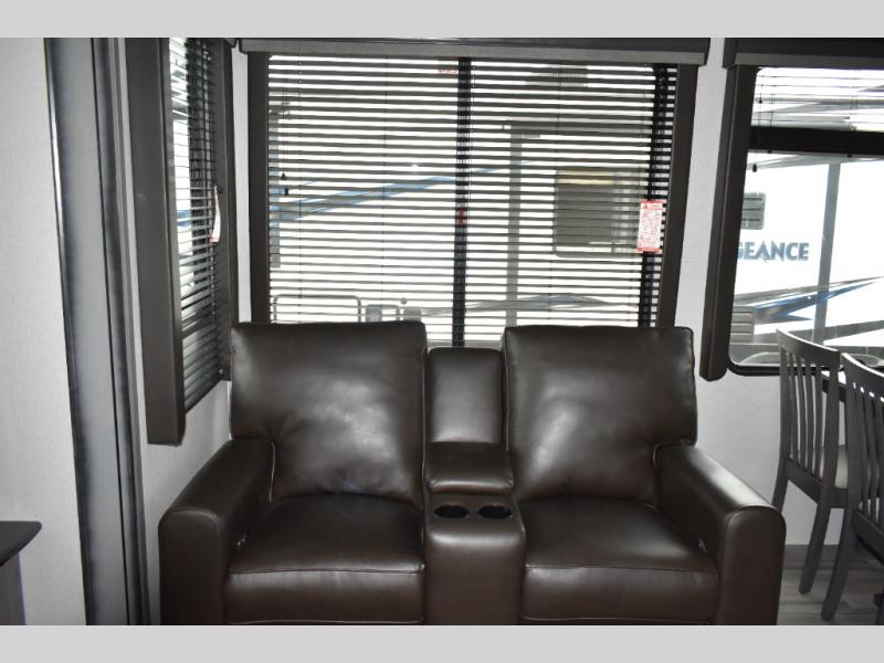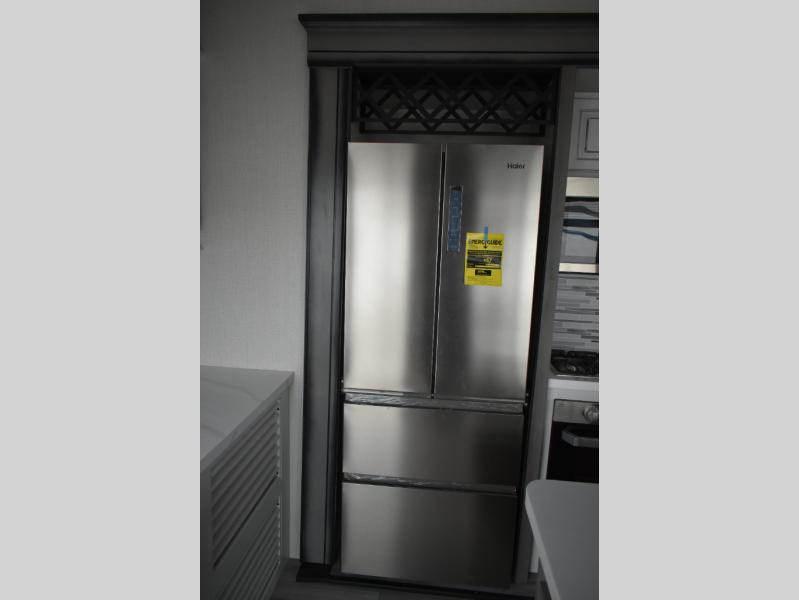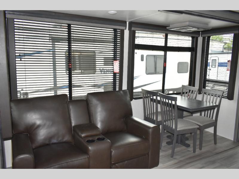 This spacious Keystone Retreat destination trailer has triple slides, two entry doors, and everything you need to have fun while away from home. The living area has plenty of space for entertaining guests. There is an HDTV in the living space for you to just pop in a movie on a cooler night, take a seat in the theatre seating, and enjoy making memories with your family. The cabinetry and storage areas in this unit, like the large wardrobe and bedroom vanity, are perfect for taking along as many items as you would like. You will also find the optional Luxury Package available on this model to be a brilliant addition!