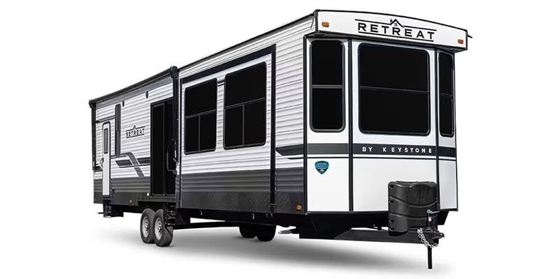 The Keystone Retreat destination trailer is a luxurious retreat in and of itself! You won't need to plan an extensive road trip because the Retreat gives you everything you need in one location. The spacious interiors include residential appliances and plenty of storage spaces for personal belongings, camp gear, food, and more! Whether you choose a Retreat with laminated or aluminum sidewalls, you're sure to enjoy extended stays to the fullest!
