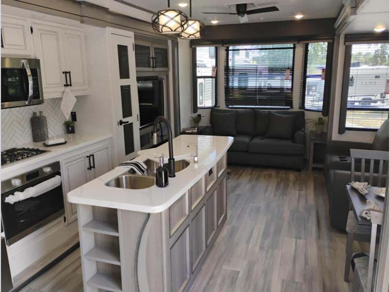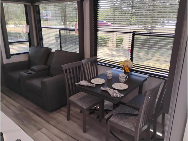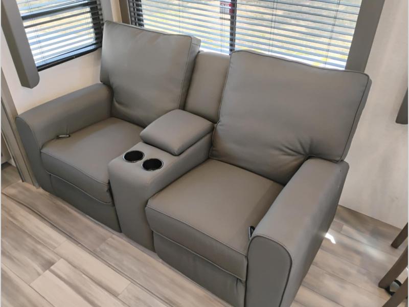This spacious Keystone Retreat destination trailer has triple slides, two entry doors, and everything you need to have fun while away from home. The living area has plenty of space for entertaining guests. There is an HDTV in the living space for you to just pop in a movie on a cooler night, take a seat in the theatre seating, and enjoy making memories with your family. The cabinetry and storage areas in this unit, like the large wardrobe and bedroom vanity, are perfect for taking along as many items as you would like. You will also find the optional Luxury Package available on this model to be a brilliant addition!