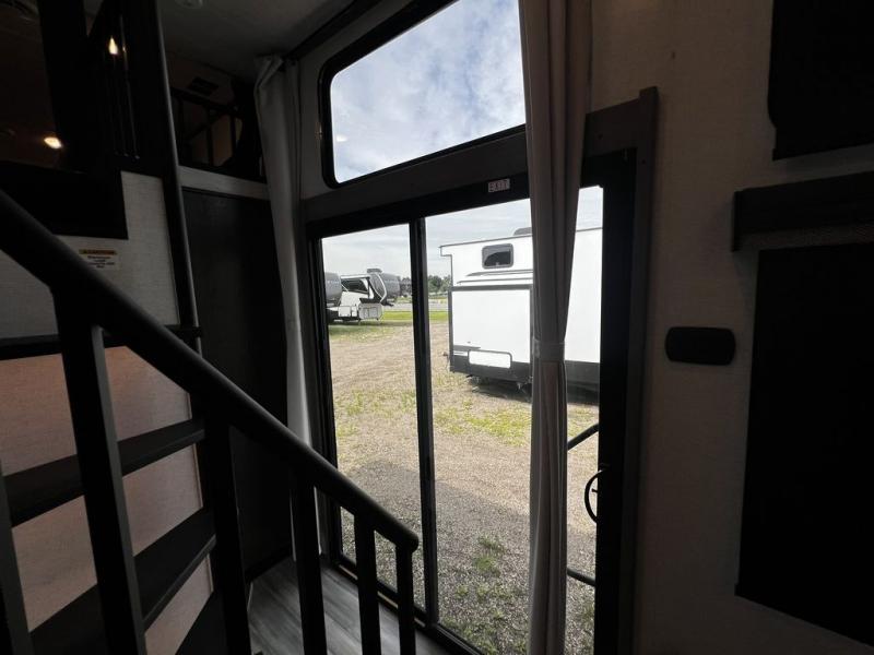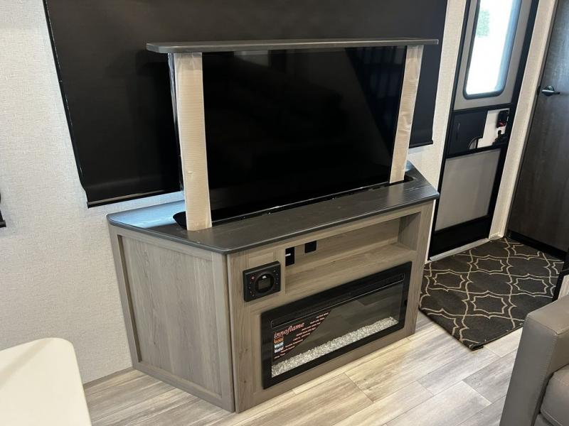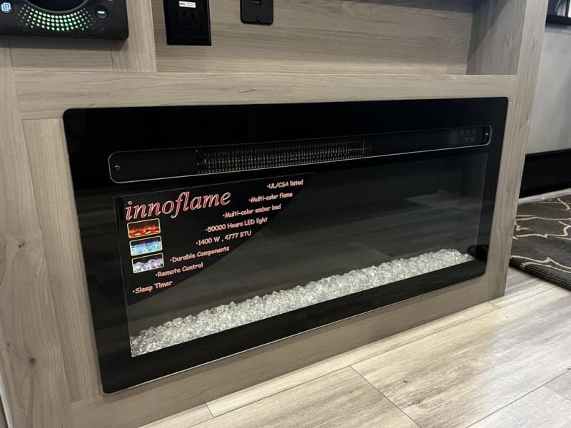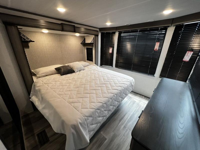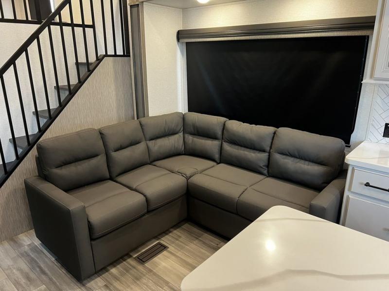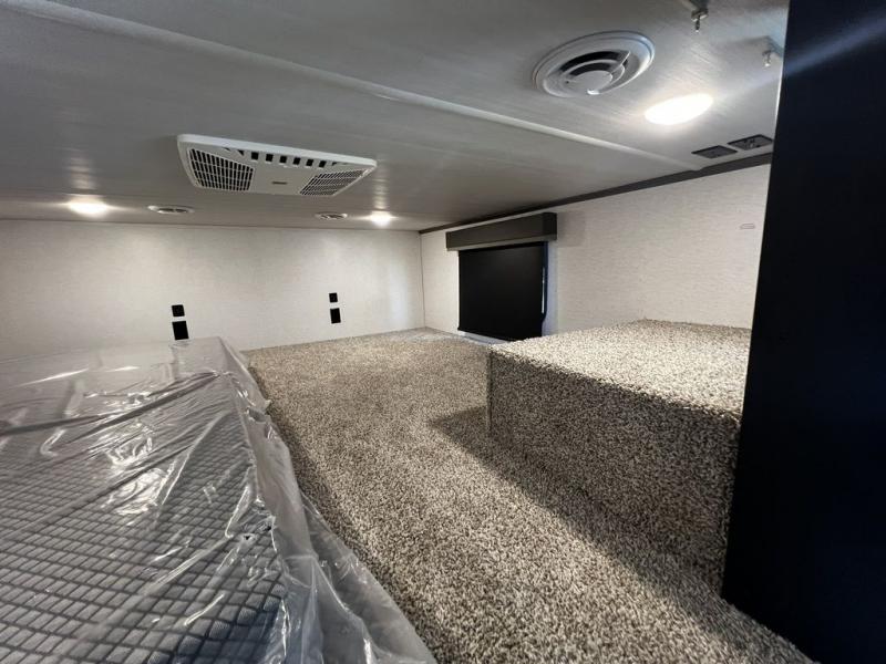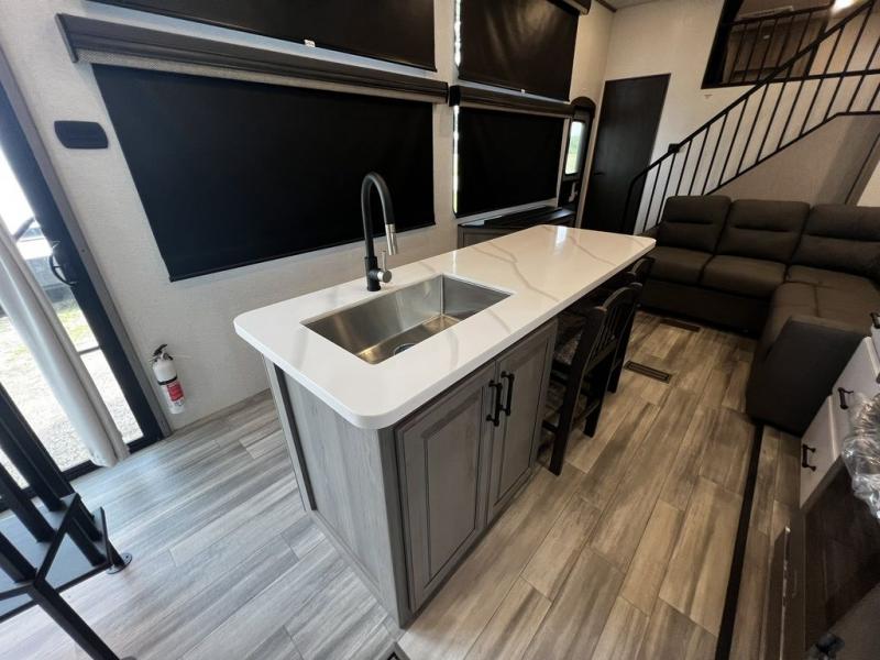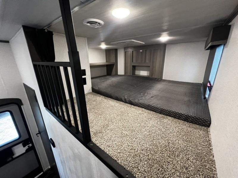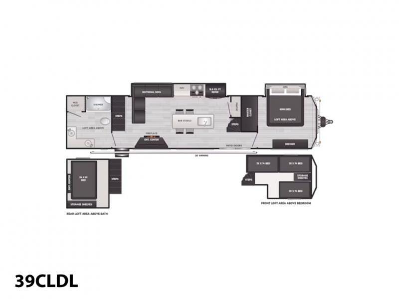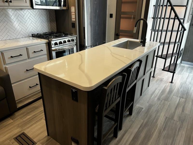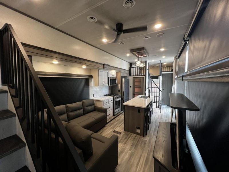 This destination trailer is so accommodating, you may just want to camp all year long! The owners will have the front bedroom all to themselves with a king bed slide out, dresser, and master closet so everything has a place. Above this room is the front loft with stairs that includes three 39" x 74" beds/sleeping spaces and storage shelves, making it perfect for little ones! The spacious full rear bath includes dual bath sinks, a large 48" x 30" shower with a seat, and a closet with washer/dryer prep if you want to add these appliances. And just outside the bath, you'll find the second set of stairs that leads to the rear loft with a 54" x 81" bed, an entertainment center, and storage shelves for your guests. During the day, everyone can meet in the combined living area and kitchen that features a large slide for more space, a sectional sofa, a kitchen island with four barstools, plus an entertainment center with a fireplace!