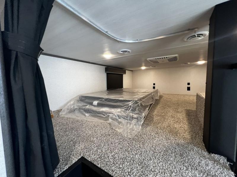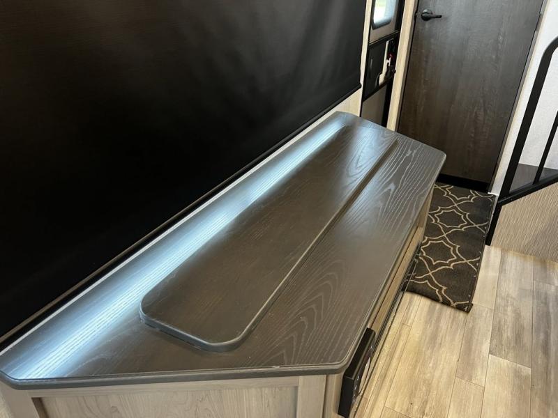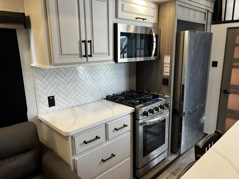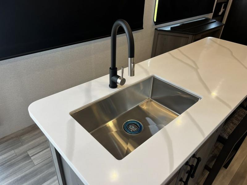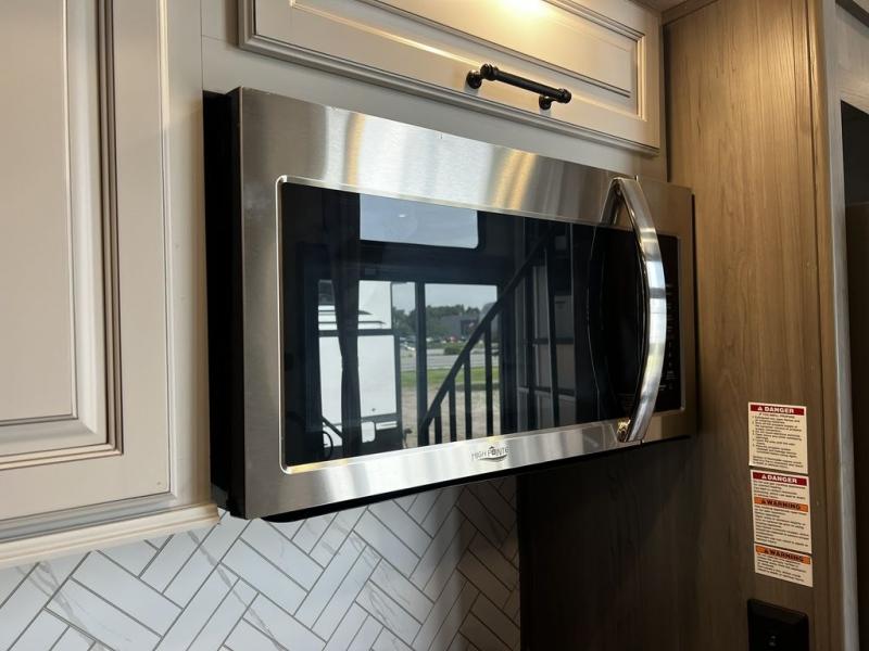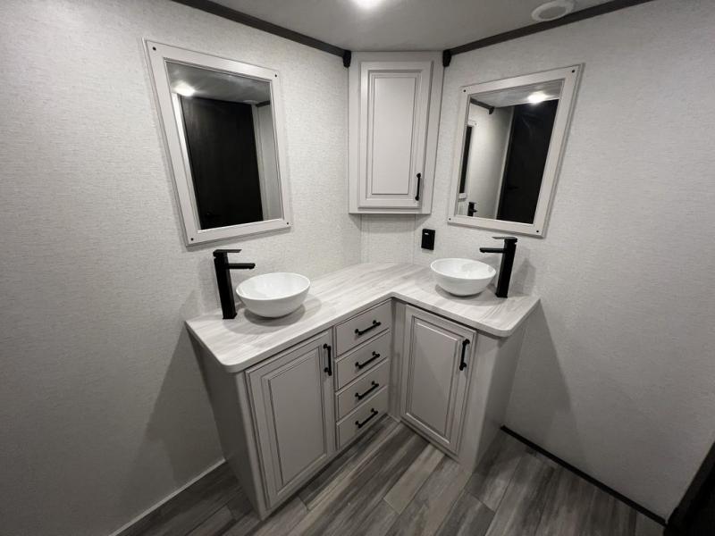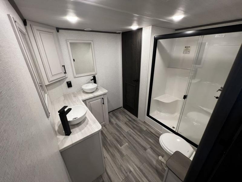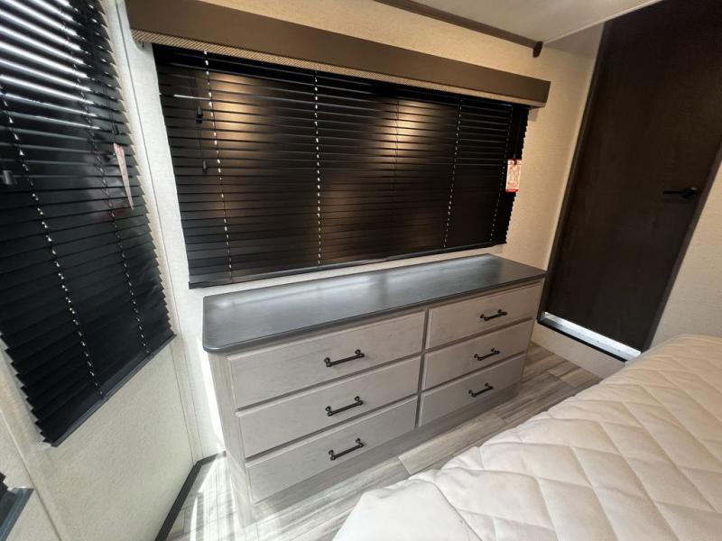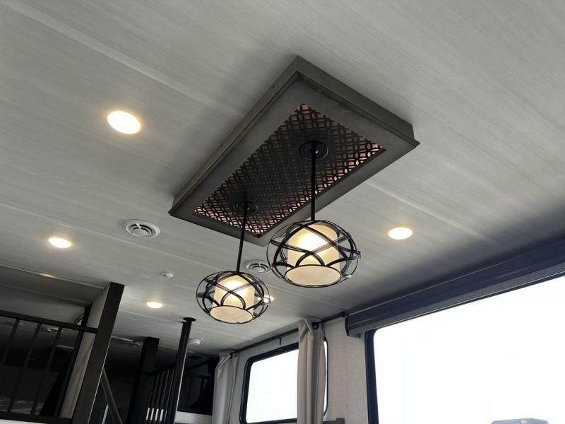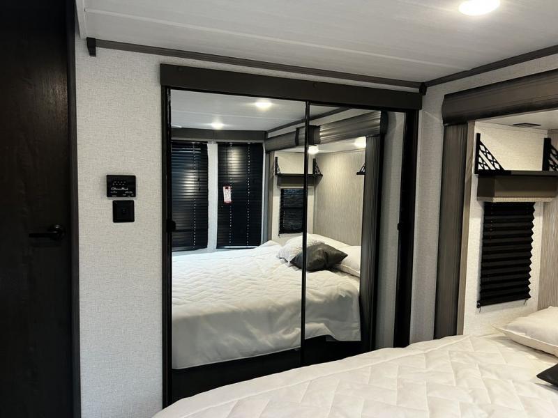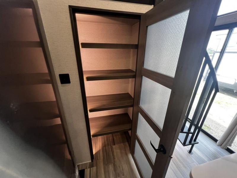 This destination trailer is so accommodating, you may just want to camp all year long! The owners will have the front bedroom all to themselves with a king bed slide out, dresser, and master closet so everything has a place. Above this room is the front loft with stairs that includes three 39" x 74" beds/sleeping spaces and storage shelves, making it perfect for little ones! The spacious full rear bath includes dual bath sinks, a large 48" x 30" shower with a seat, and a closet with washer/dryer prep if you want to add these appliances. And just outside the bath, you'll find the second set of stairs that leads to the rear loft with a 54" x 81" bed, an entertainment center, and storage shelves for your guests. During the day, everyone can meet in the combined living area and kitchen that features a large slide for more space, a sectional sofa, a kitchen island with four barstools, plus an entertainment center with a fireplace!