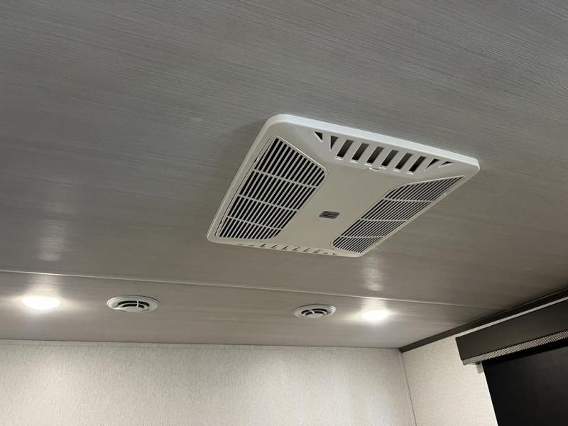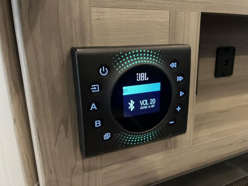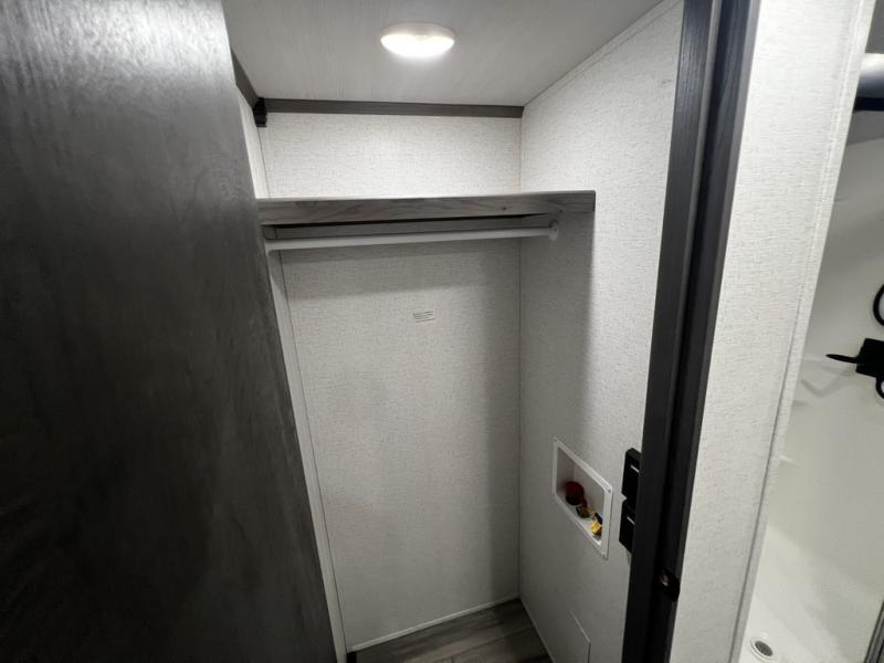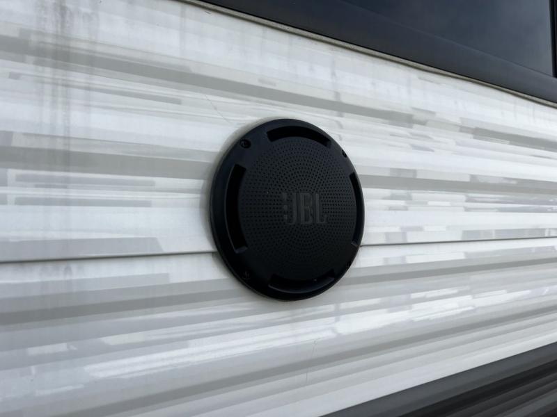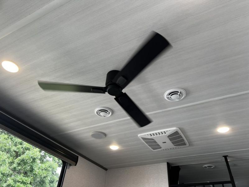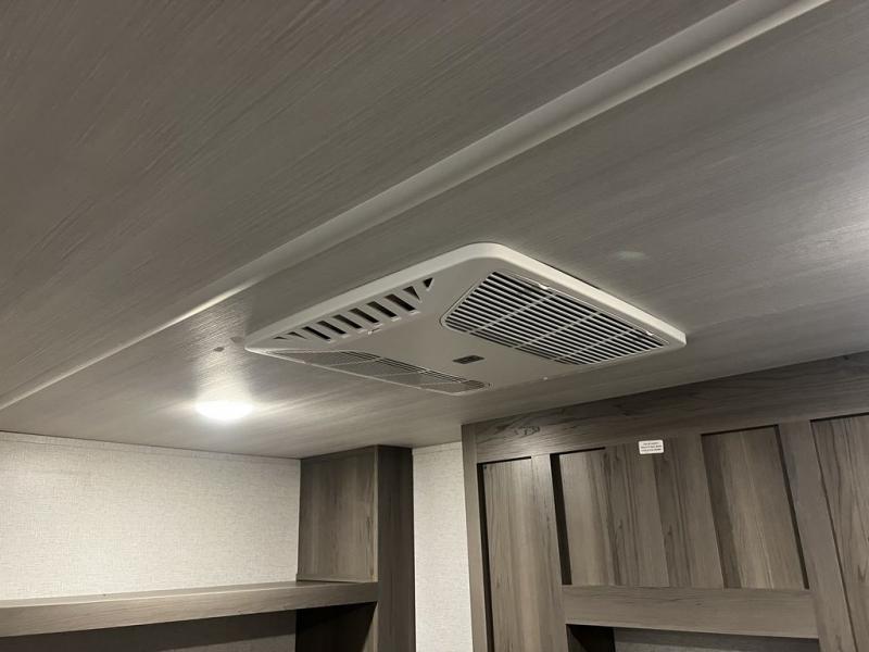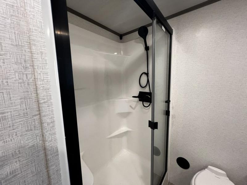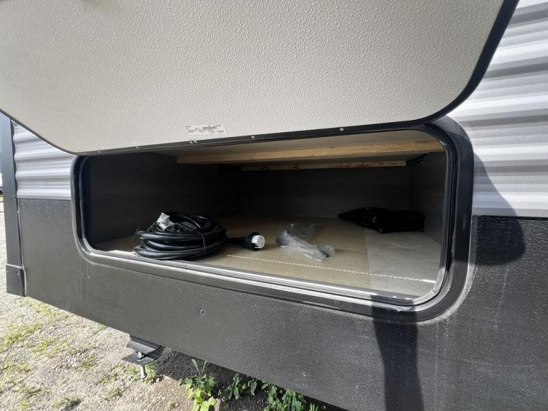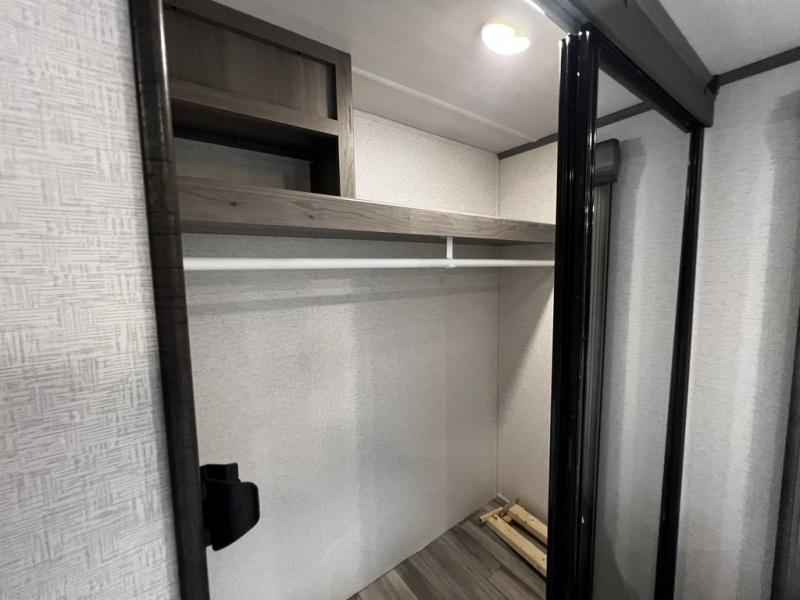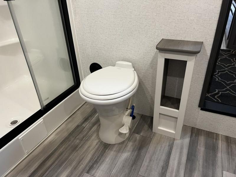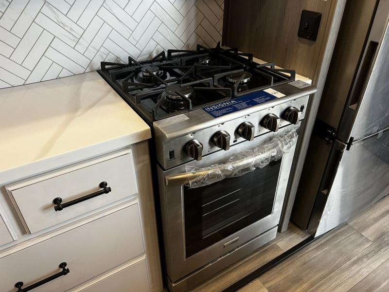 This destination trailer is so accommodating, you may just want to camp all year long! The owners will have the front bedroom all to themselves with a king bed slide out, dresser, and master closet so everything has a place. Above this room is the front loft with stairs that includes three 39" x 74" beds/sleeping spaces and storage shelves, making it perfect for little ones! The spacious full rear bath includes dual bath sinks, a large 48" x 30" shower with a seat, and a closet with washer/dryer prep if you want to add these appliances. And just outside the bath, you'll find the second set of stairs that leads to the rear loft with a 54" x 81" bed, an entertainment center, and storage shelves for your guests. During the day, everyone can meet in the combined living area and kitchen that features a large slide for more space, a sectional sofa, a kitchen island with four barstools, plus an entertainment center with a fireplace!