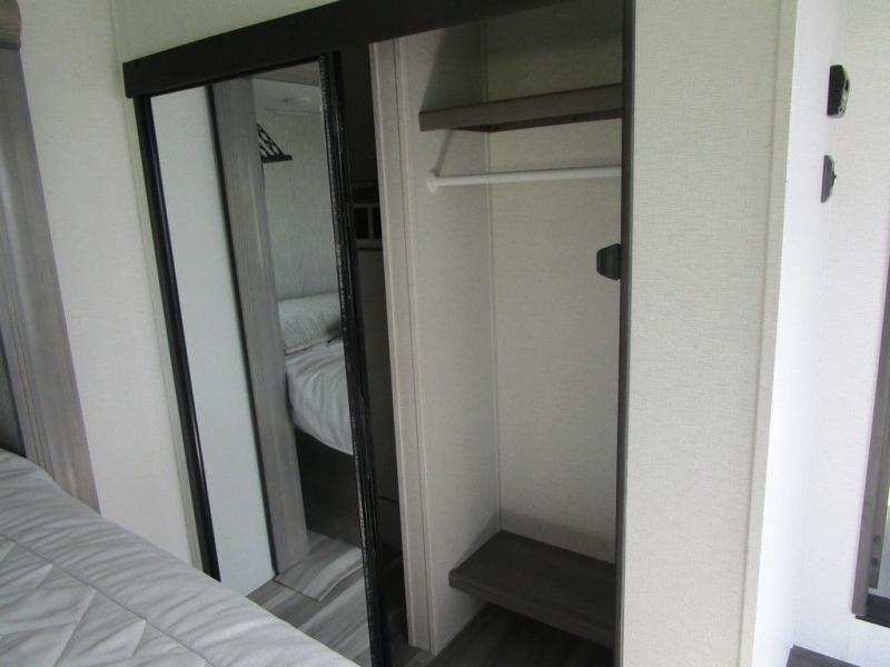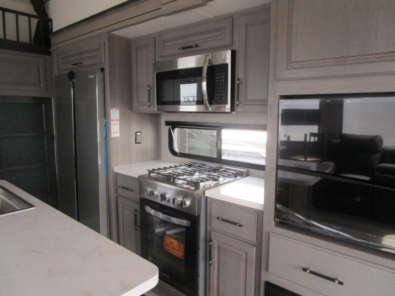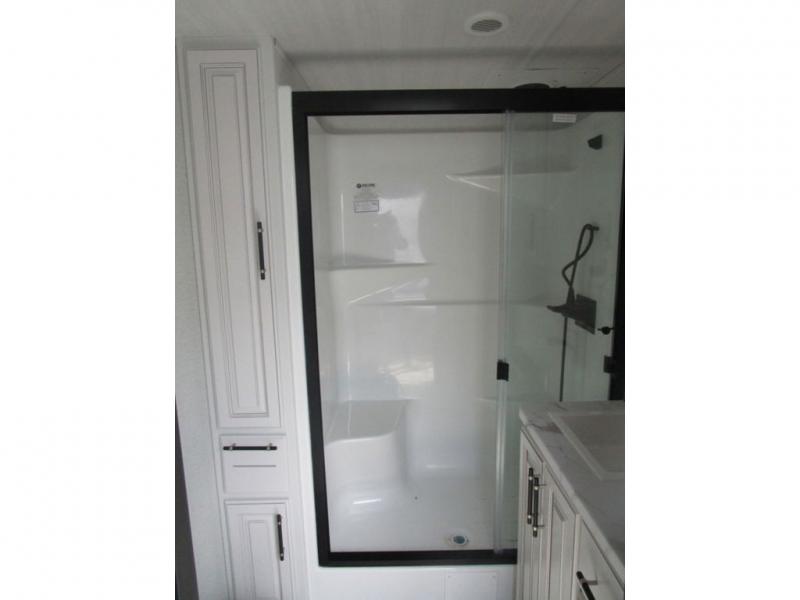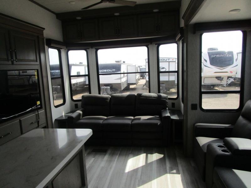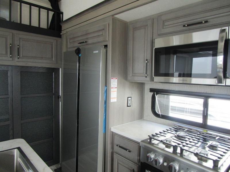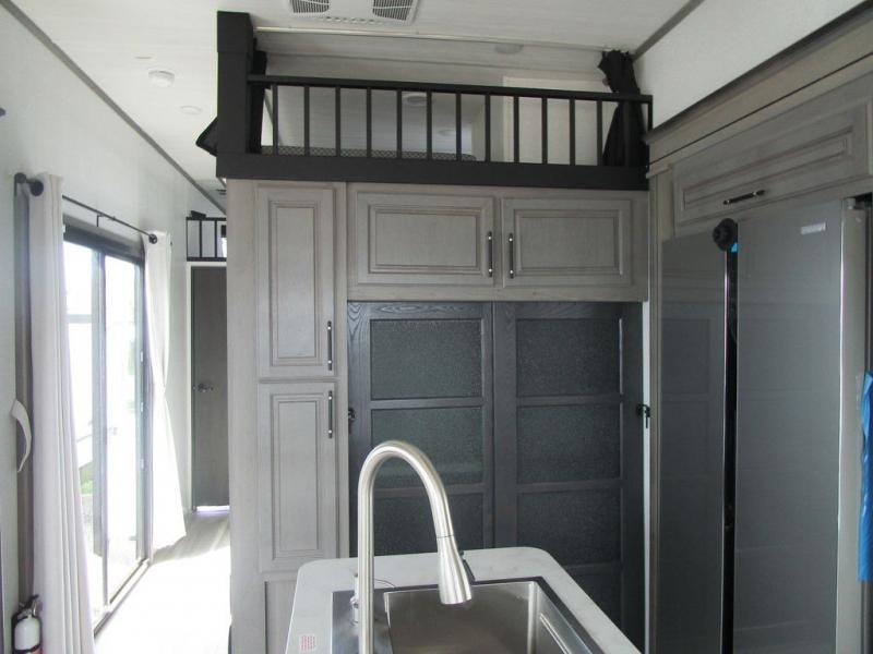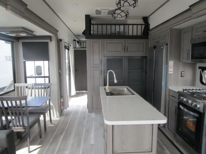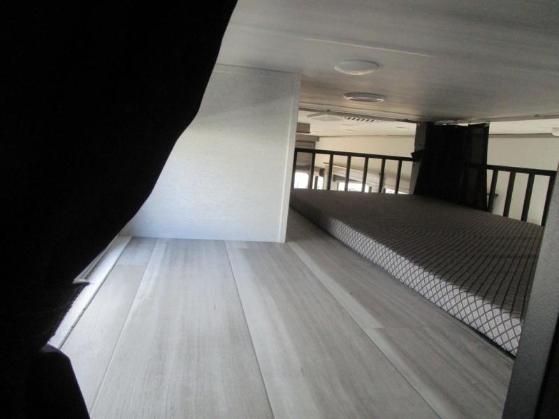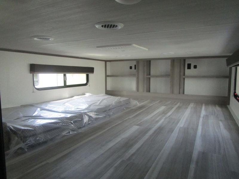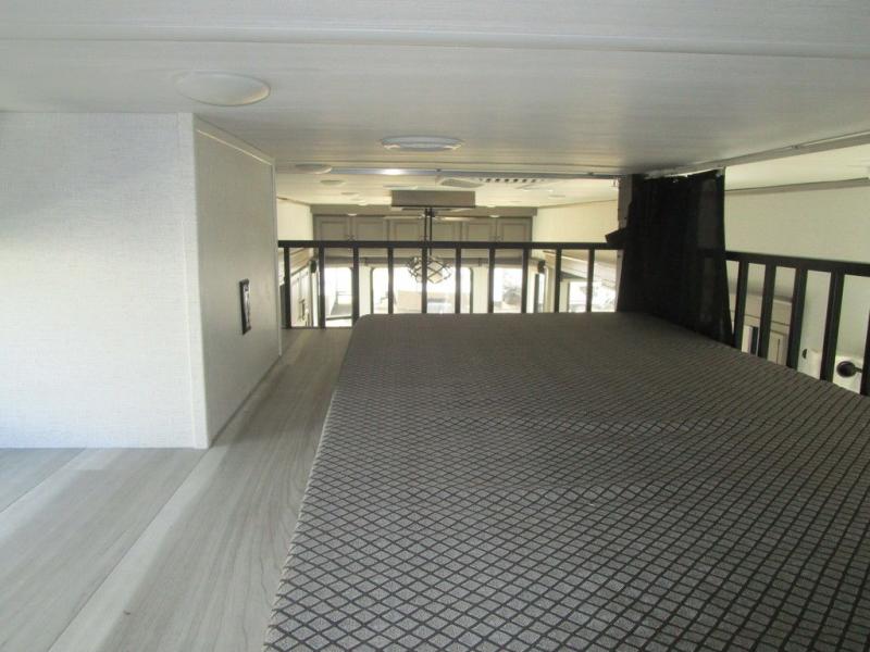 For the ultimate getaway retreat, you need this Retreat destination trailer! With its 15 cu. ft. refrigerator, three-burner range top, and shower with a seat, you will have all of the basic amenities needed for everyday living, but this model doesn't stop there. You will also find plenty of extra special touches added throughout the interior, like the king-size bed and master closet in the bedroom, the rear loft above the bedroom, and additional sleeping space on the pull-out sleeper sofa up front. You will also thoroughly enjoy the comfort of lounging back in the theater seating with an ice-cold beverage sitting in the cup holder while you watch a movie on the 50" LED TV.