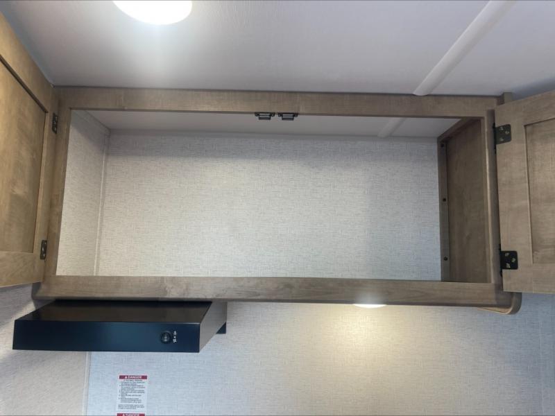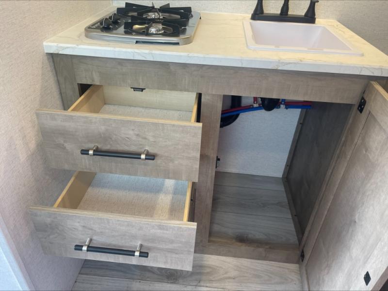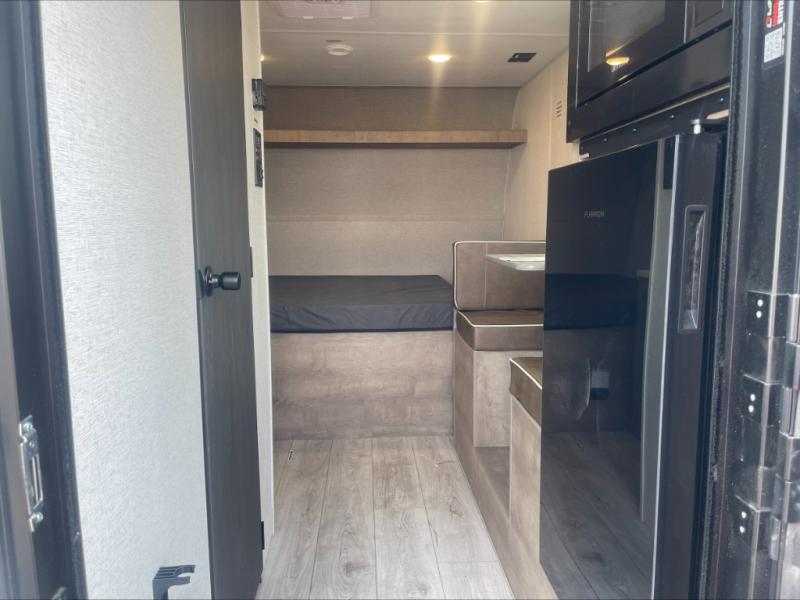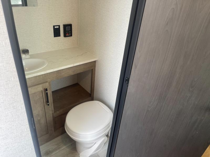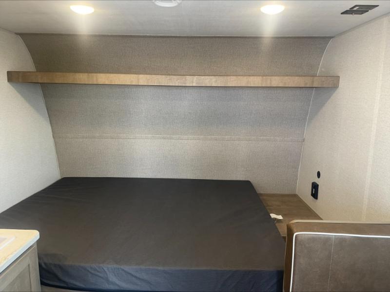 This is the perfect easy-to-tow travel trailer for three campers! The front queen bed includes a shelf above for books plus a closet and nightstand at the foot of the bed for even more storage. You can make meals each day on the two burner gas cooktop and store food in the 3.3 cu. ft. 12V refrigerator. A full bath onboard means you won't have to use the camp's facilities, and the exterior pass-thru storage will be perfect for hiking gear, camp chairs, and more!