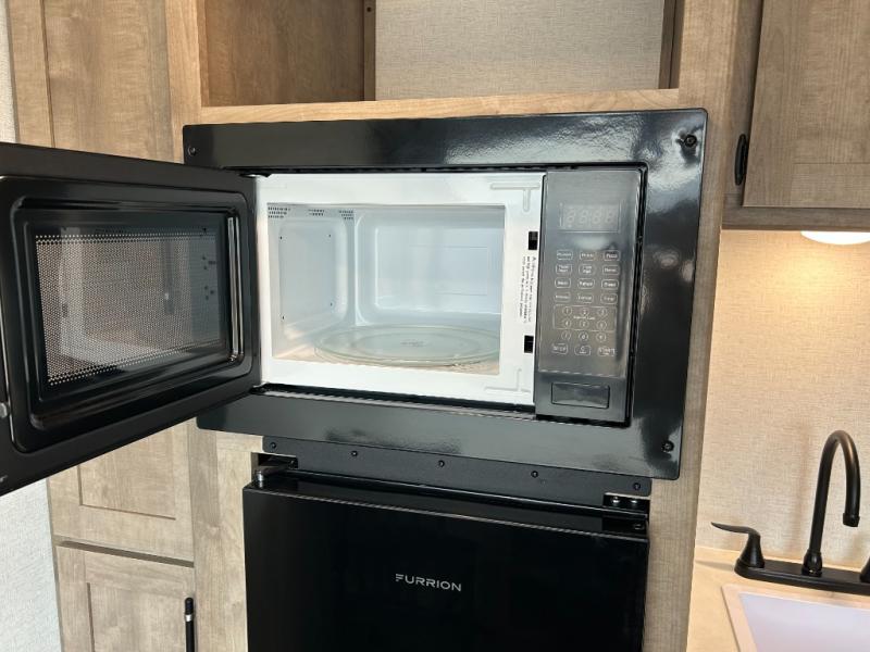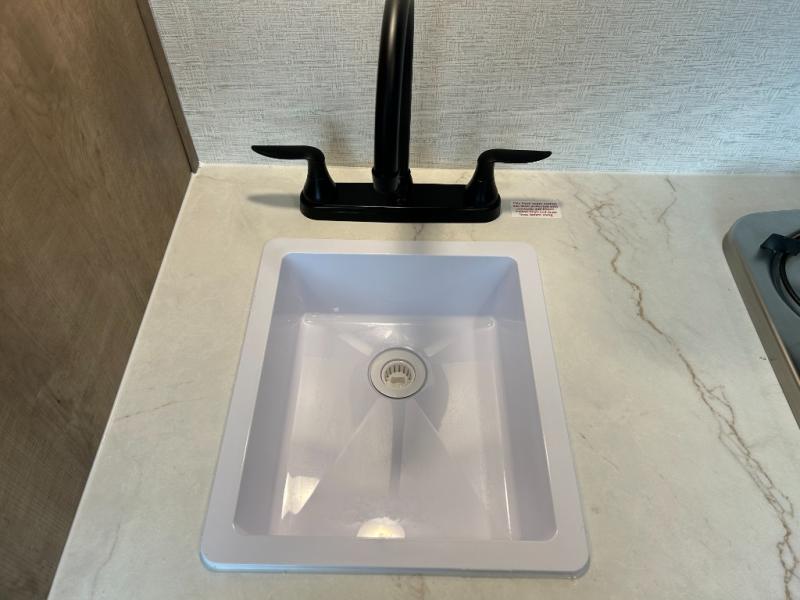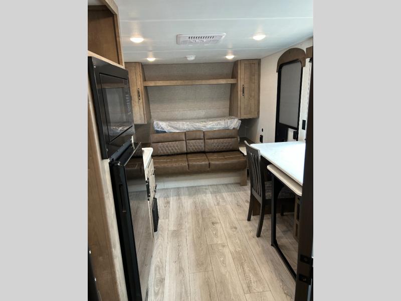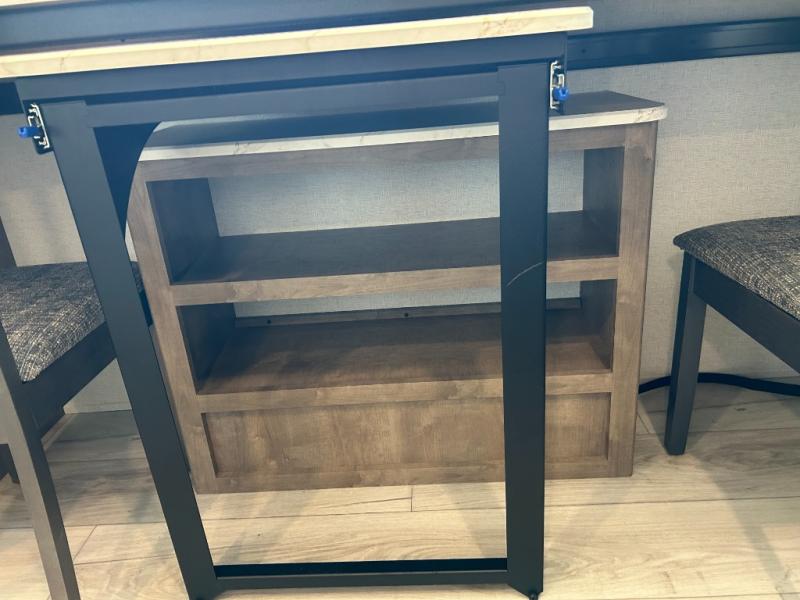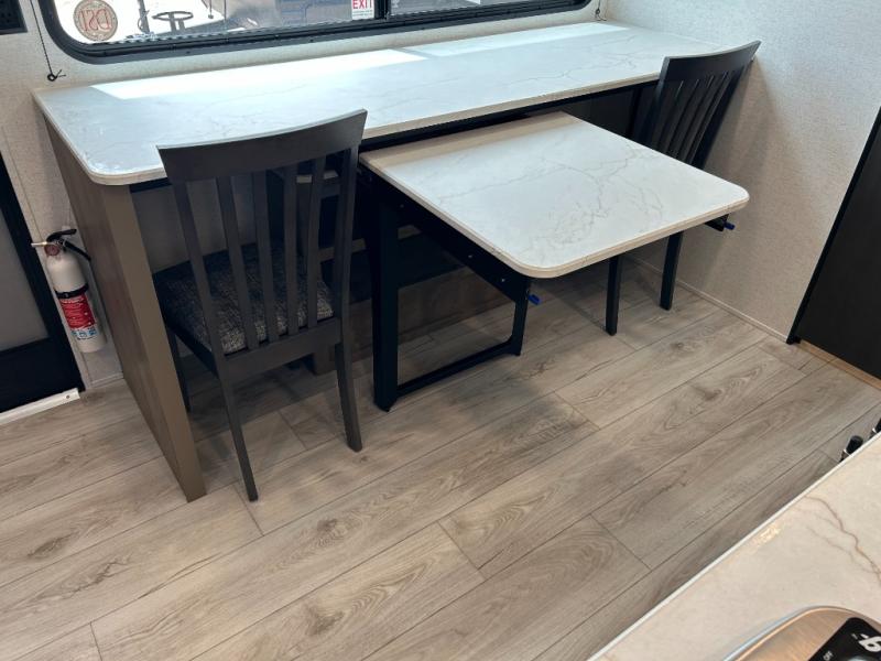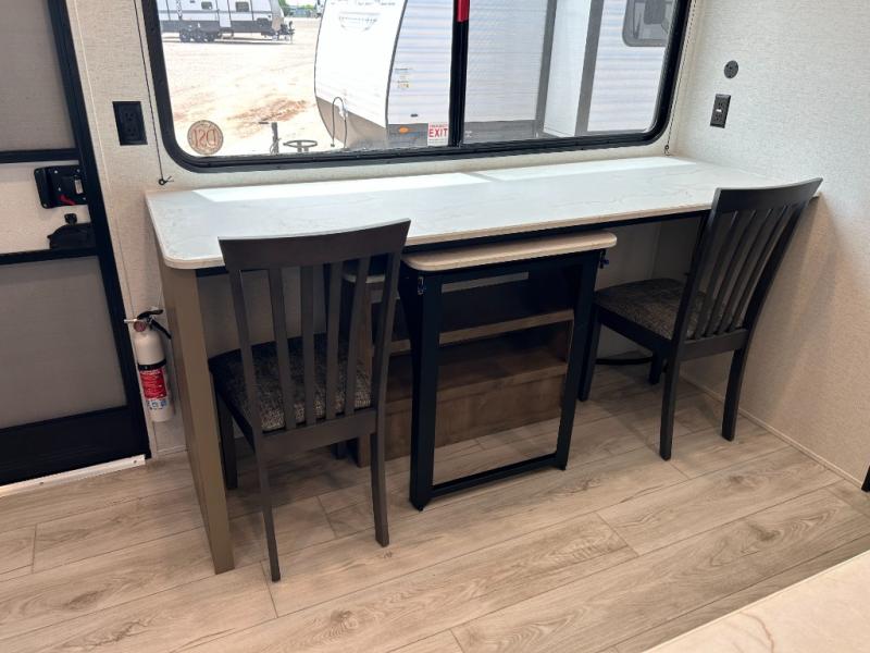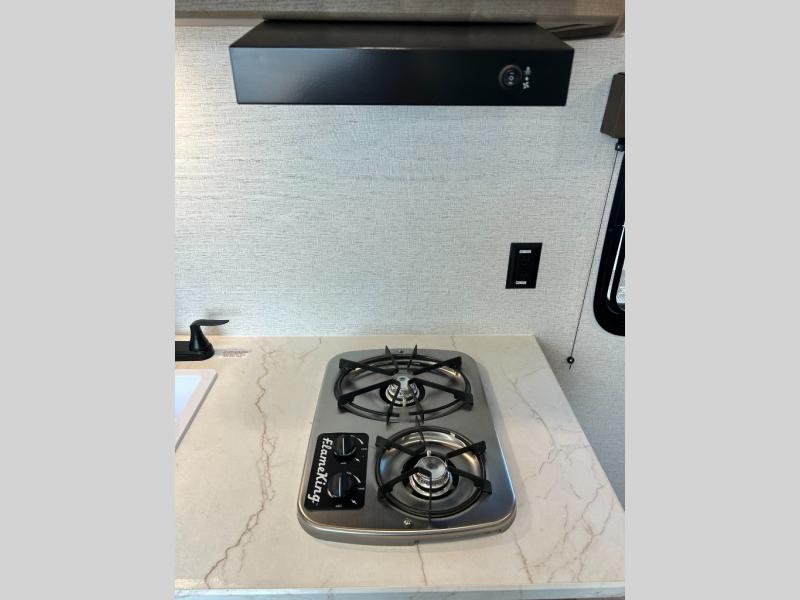 Time spent in this couple's trailer will be time well spent! You will love the amount of space you have each day since the queen Murphy bed can be put away to utilize the fold-down sofa. The chef of your group can make breakfast on the two burner gas cooktop and store leftovers in the 3.3 cu. ft. 12V refrigerator. The countertop with two chairs can be used as a desk or for dining space, and the full rear bath is sure to be appreciated!