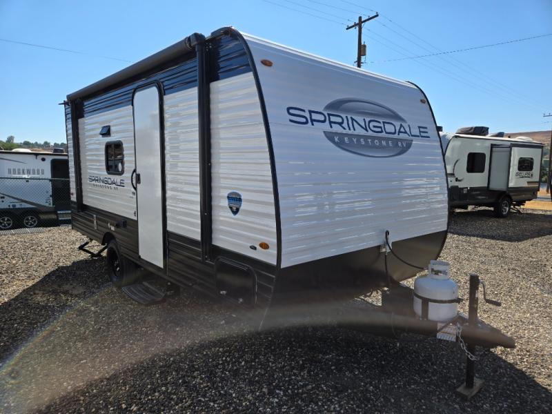 With any Springdale Classic Mini travel trailer by Keystone, you will enjoy lightweight towing thanks to their single-axle! You'll find the XL entry assist handle will make entering and exiting your unit easier than ever, and the power awning will provide protection from the sun as you relax in your camp chairs outside. Each model includes blackout night shades, solid wood cabinet doors and drawers, a shower skylight for more standing room, plus many more interior comforts. There is also a 5,000 BTU sidewall A/C and 20K BTU furnace to keep you comfortable, plus a Girard tankless water heater for endless hot showers!