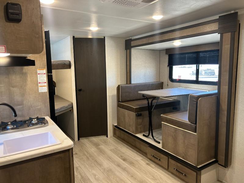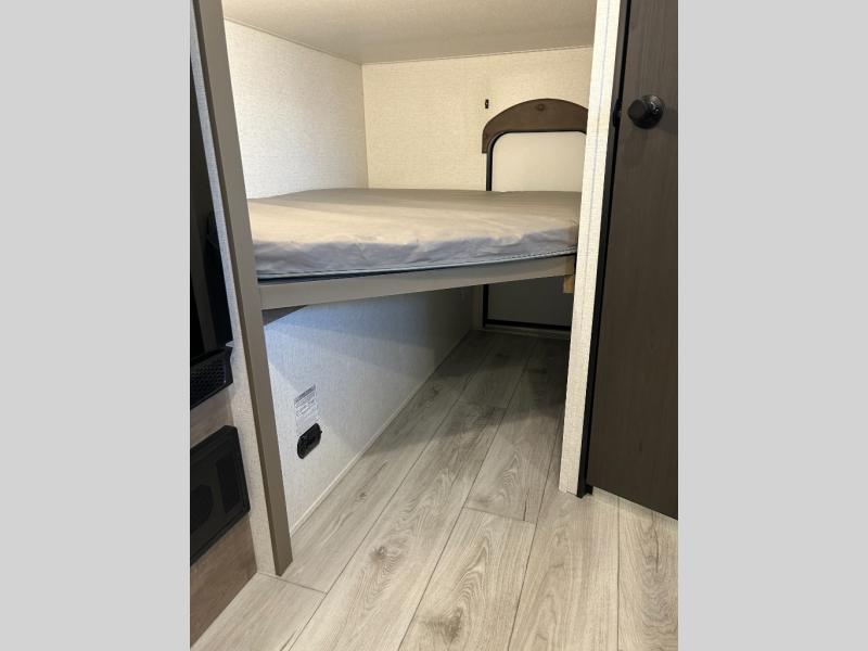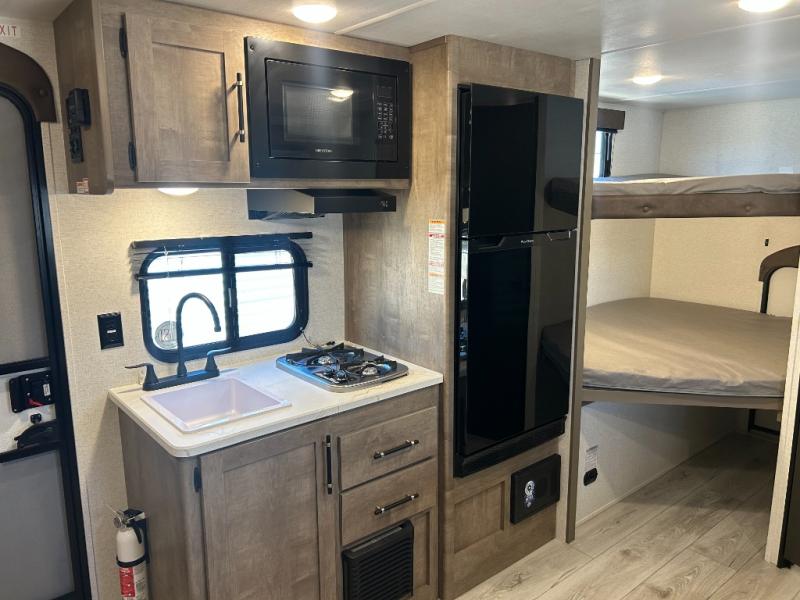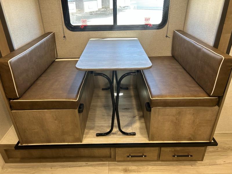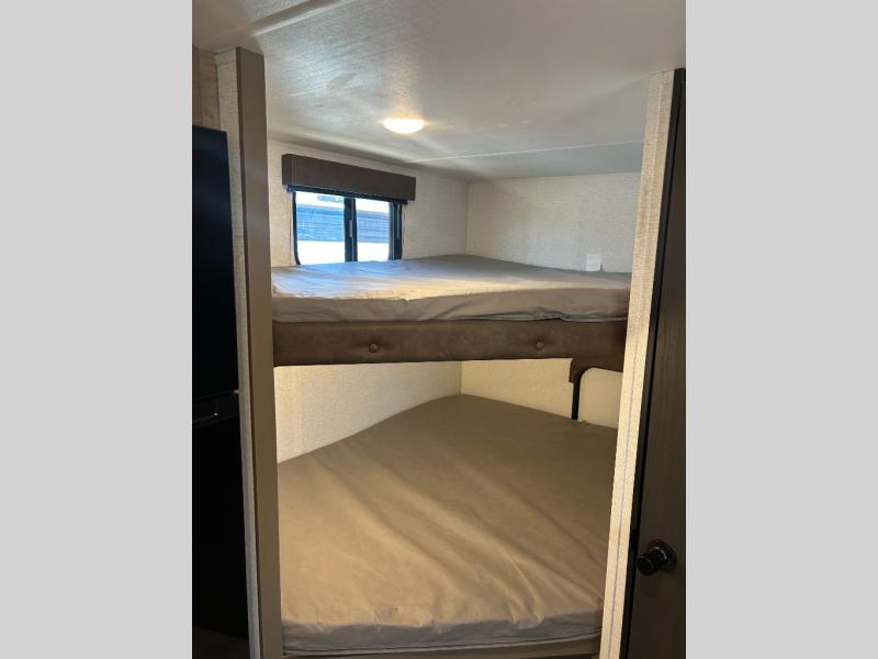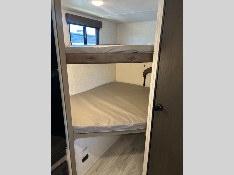 This cute Springdale Classic Mini bunk model will easily sleep seven with the double-size bunks, booth dinette slide, and queen Murphy bed which features a fold-down sofa at the end. During the daytime, you can have the seating you need and want, and at night the sofa folds to become part of the front bed. The rear corner bath is convenient and features a tub/shower, toilet, and sink. The kitchen is fully equipped to allow you to cook as you travel. Enjoy them while under the 15' power awning. A handy pass-thru storage compartment up front offers ample space for camp equipment, and there is additional storage accessible beneath the bunk in back.