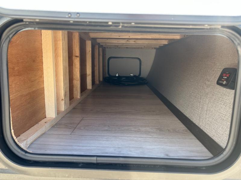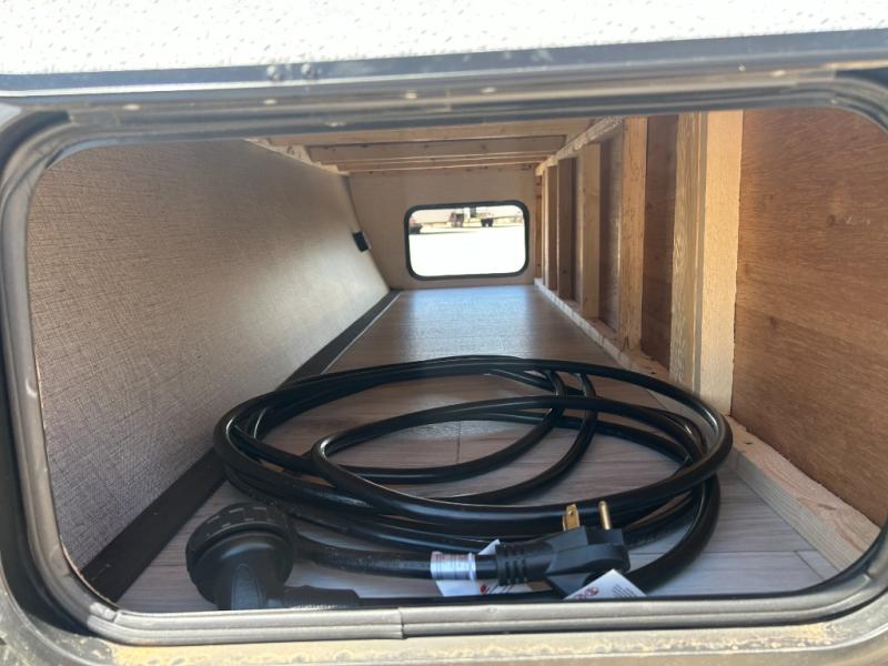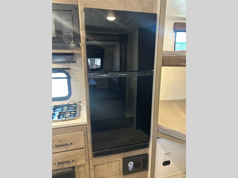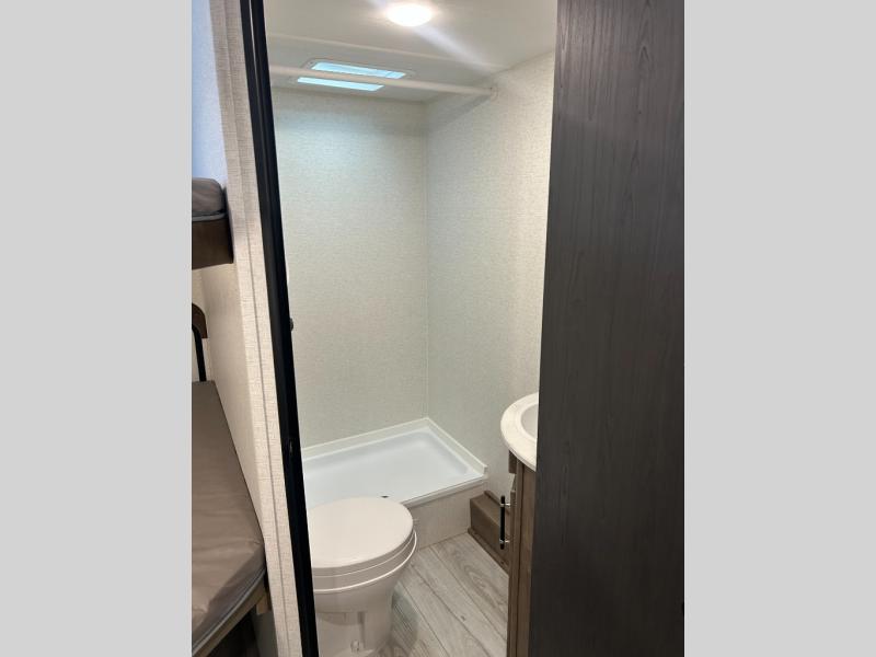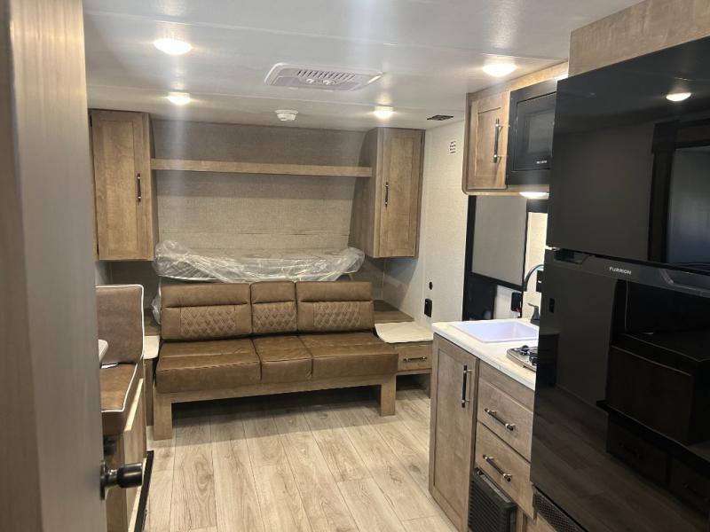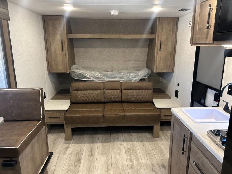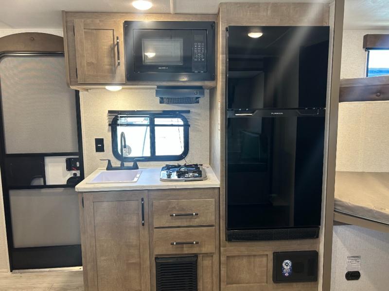 This cute Springdale Classic Mini bunk model will easily sleep seven with the double-size bunks, booth dinette slide, and queen Murphy bed which features a fold-down sofa at the end. During the daytime, you can have the seating you need and want, and at night the sofa folds to become part of the front bed. The rear corner bath is convenient and features a tub/shower, toilet, and sink. The kitchen is fully equipped to allow you to cook as you travel. Enjoy them while under the 15' power awning. A handy pass-thru storage compartment up front offers ample space for camp equipment, and there is additional storage accessible beneath the bunk in back.