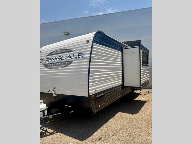 With any Springdale Classic Mini travel trailer by Keystone, you will enjoy lightweight towing thanks to their single-axle! You'll find the XL entry assist handle will make entering and exiting your unit easier than ever, and the power awning will provide protection from the sun as you relax in your camp chairs outside. Each model includes blackout night shades, solid wood cabinet doors and drawers, a shower skylight for more standing room, plus many more interior comforts. There is also a 5,000 BTU sidewall A/C and 20K BTU furnace to keep you comfortable, plus a Girard tankless water heater for endless hot showers!