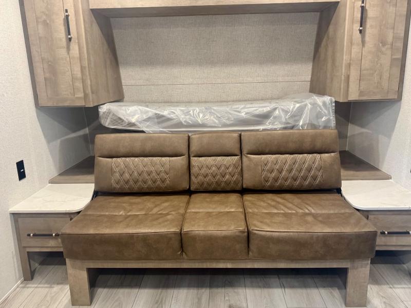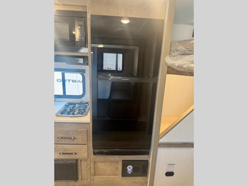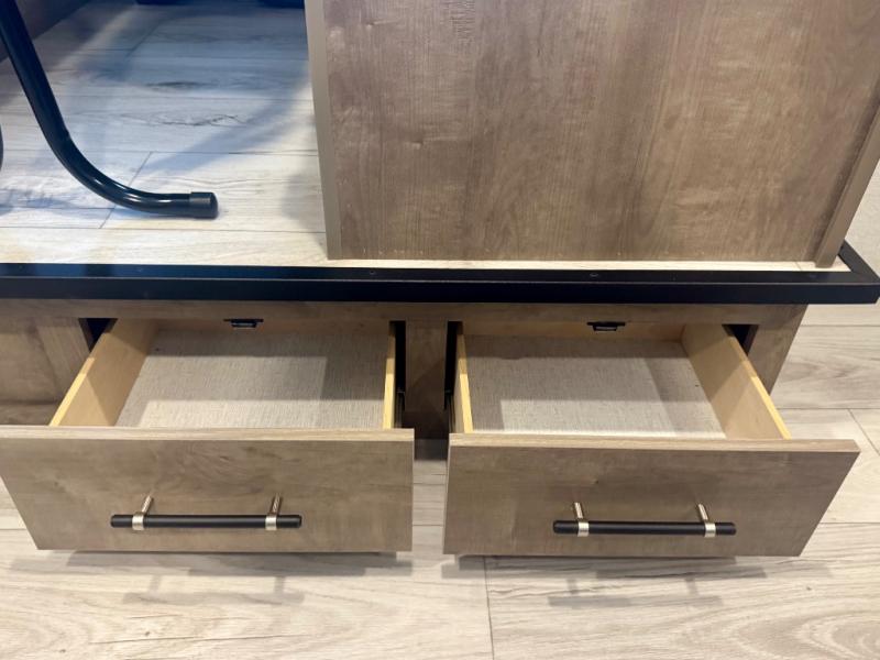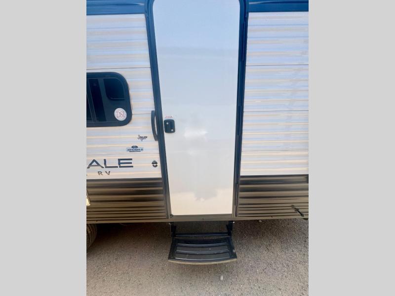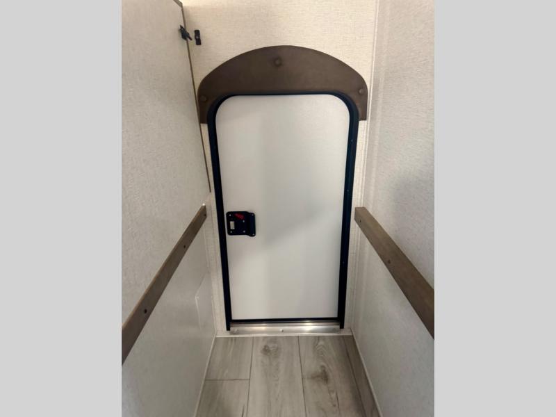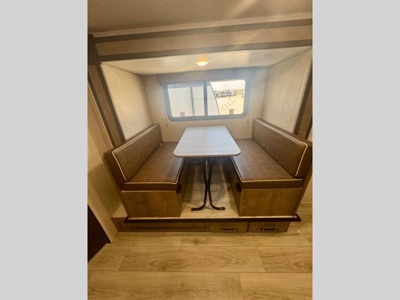 This cute Springdale Classic Mini bunk model will easily sleep seven with the double-size bunks, booth dinette slide, and queen Murphy bed which features a fold-down sofa at the end. During the daytime, you can have the seating you need and want, and at night the sofa folds to become part of the front bed. The rear corner bath is convenient and features a tub/shower, toilet, and sink. The kitchen is fully equipped to allow you to cook as you travel. Enjoy them while under the 15' power awning. A handy pass-thru storage compartment up front offers ample space for camp equipment, and there is additional storage accessible beneath the bunk in back.