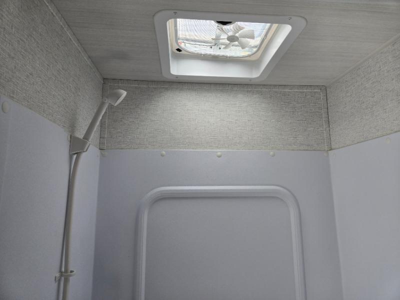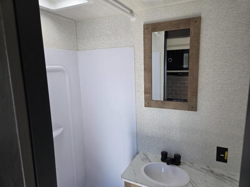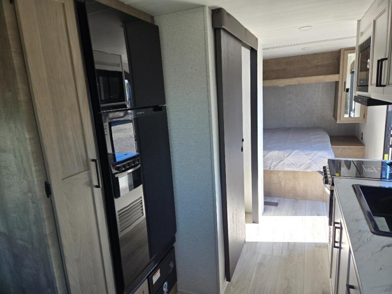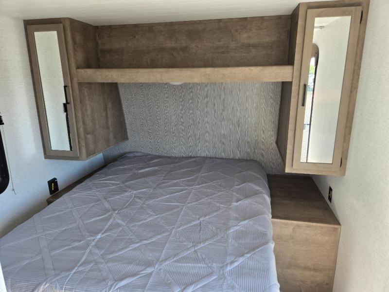 This trailer is perfect for your crew of four to six. There is a queen bed in the semi-private bedroom, along with dual closets and nightstands to keep your things tidy. You can dine each day on the booth dinette, relax on the sofa, and house additional guests here at night. The kitchen includes everything you need to prepare meals each day, including a gas range, microwave, and a 10 cu. ft. 12V refrigerator for cold items. And the full bath on board lets you stay clean throughout each camping trip!
