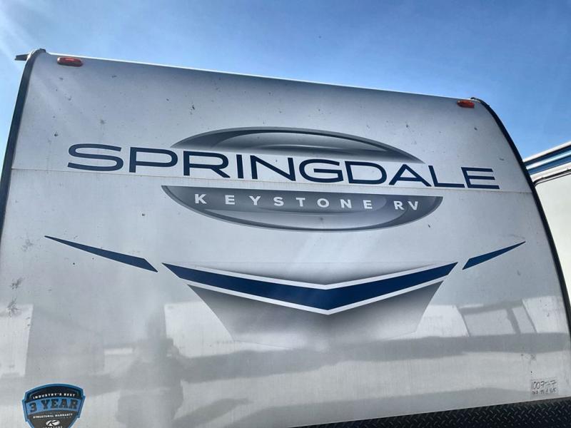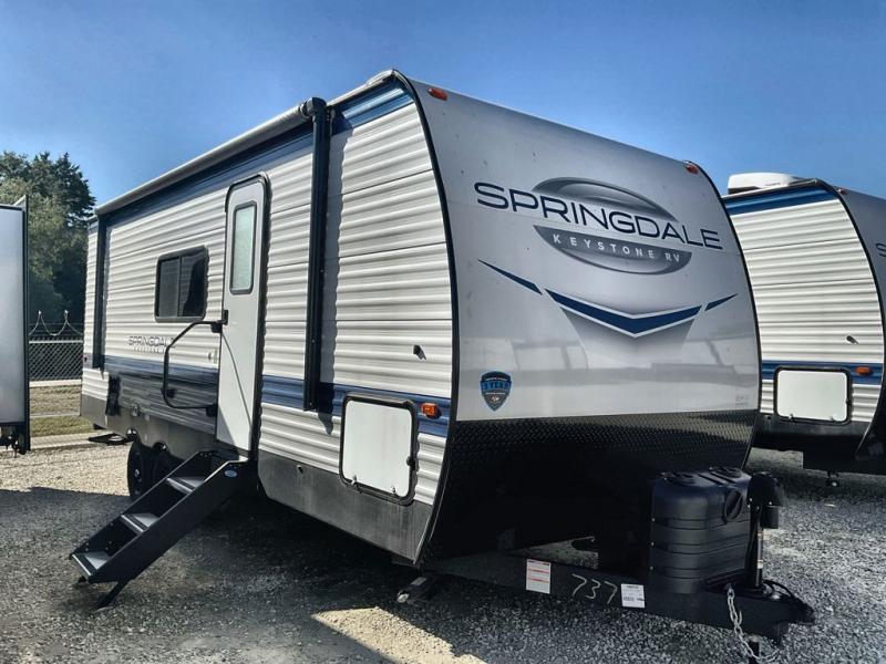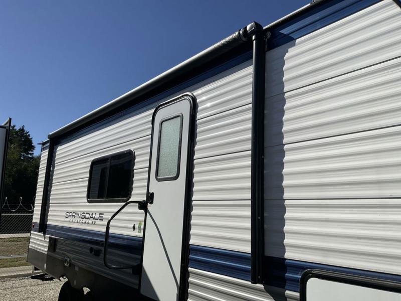 With any Springdale travel trailer by Keystone you will enjoy convenient amenities and comfortable camping features at every turn. The aluminum exterior will be easy to clean, and the power awning provides protection against the hot summer sun. There is also an exterior shower, a friction hinge entry door, and an XL entry assist handle to safely enter and exit the unit. You will find many comforts inside, including a stainless steel sink, ample storage space for your belongings, and cozy sleeping spaces. Start a new adventure today in a Springdale travel trailer!