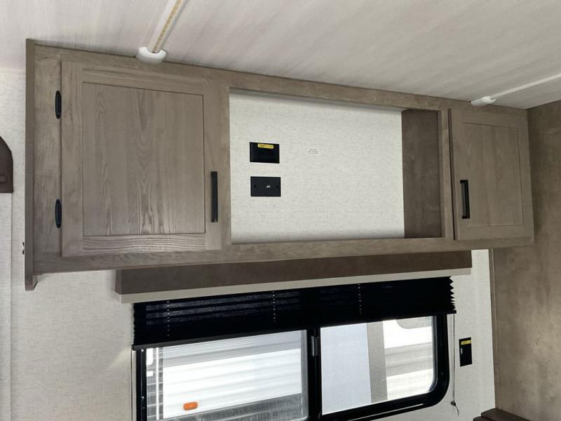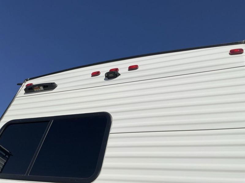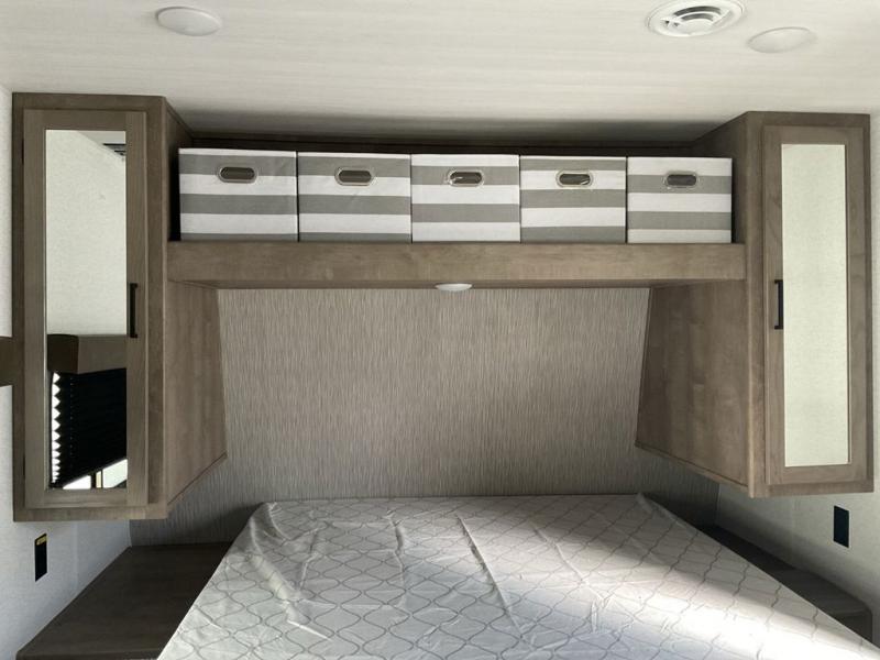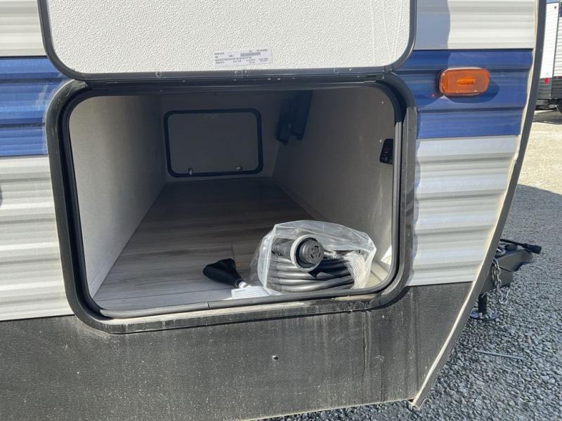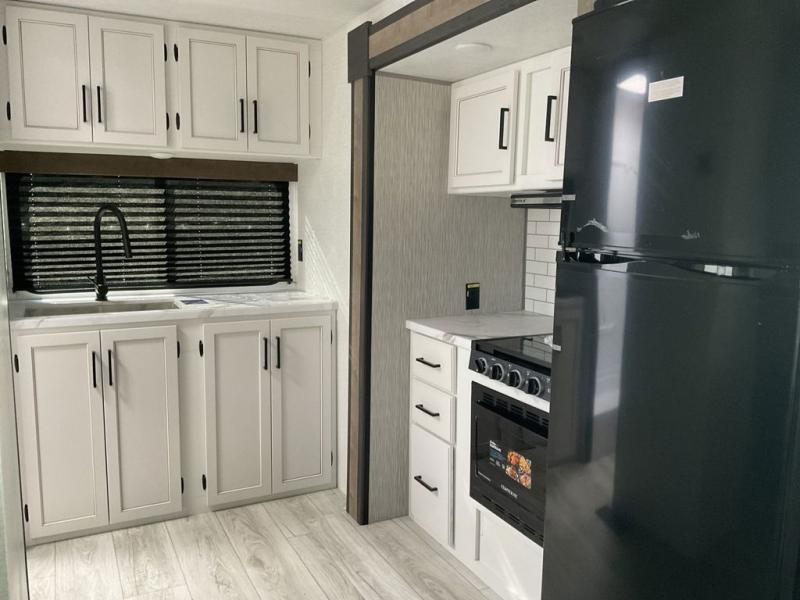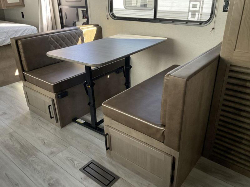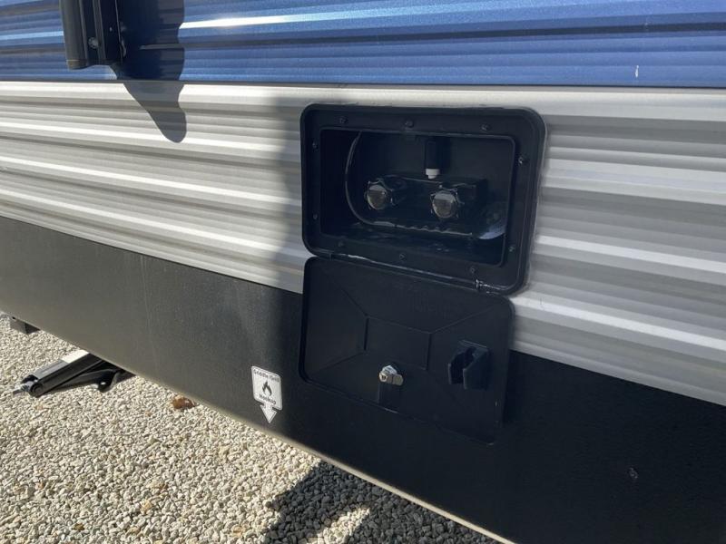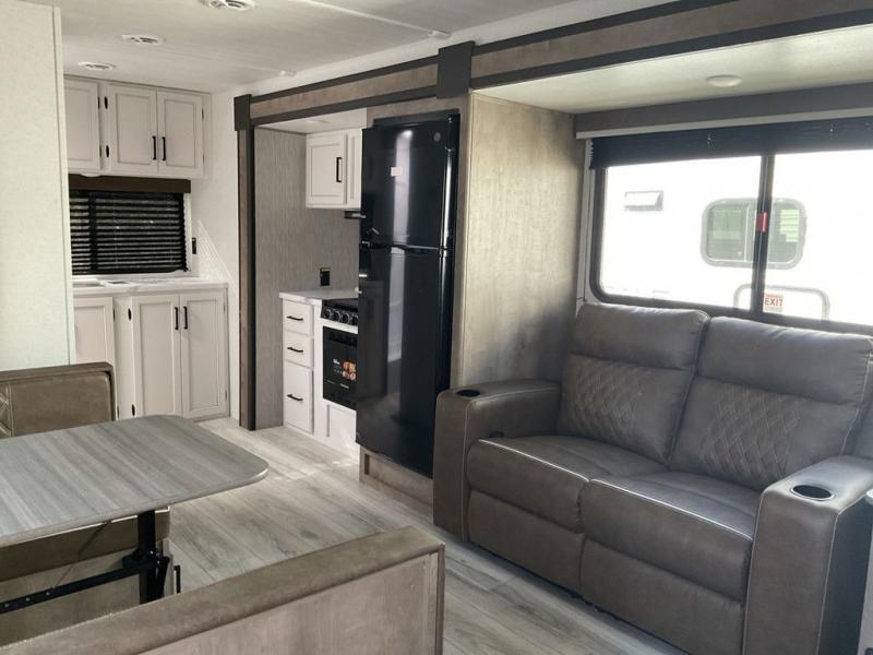 Trips to your favorite camping spot just got better in this open concept travel trailer. The large slide out houses the sofa with an end table, three burner cooktop, refrigerator, and overhead cabinet for storage. You can clean up each day in the rear corner full bath with a sliding door to save on space, and the other rear corner includes the spacious sink and counter space to prep meals. A booth dinette provides a place to dine, play games, and even let a guest sleep over. When you're ready to sleep, the queen bed up front is sure to bring a great night's rest, and there is a privacy curtain here for added convenience. You are sure to appreciate the laundry chute that allows you to throw clothes directly into the pass-through storage!