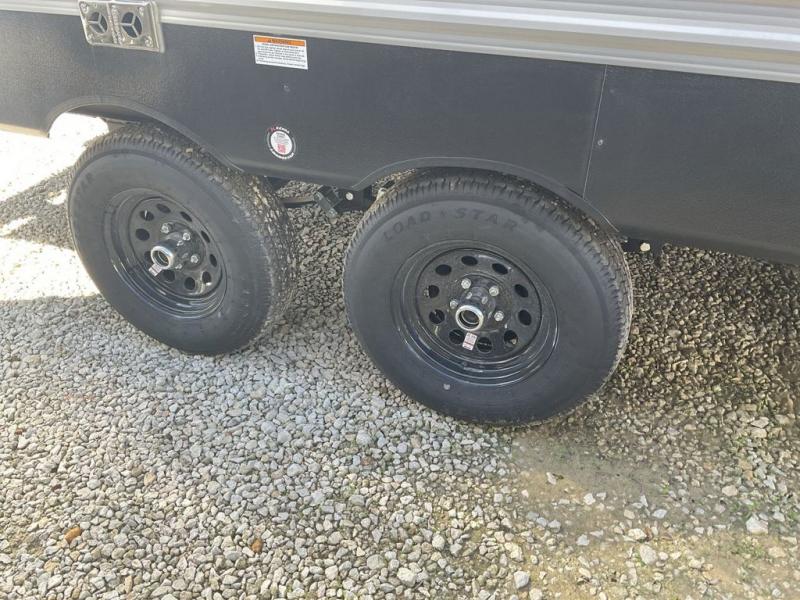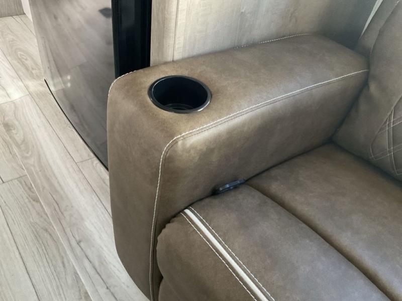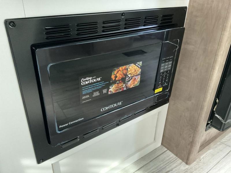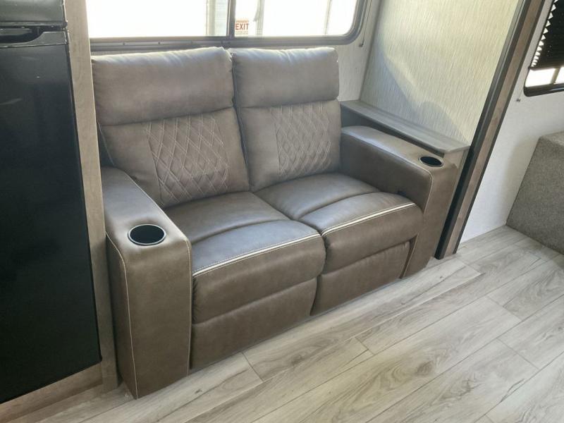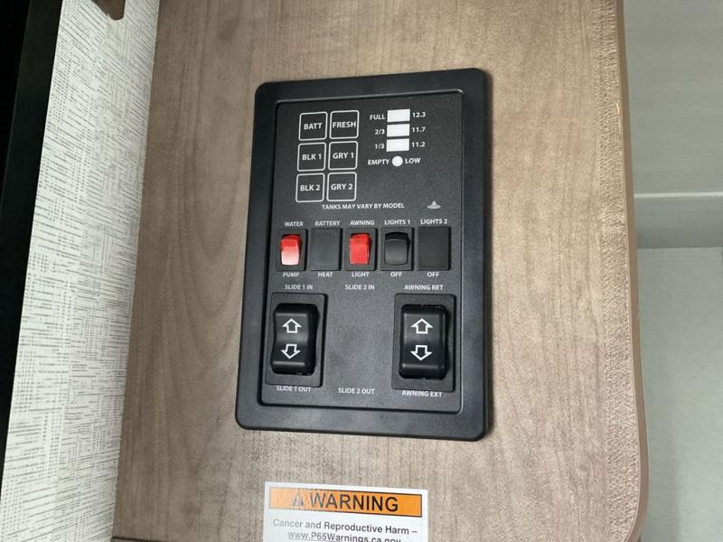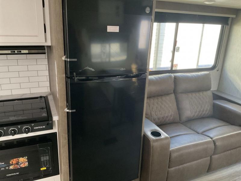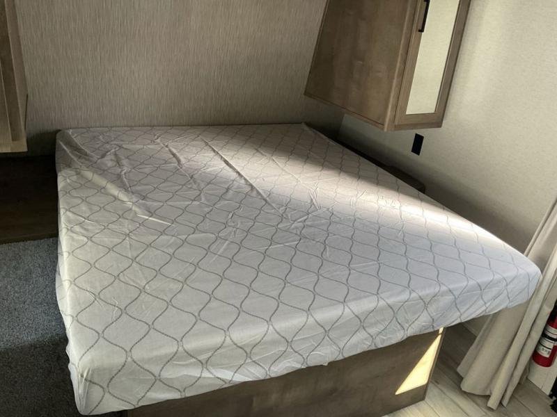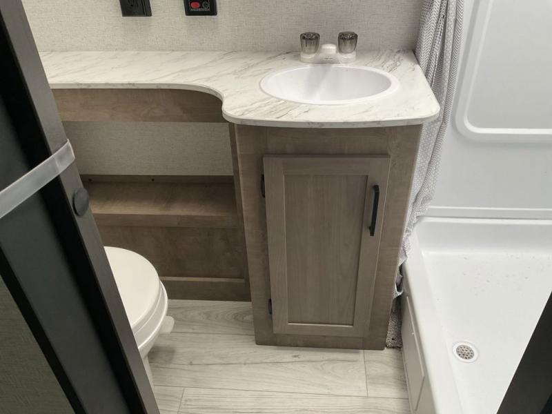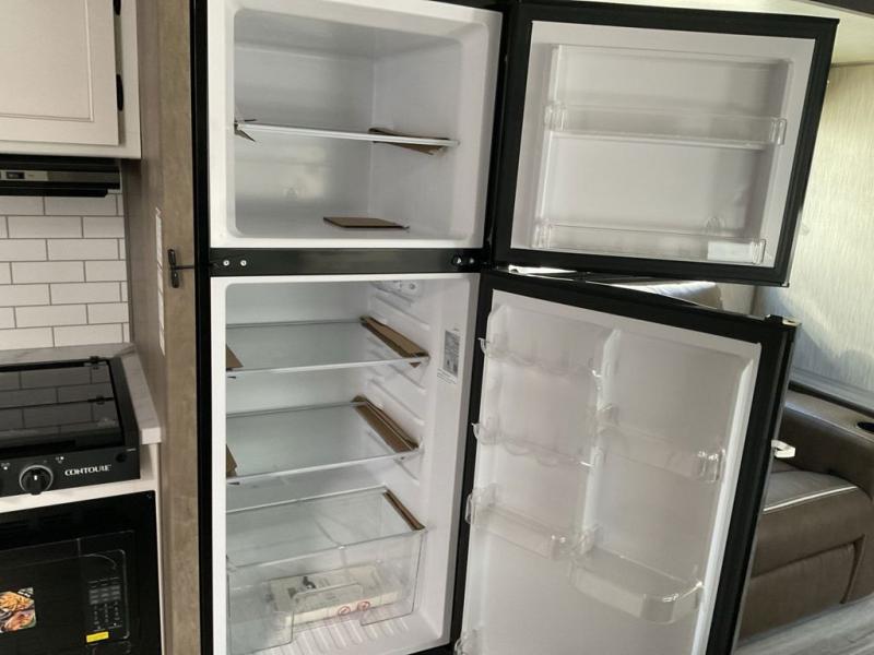 Trips to your favorite camping spot just got better in this open concept travel trailer. The large slide out houses the sofa with an end table, three burner cooktop, refrigerator, and overhead cabinet for storage. You can clean up each day in the rear corner full bath with a sliding door to save on space, and the other rear corner includes the spacious sink and counter space to prep meals. A booth dinette provides a place to dine, play games, and even let a guest sleep over. When you're ready to sleep, the queen bed up front is sure to bring a great night's rest, and there is a privacy curtain here for added convenience. You are sure to appreciate the laundry chute that allows you to throw clothes directly into the pass-through storage!