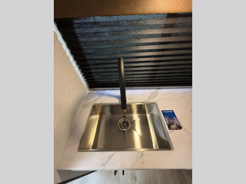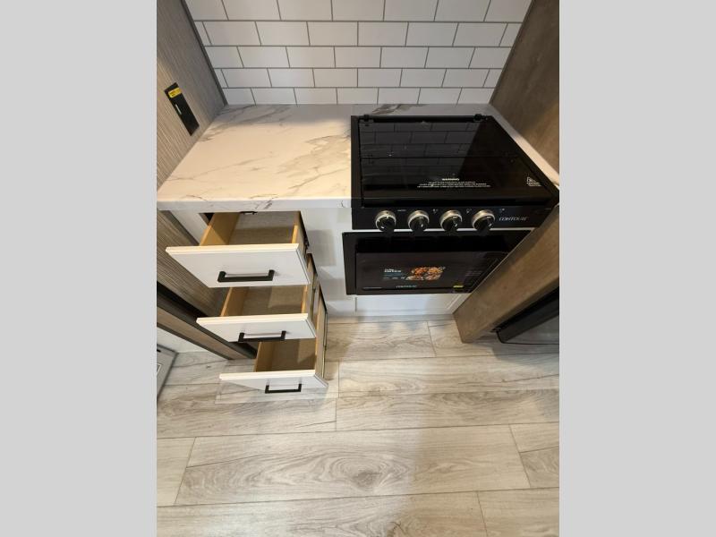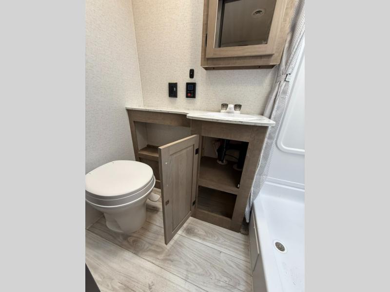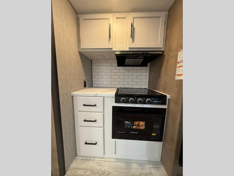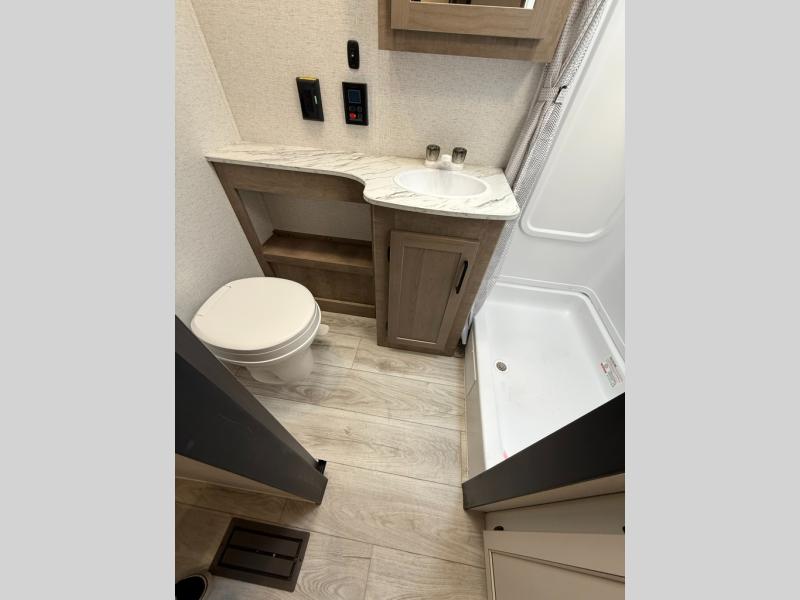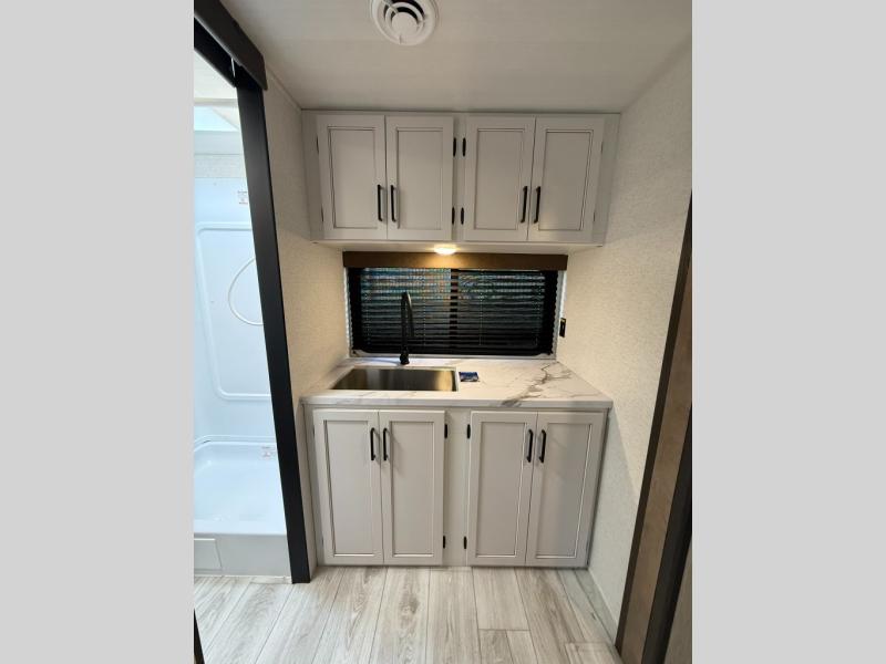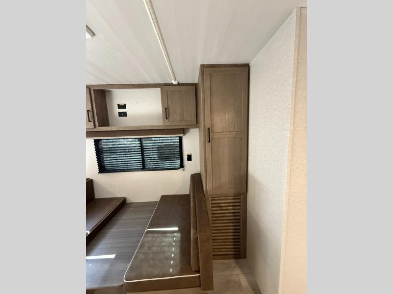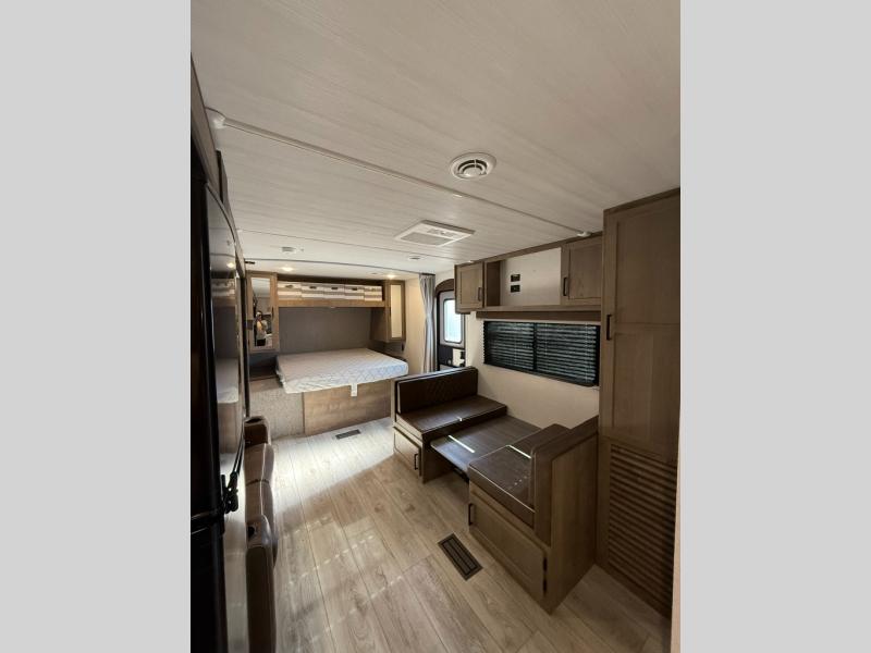 Trips to your favorite camping spot just got better in this open concept travel trailer. The large slide out houses the tri-fold sofa with an end table, three burner cooktop, refrigerator, and overhead cabinet for storage. You can clean up each day in the rear corner full bath with a sliding door to save on space, and the other rear corner includes the spacious sink and counter space to prep meals. A booth dinette provides a place to dine, play games, and even let a guest sleep over. When you're ready to sleep, the queen bed up front is sure to bring a great night's rest, and there is a privacy curtain here for added convenience. You are sure to appreciate the laundry chute that allows you to throw clothes directly into the pass-through storage!