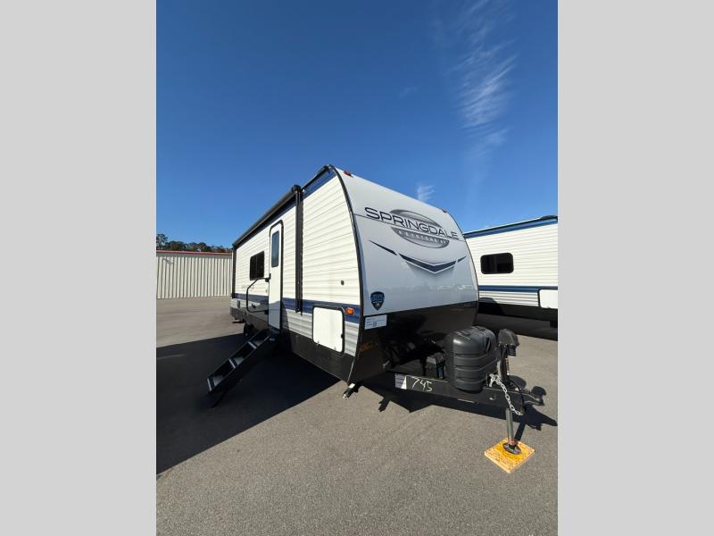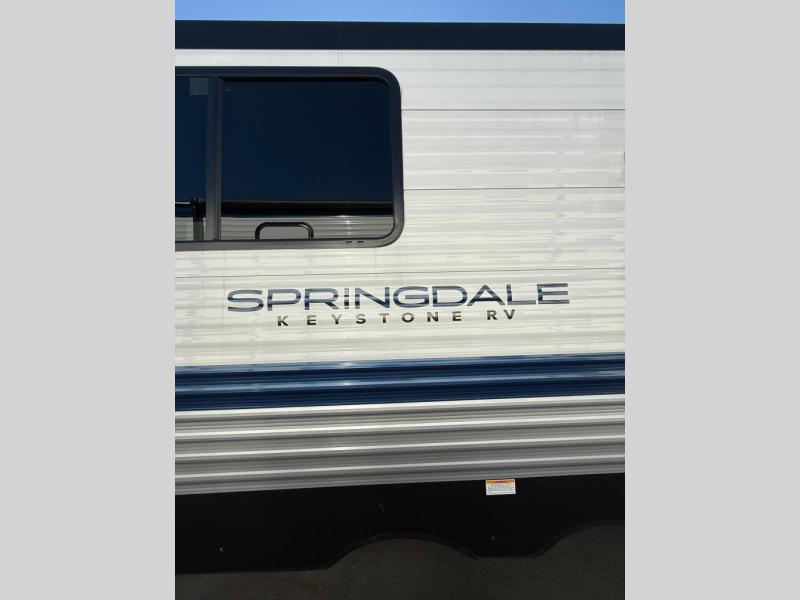 With any Springdale travel trailer by Keystone you will enjoy convenient amenities and comfortable camping features at every turn. The aluminum exterior will be easy to clean, and the power awning provides protection against the hot summer sun. There is also an exterior shower, a walkable roof, and an XL entry assist handle to safely enter and exit the unit. You will find many comforts inside, including a stainless steel sink, ample storage space for your belongings, and cozy sleeping spaces. Start a new adventure today in a Springdale travel trailer!