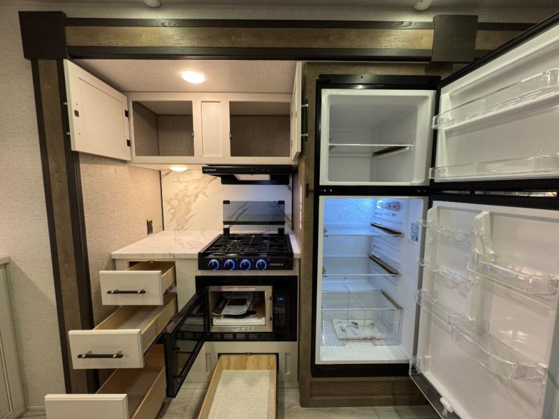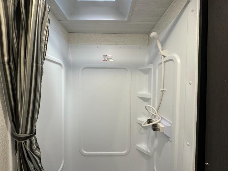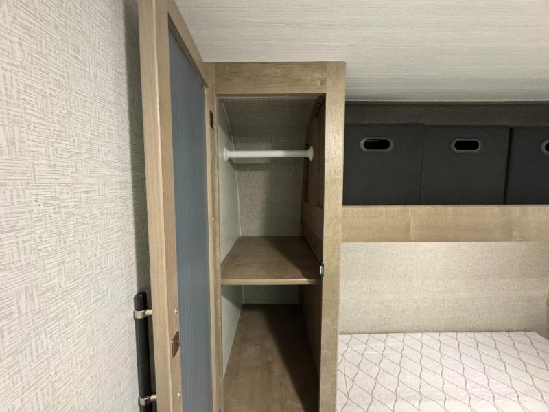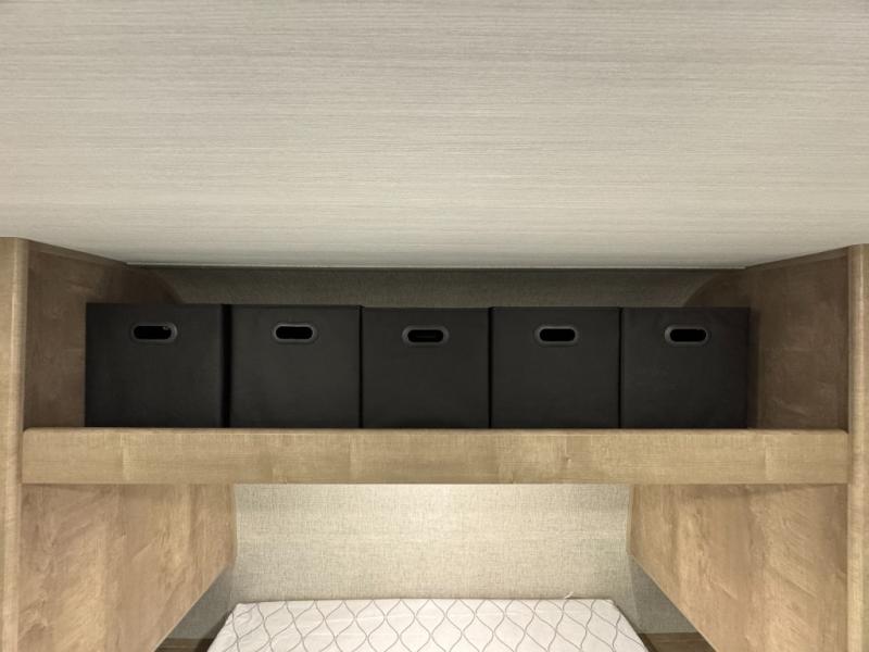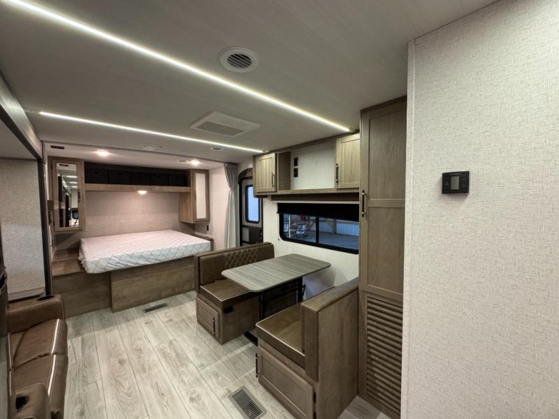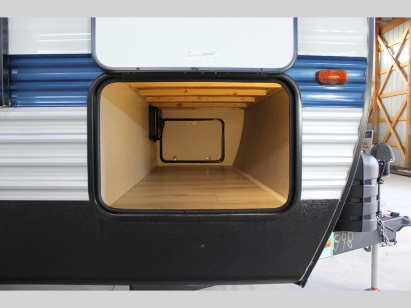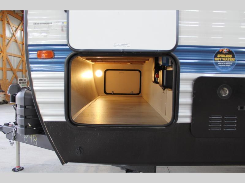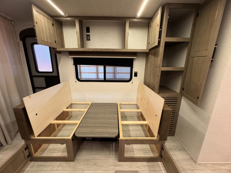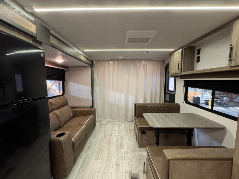 Trips to your favorite camping spot just got better in this open concept travel trailer. The large slide out houses the tri-fold sofa with an end table, three burner cooktop, refrigerator, and overhead cabinet for storage. You can clean up each day in the rear corner full bath with a sliding door to save on space, and the other rear corner includes the spacious sink and counter space to prep meals. A booth dinette provides a place to dine, play games, and even let a guest sleep over. When you're ready to sleep, the queen bed up front is sure to bring a great night's rest, and there is a privacy curtain here for added convenience. You are sure to appreciate the laundry chute that allows you to throw clothes directly into the pass-through storage!