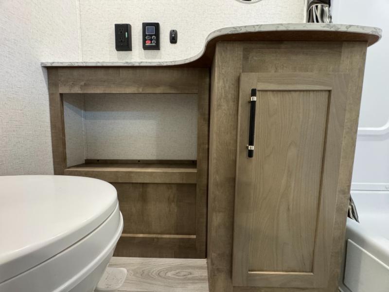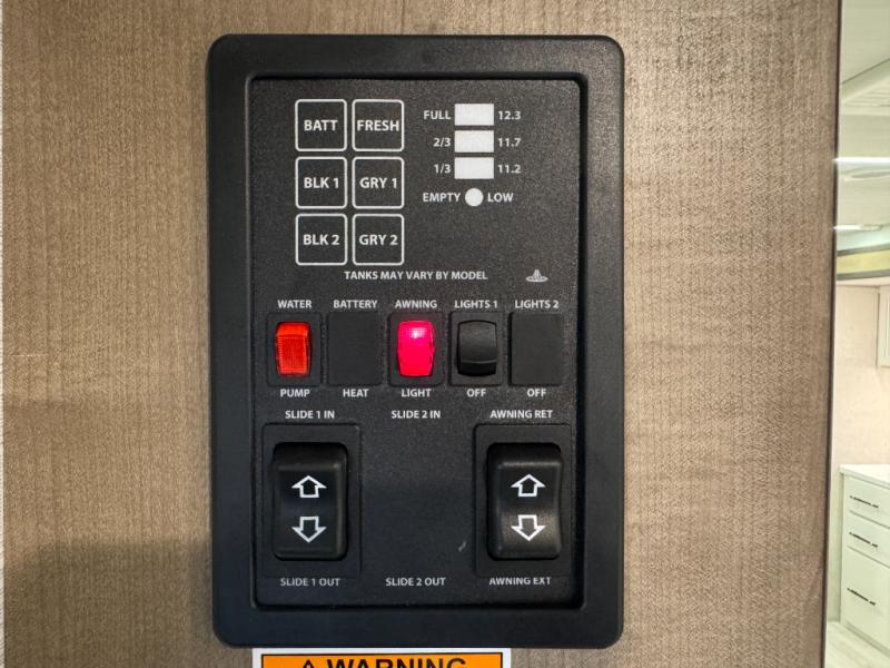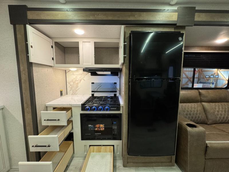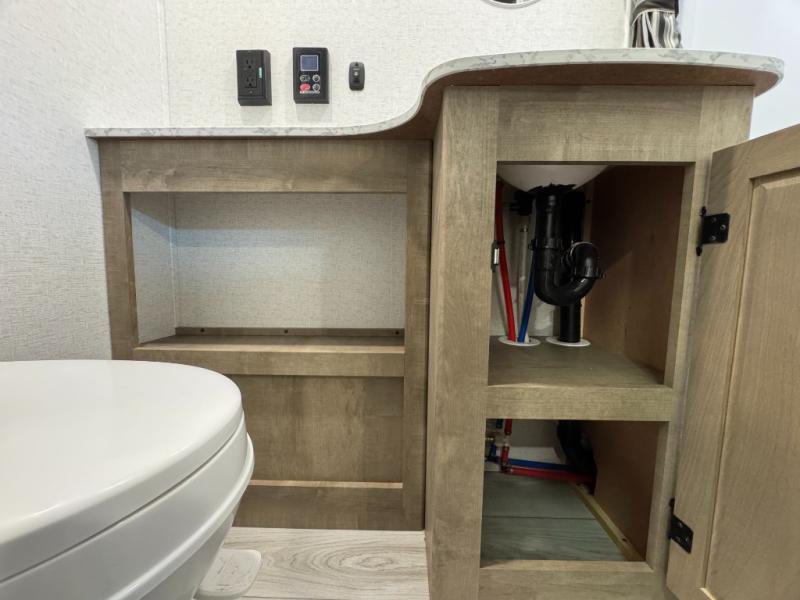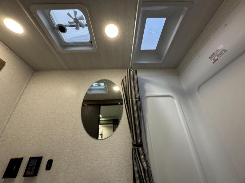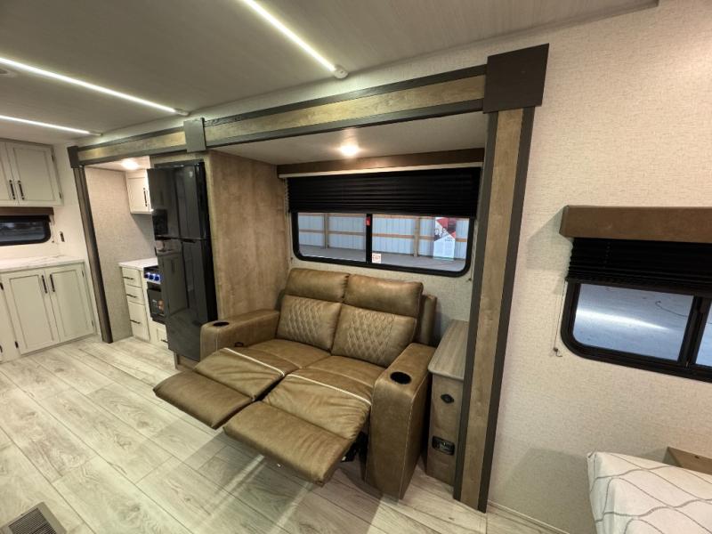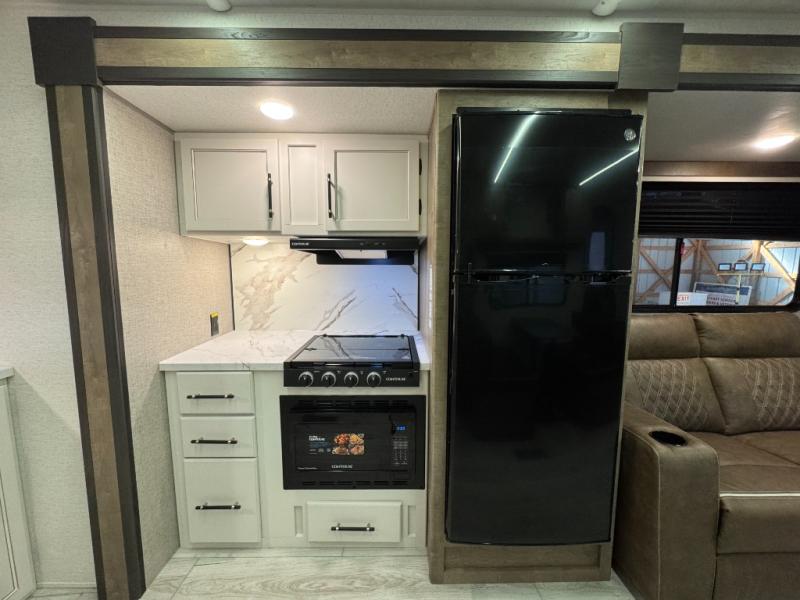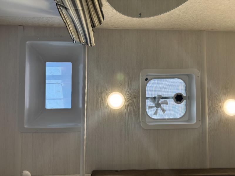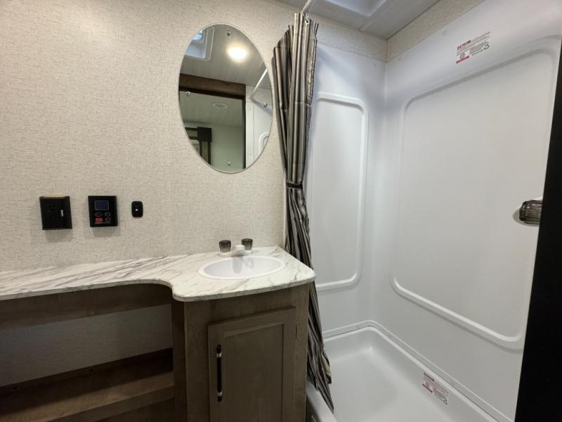 Trips to your favorite camping spot just got better in this open concept travel trailer. The large slide out houses the tri-fold sofa with an end table, three burner cooktop, refrigerator, and overhead cabinet for storage. You can clean up each day in the rear corner full bath with a sliding door to save on space, and the other rear corner includes the spacious sink and counter space to prep meals. A booth dinette provides a place to dine, play games, and even let a guest sleep over. When you're ready to sleep, the queen bed up front is sure to bring a great night's rest, and there is a privacy curtain here for added convenience. You are sure to appreciate the laundry chute that allows you to throw clothes directly into the pass-through storage!