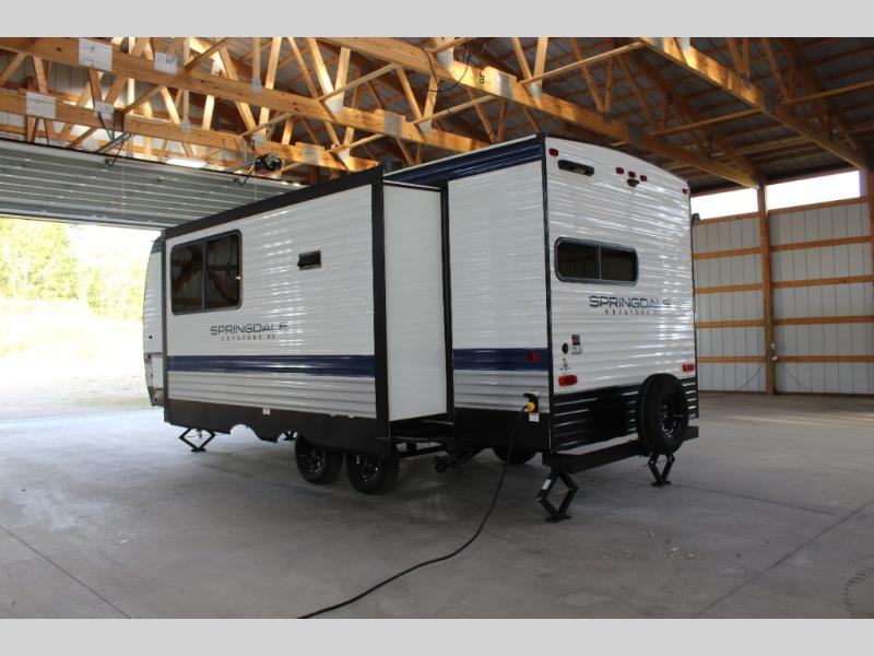 With any Springdale travel trailer by Keystone you will enjoy convenient amenities and comfortable camping features at every turn. The aluminum exterior will be easy to clean, and the power awning provides protection against the hot summer sun. There is also an exterior shower, a walkable roof, and an XL entry assist handle to safely enter and exit the unit. You will find many comforts inside, including a stainless steel sink, ample storage space for your belongings, and cozy sleeping spaces. Start a new adventure today in a Springdale travel trailer!
