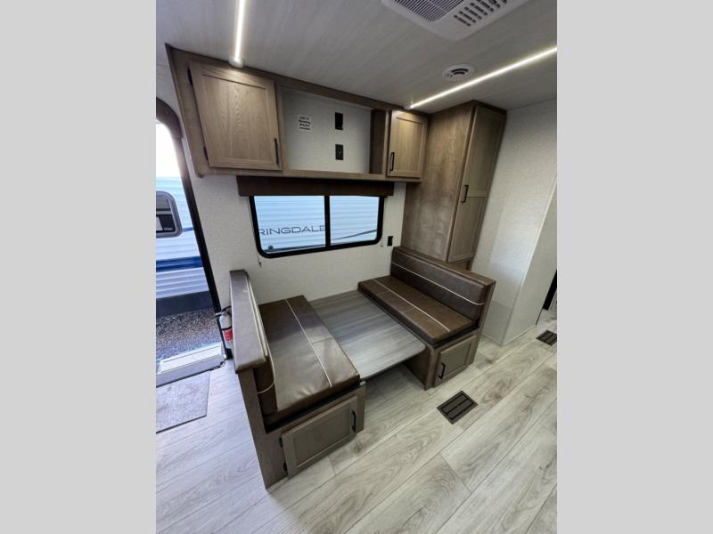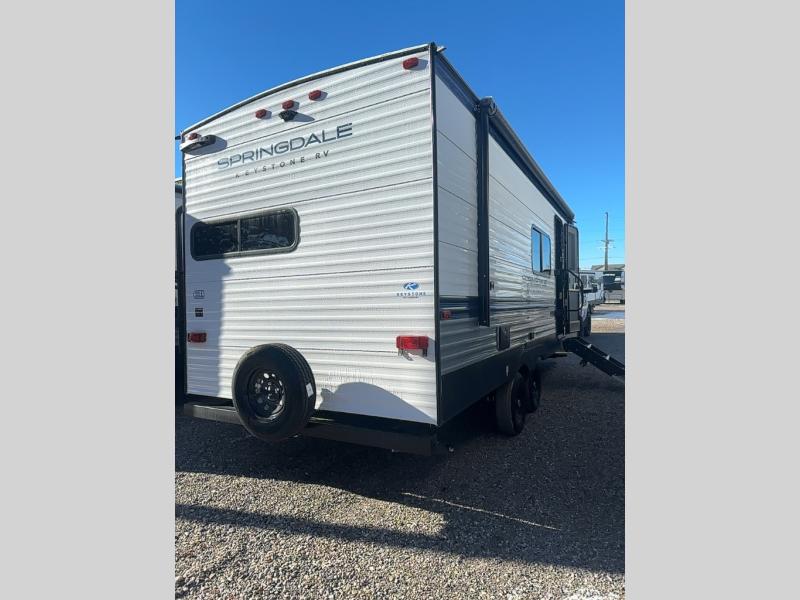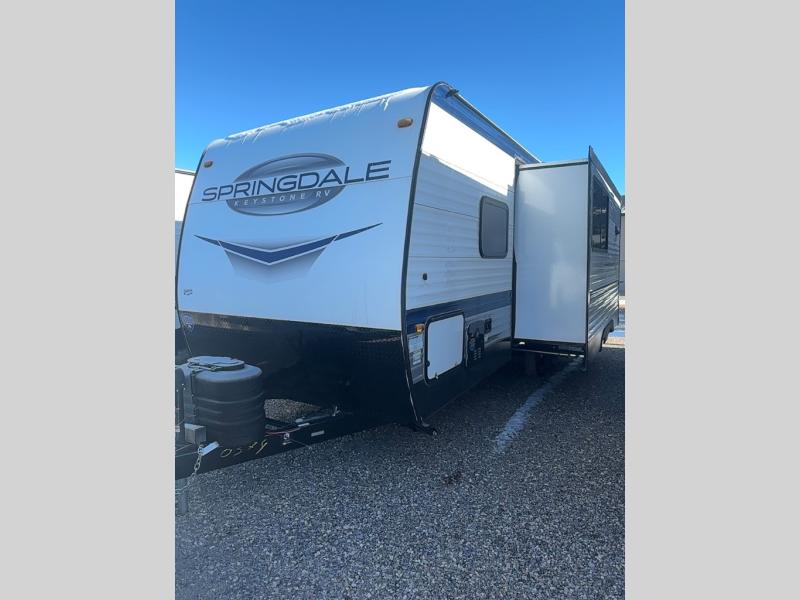 With any Springdale travel trailer by Keystone you will enjoy convenient amenities and comfortable camping features at every turn. The aluminum exterior will be easy to clean, and the power awning provides protection against the hot summer sun. There is also an exterior shower, a walkable roof, and an XL entry assist handle to safely enter and exit the unit. You will find many comforts inside, including a stainless steel sink, ample storage space for your belongings, and cozy sleeping spaces. Start a new adventure today in a Springdale travel trailer!