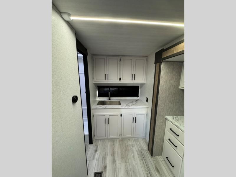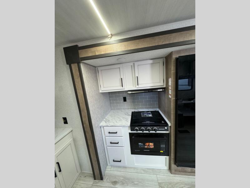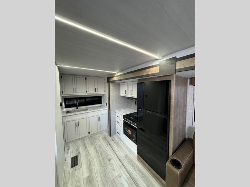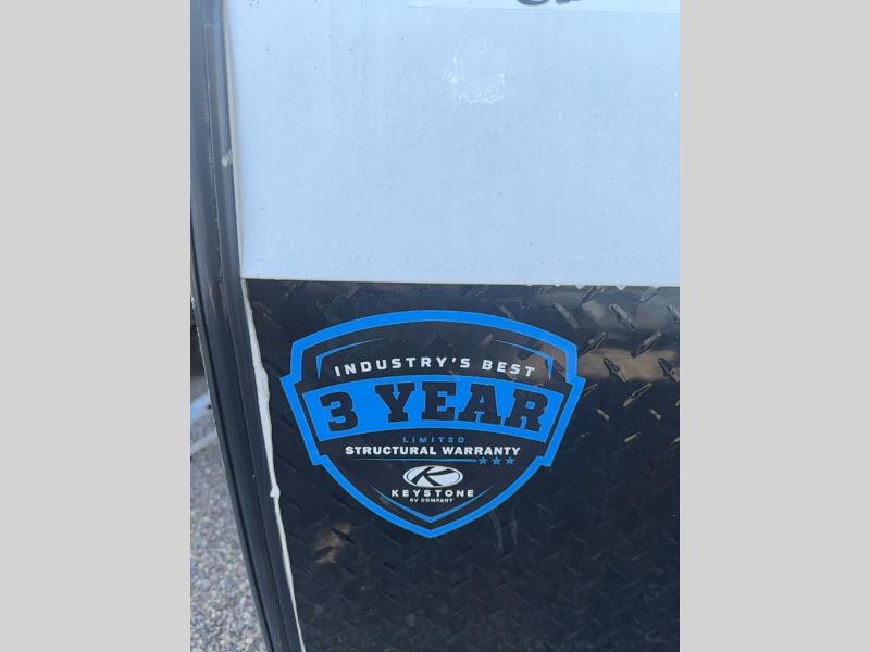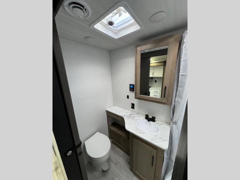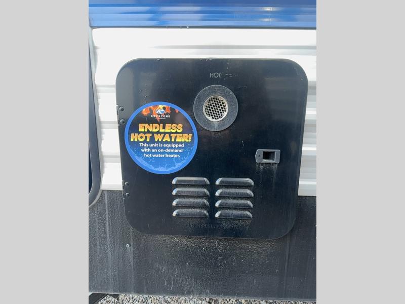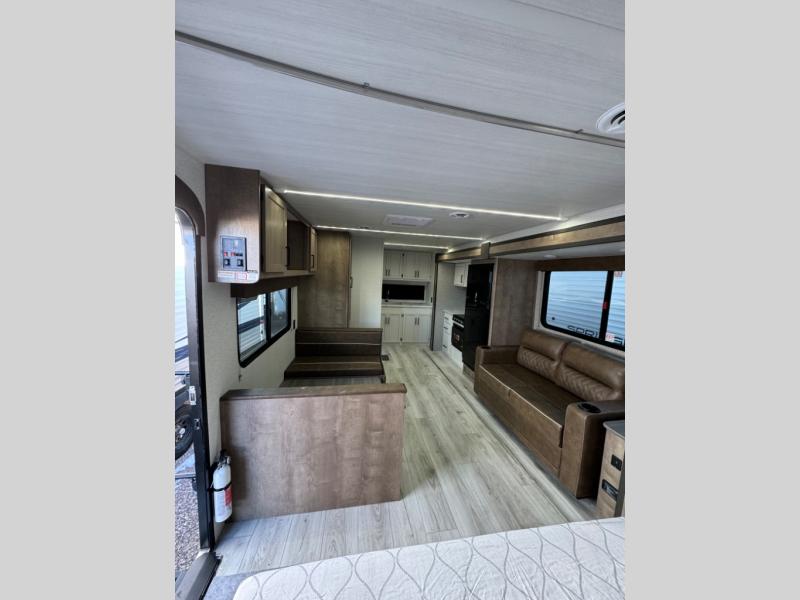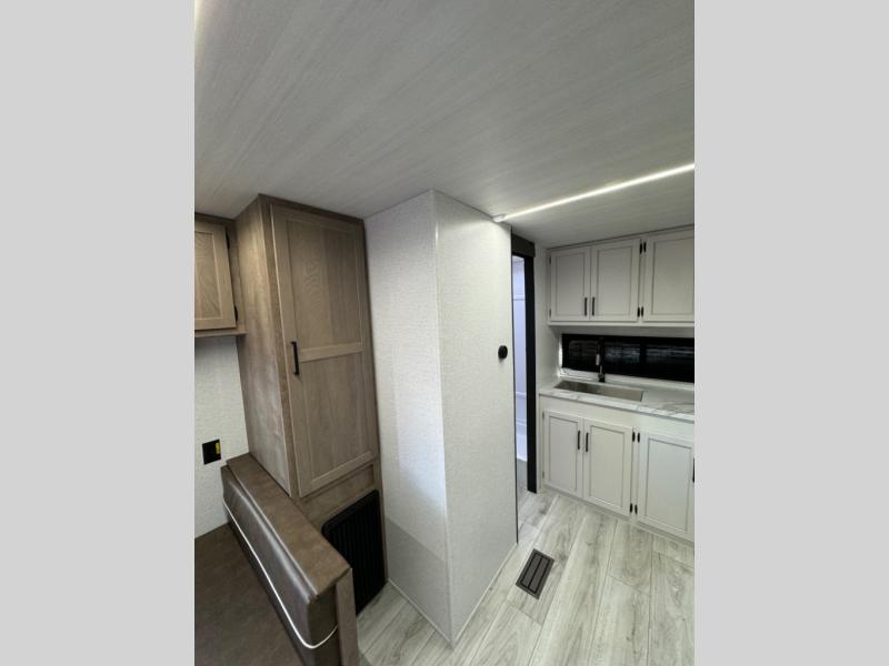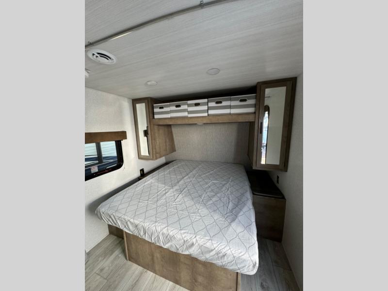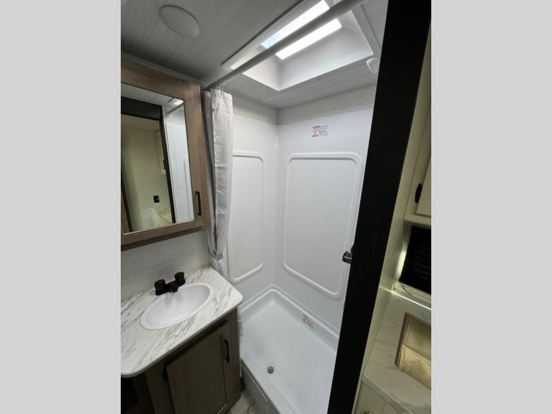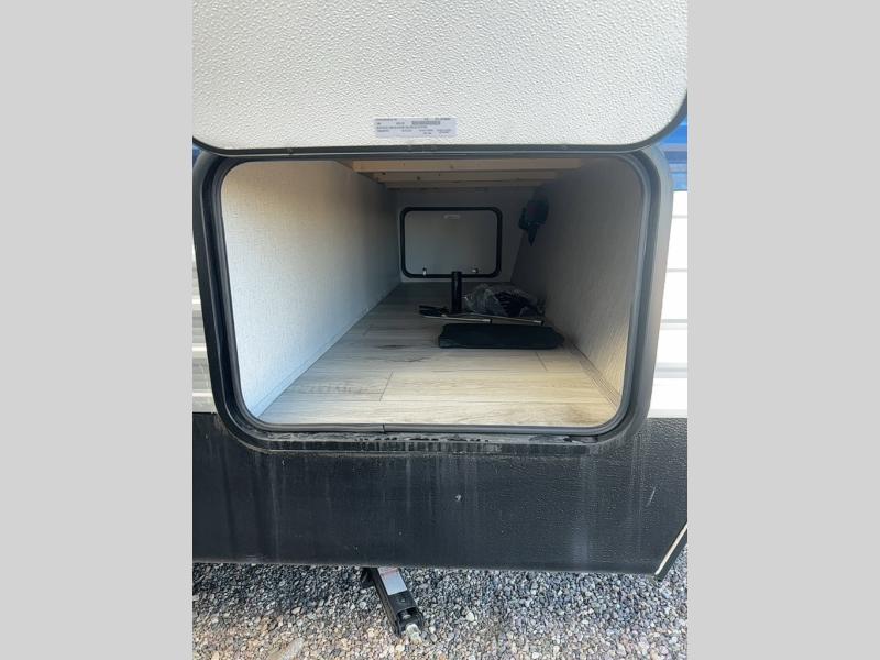 Trips to your favorite camping spot just got better in this open concept travel trailer. The large slide out houses the tri-fold sofa with an end table, three burner cooktop, refrigerator, and overhead cabinet for storage. You can clean up each day in the rear corner full bath with a shower skylight and a sliding door to save on space, and the other rear corner includes the spacious sink and counter space to prep meals. A booth dinette provides a place to dine, play games, and even let a guest sleep over. When you're ready to sleep, the queen bed up front is sure to bring a great night's rest, and there is a privacy curtain here for added convenience. You are sure to appreciate the laundry chute that allows you to throw clothes directly into the pass-through storage!