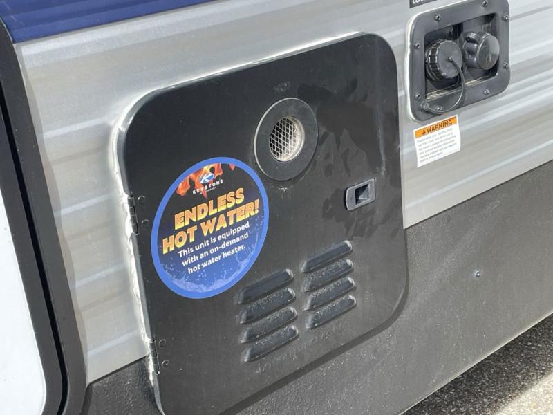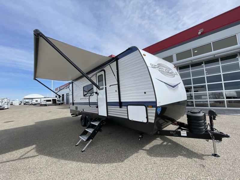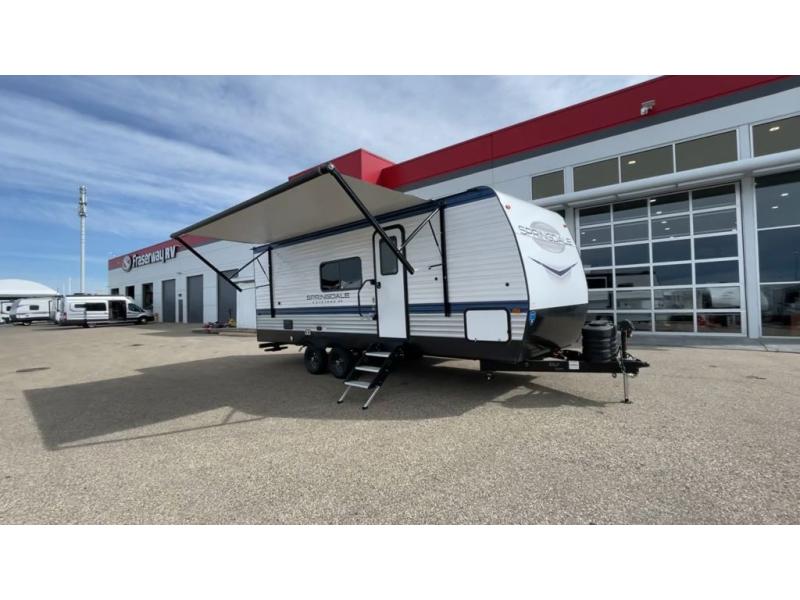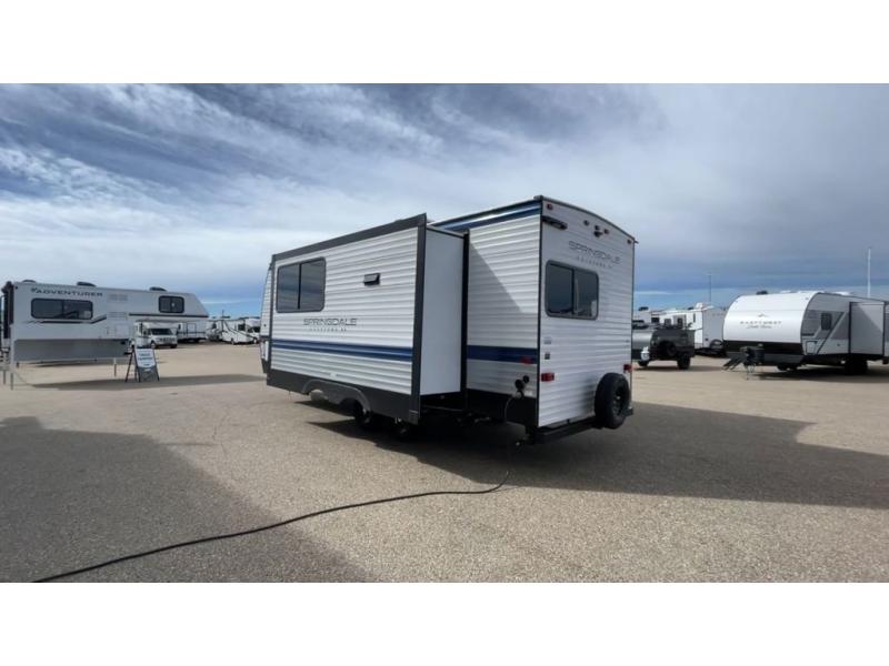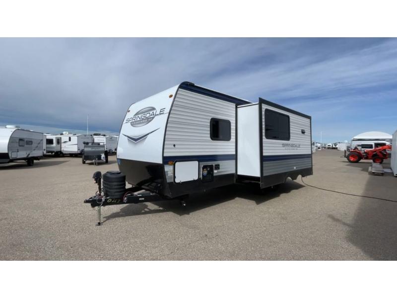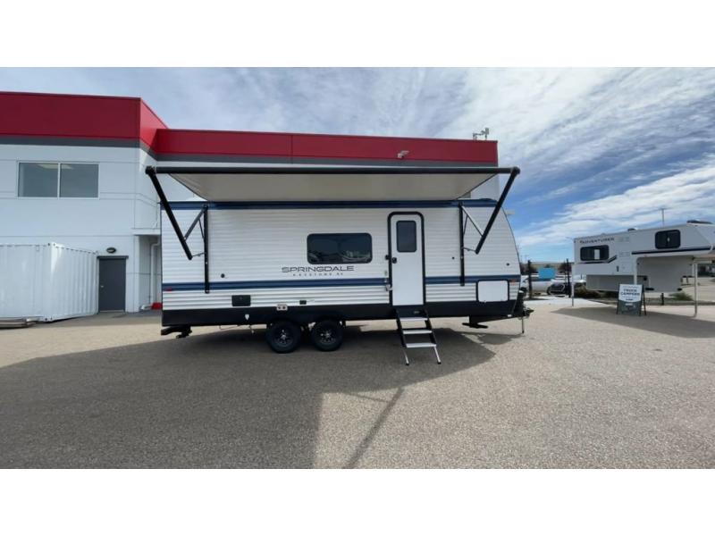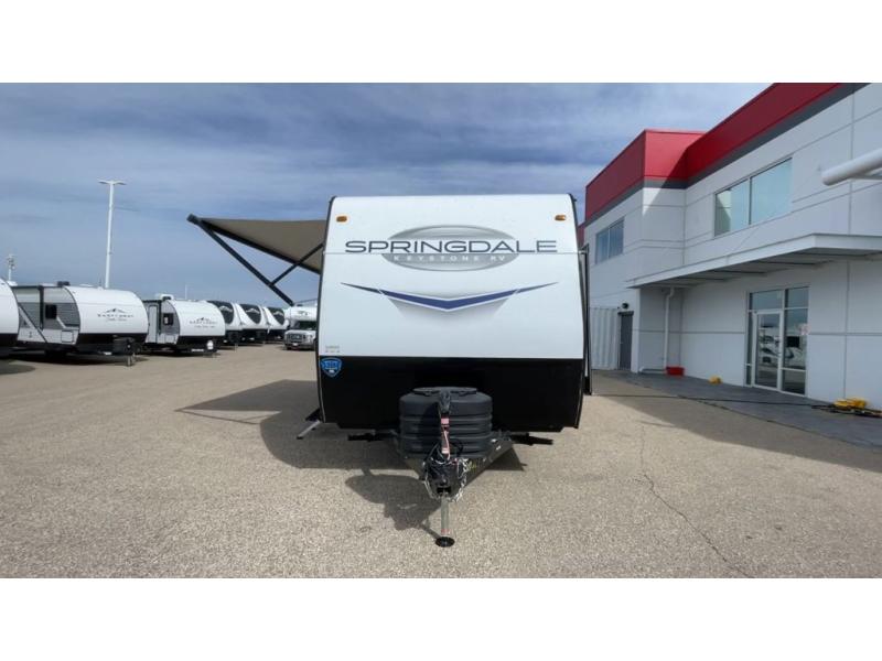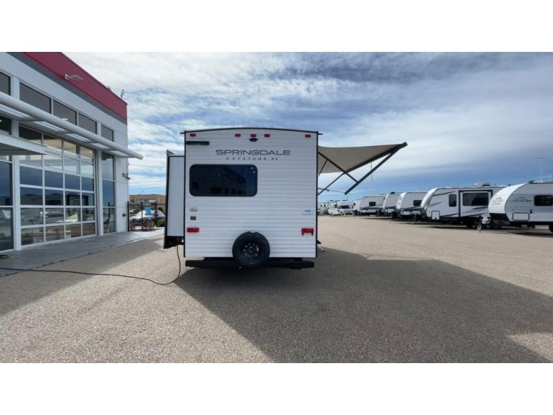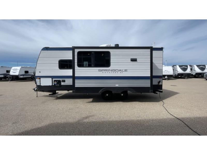 With any Springdale travel trailer by Keystone you will enjoy convenient amenities and comfortable camping features at every turn. The aluminum exterior will be easy to clean, and the power awning provides protection against the hot summer sun. There is also an exterior shower, a walkable roof, and an XL entry assist handle to safely enter and exit the unit. You will find many comforts inside, including a stainless steel sink, ample storage space for your belongings, and cozy sleeping spaces. Start a new adventure today in a Springdale travel trailer!