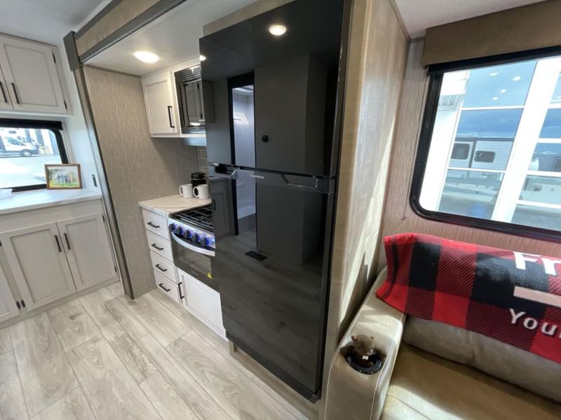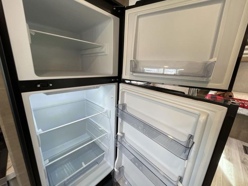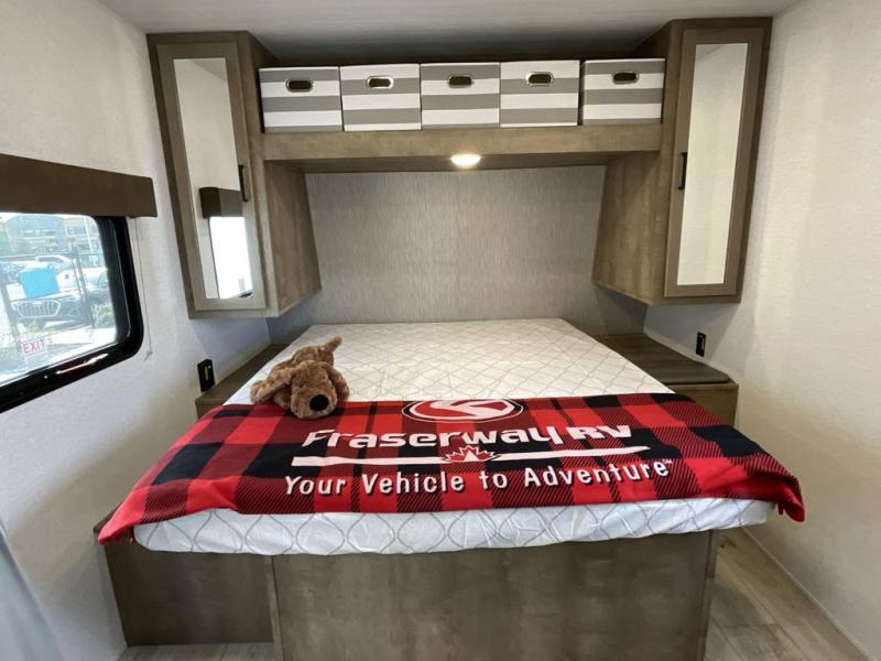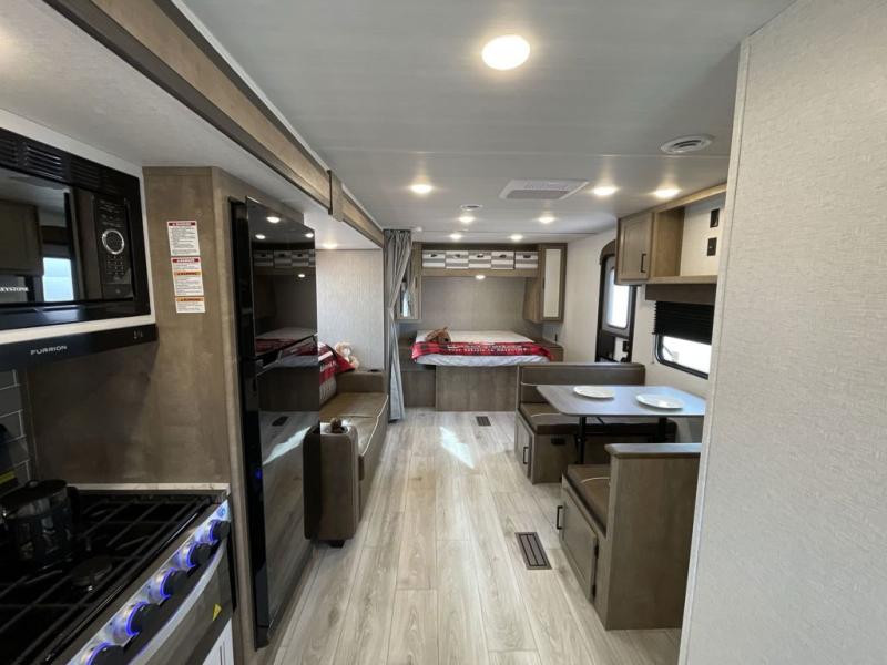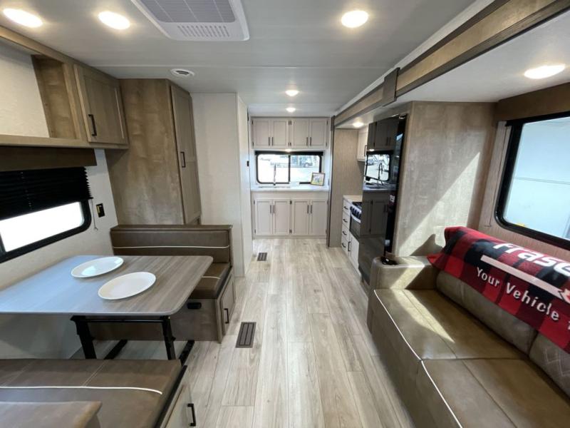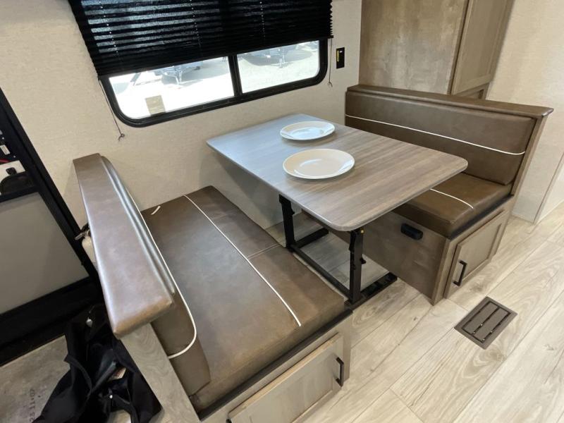 Trips to your favorite camping spot just got better in this open concept travel trailer. The large slide out houses the tri-fold sofa with an end table, three burner cooktop, refrigerator, and overhead cabinet for storage. You can clean up each day in the rear corner full bath with a shower skylight and a sliding door to save on space, and the other rear corner includes the spacious sink and counter space to prep meals. A booth dinette provides a place to dine, play games, and even let a guest sleep over. When you're ready to sleep, the queen bed up front is sure to bring a great night's rest, and there is a privacy curtain here for added convenience. You are sure to appreciate the laundry chute that allows you to throw clothes directly into the pass-through storage!