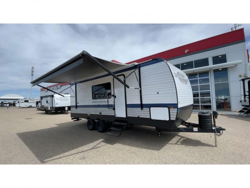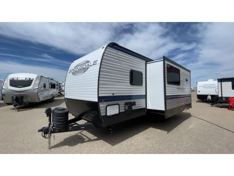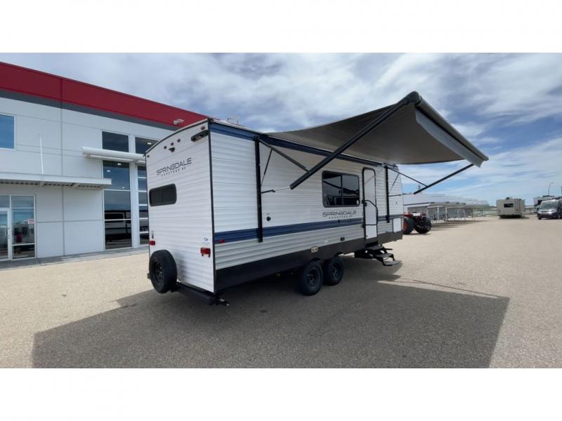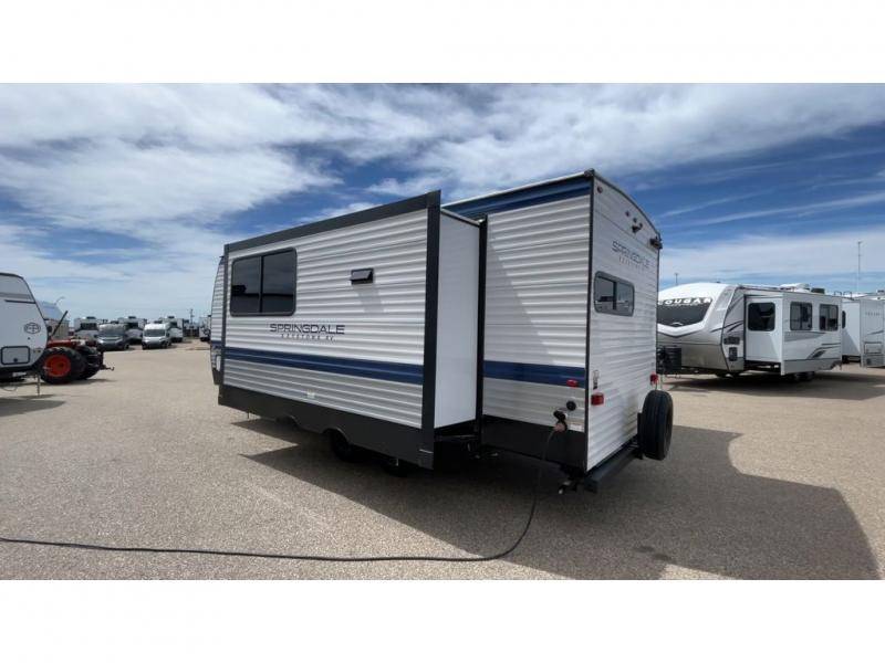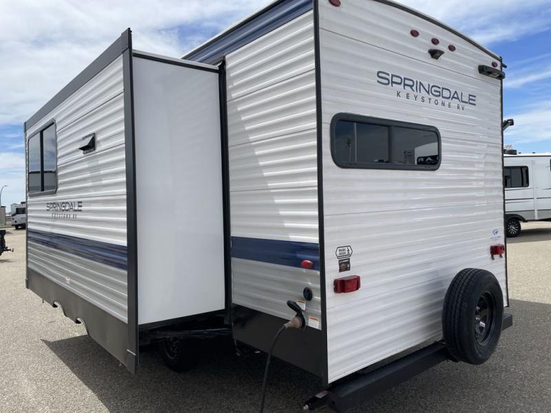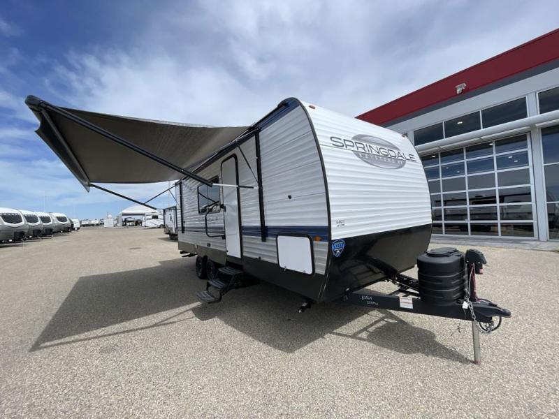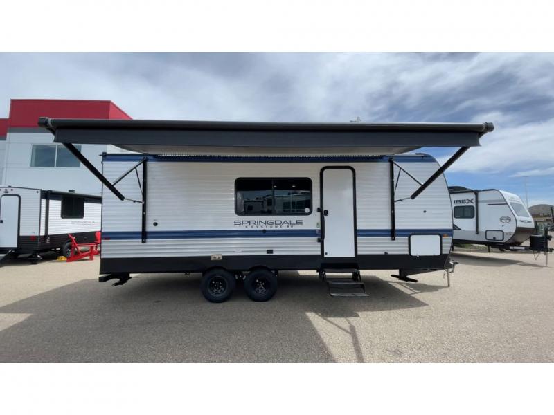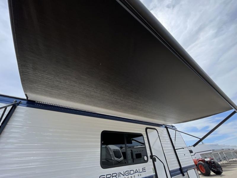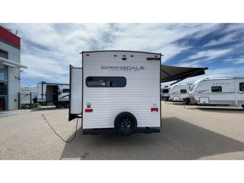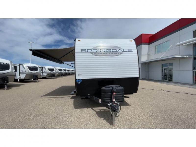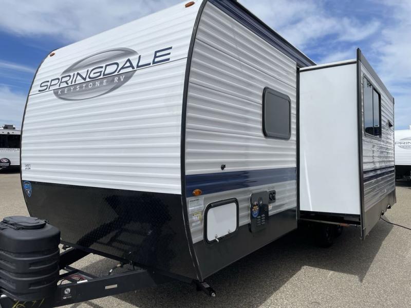 With any Springdale travel trailer by Keystone you will enjoy convenient amenities and comfortable camping features at every turn. The aluminum exterior will be easy to clean, and the power awning provides protection against the hot summer sun. There is also an exterior shower, a walkable roof, and an XL entry assist handle to safely enter and exit the unit. You will find many comforts inside, including a stainless steel sink, ample storage space for your belongings, and cozy sleeping spaces. Start a new adventure today in a Springdale travel trailer!
